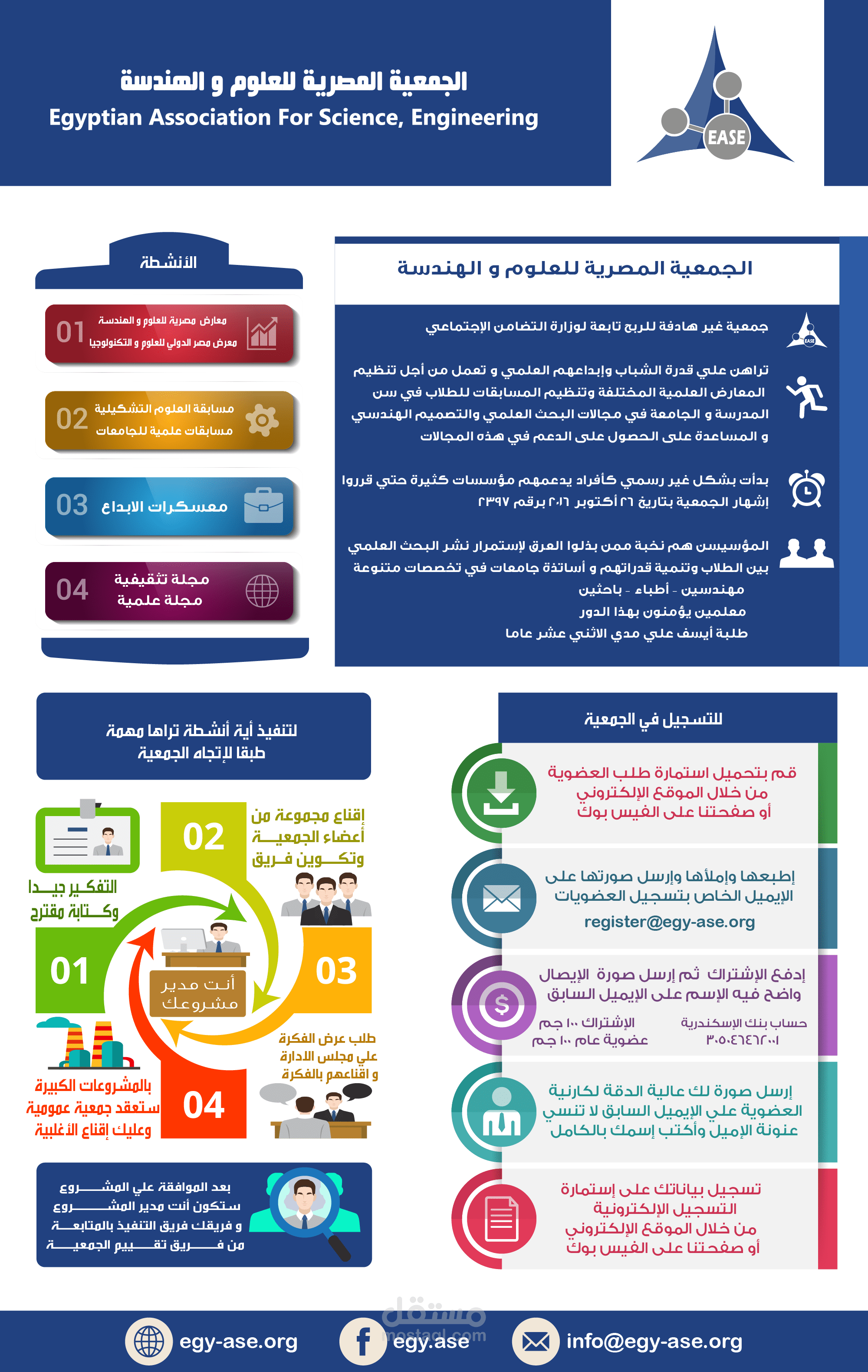 انفوجرافيك تعريفي - الجمعية المصرية للعلوم و الهندسة و يحتوي التصميم على عناصر انفوجرافيكو ايقونات و التصميم متناسق الالوان مع لون الشعار و يتميز بالبساطة و الوضوح