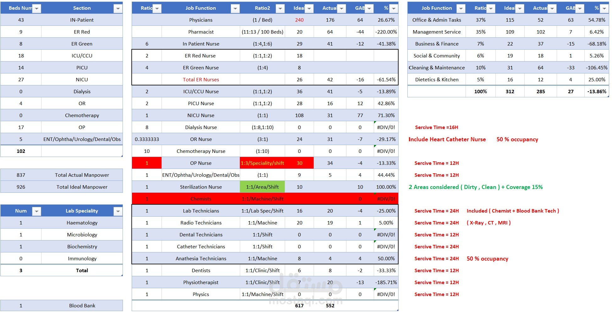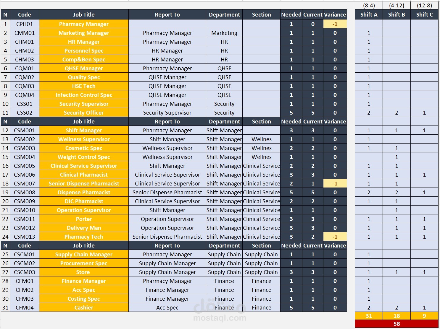 خطة عمالة تم إعدادهها على إكسيل شيت (Excel Sheet) تم حسابها من خلال معادلات ومعايير وتم إعداد الملف بطريقة سلسة يمكن تخصيصها
