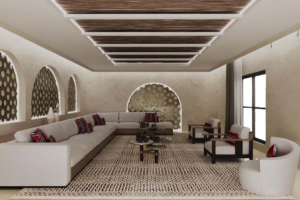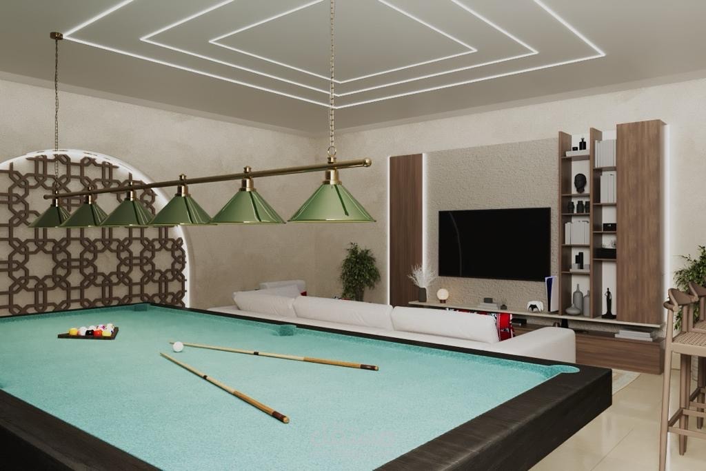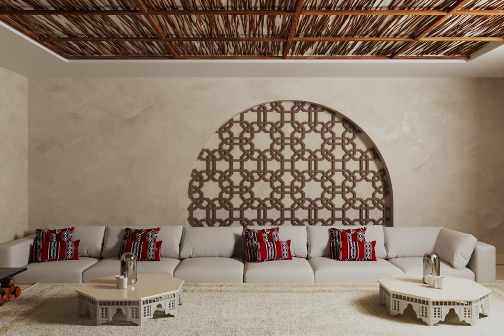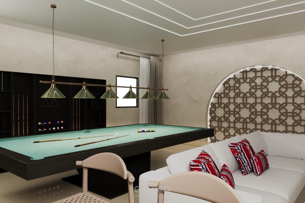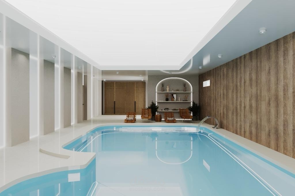 تصميم داخلي لاستراحة عبارة عن مجلس نساء - حمام سباحة داخلي - غرفة مشب حطب - مطبخ الاستراحة - غرفة الطعام - غرفة الترفيه - غرفة نوم - مجلس الرجال.