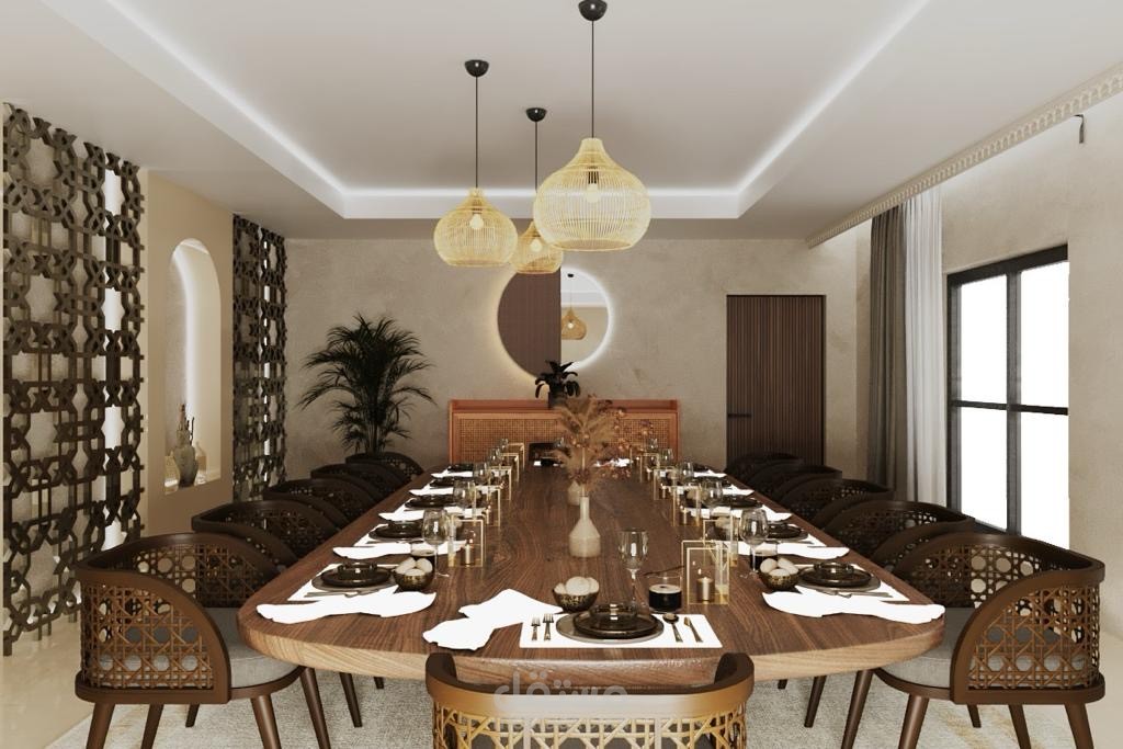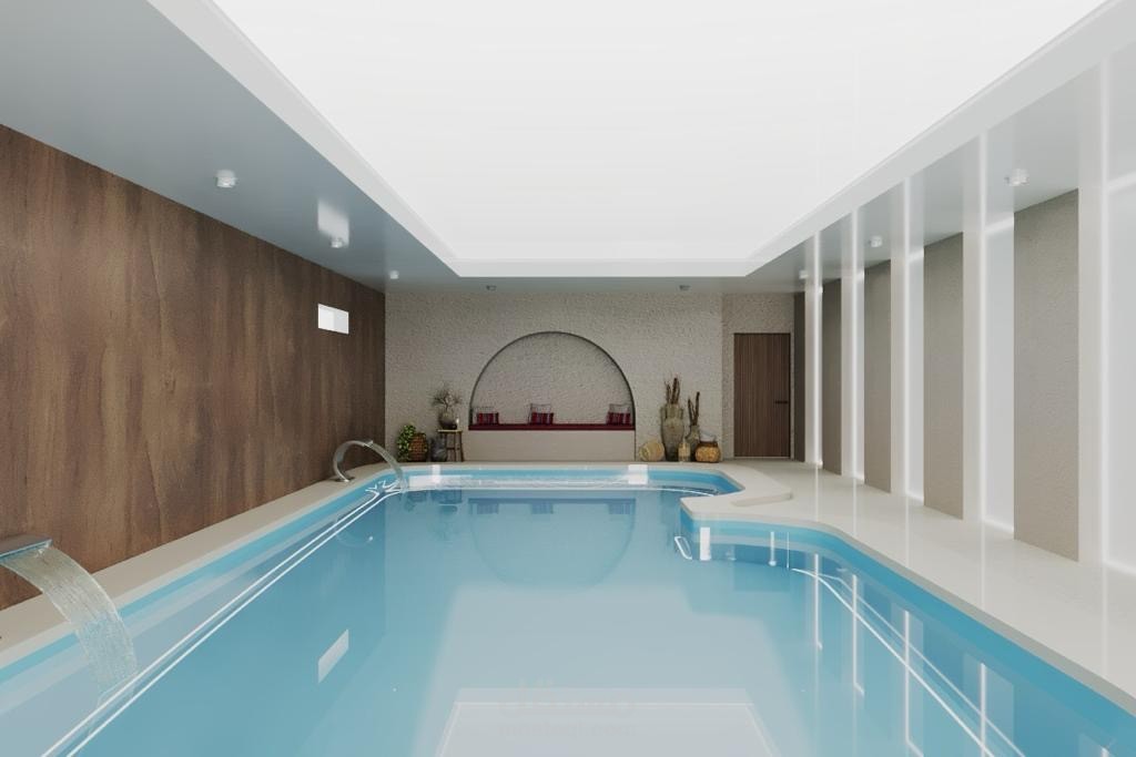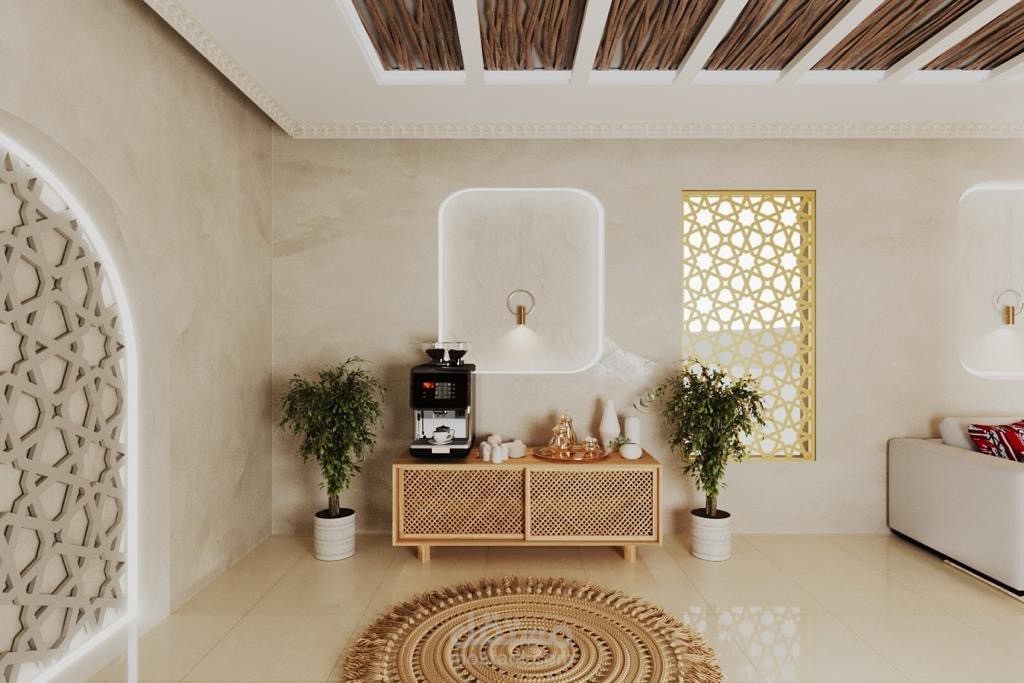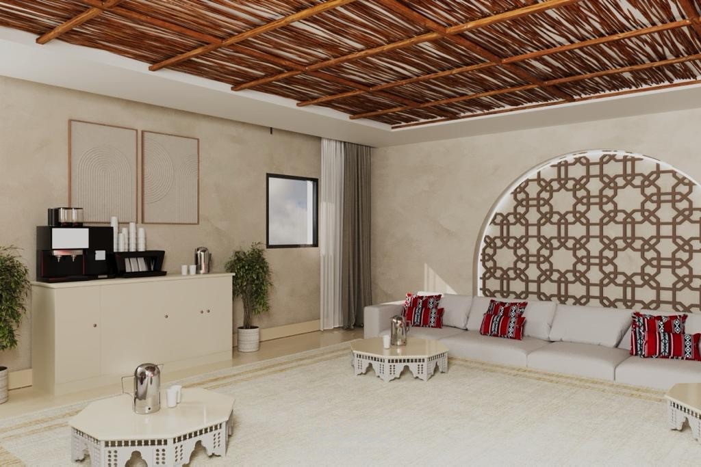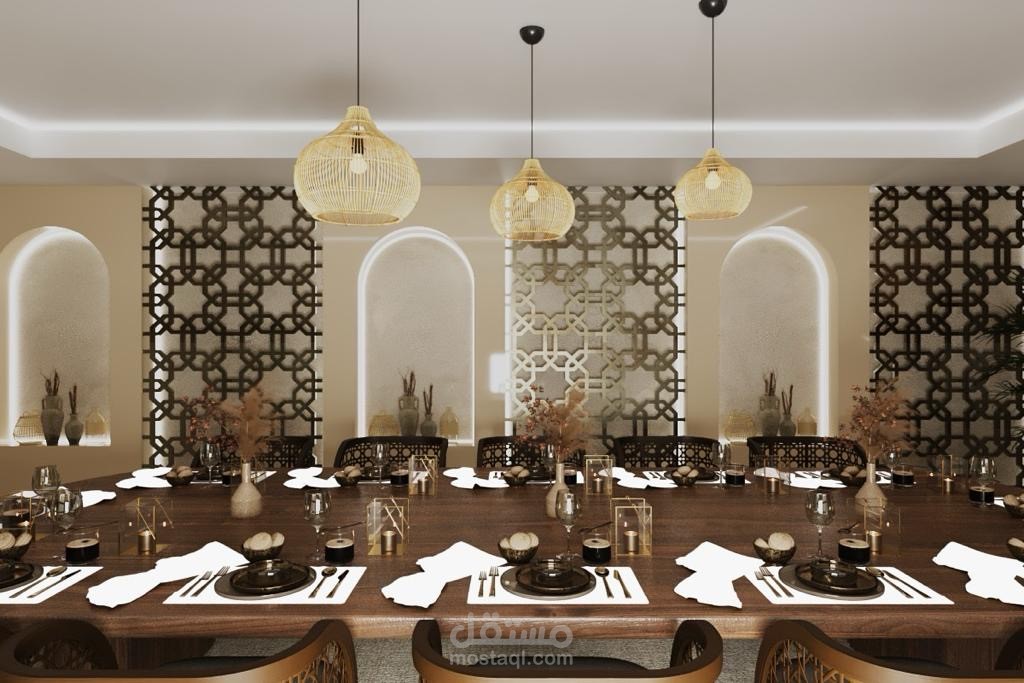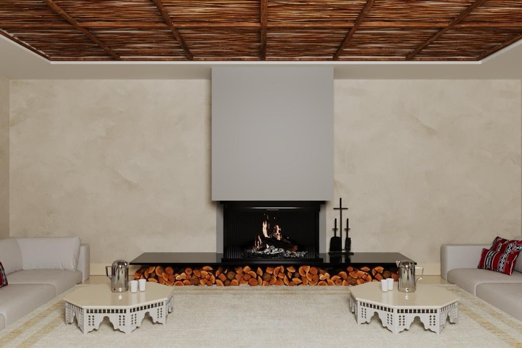 تصميم داخلي لاستراحة عبارة عن مجلس نساء - حمام سباحة داخلي - غرفة مشب حطب - مطبخ الاستراحة - غرفة الطعام - غرفة الترفيه - غرفة نوم - مجلس الرجال.
