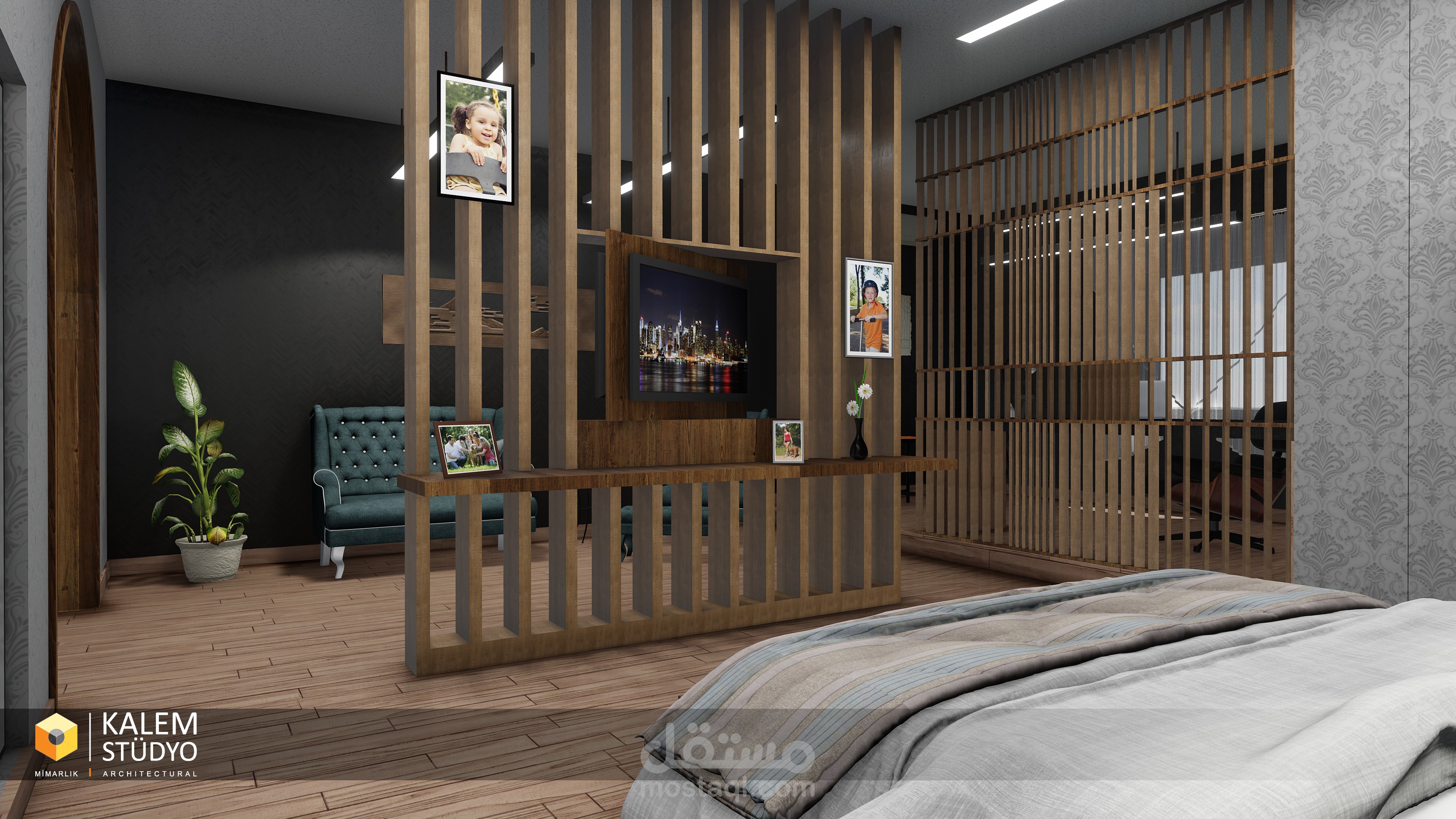 تصميم غرفة نوم ماستر مع فراغ للعمل داخل الغرفة