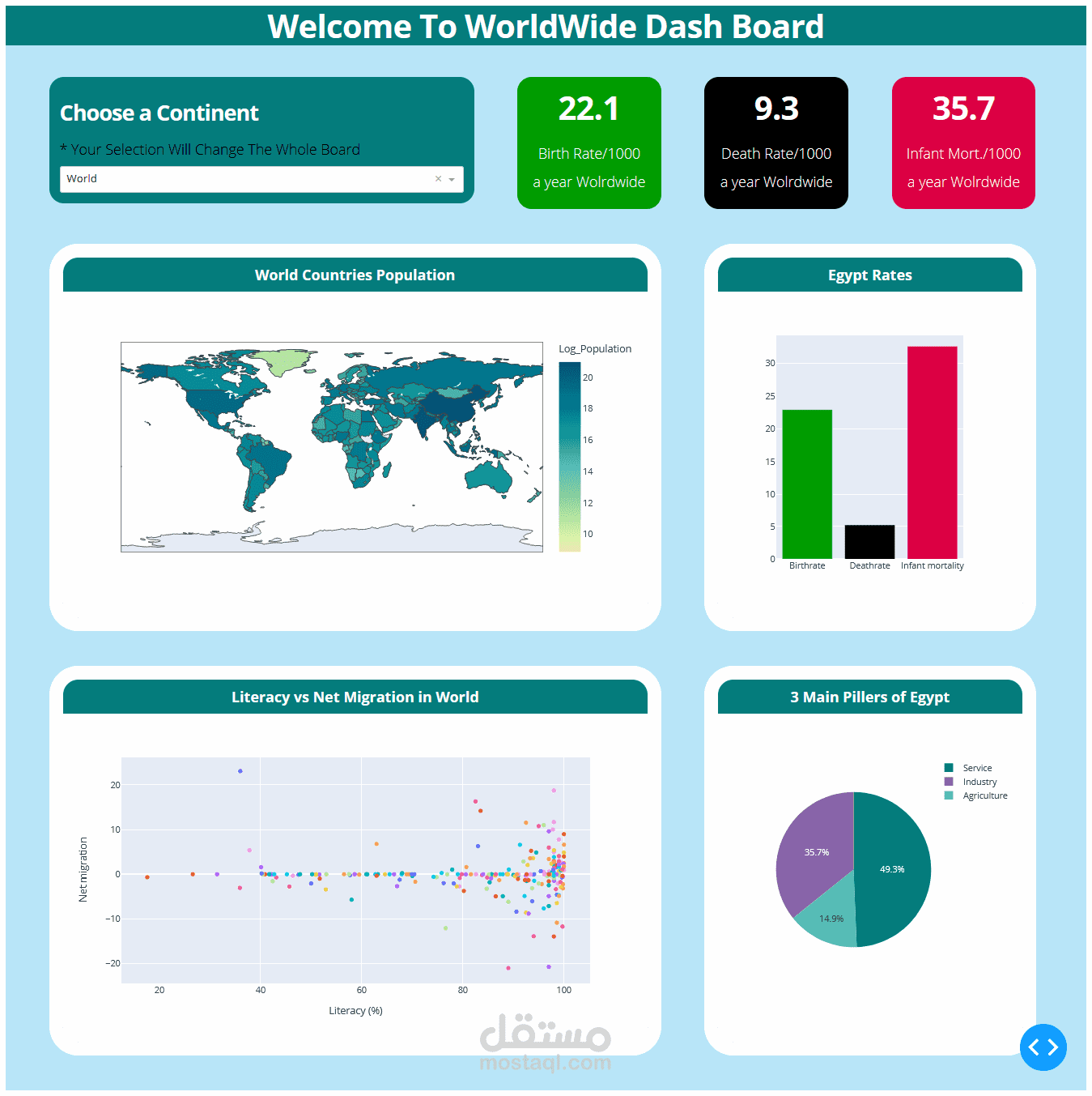 داش بورد تفاعلية تعرض كل الاحصائيات الخاصة بالقارات والدول حول العالم مثل: معدل المواليد، معدل الوفيات، نسبة الزراعة والصناعة والخدمات ومعدلات الهجرة .. إلخ، وذلك عن طريق اختيار القارة أو الوقوف على دولة معينة على خريطة العالم