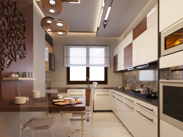 كان المطلوب عمل تخديم كامل للمطبخ ذو المساحة الصغيرة ولكن بناء على طلب العميل بأن تكون طاولة الطعام بداخلة دون انزعاج خلال مسارات الحركة فكان التصميم يشمل على طاولة قابلة للطي بع الاستخدام وبنفس الوقت تعطي ديكور جميل لعنصر الحائط الجانبي دون إعاقة لمسارات الحركة ولإضافة حزم ضوئية مرتدة من الشباك للإضاءة النهارية تم عمل خزن المطبخ باللون الفاتح الجلوسي للاستفادة من الأضاءة النهارية دون إشعال الإنارة