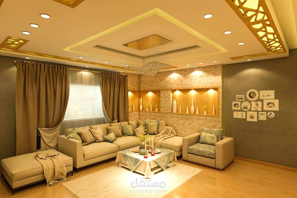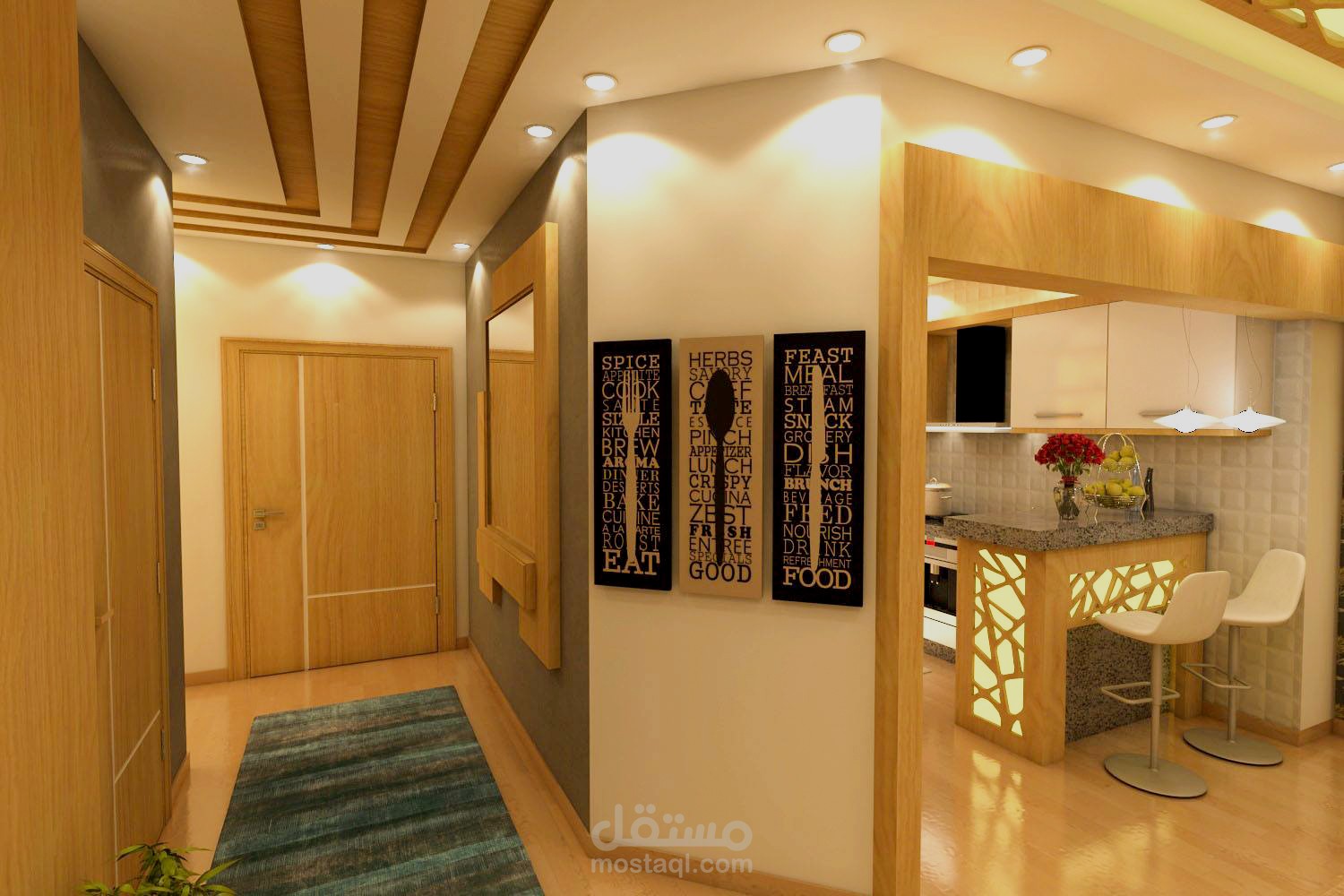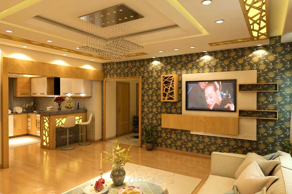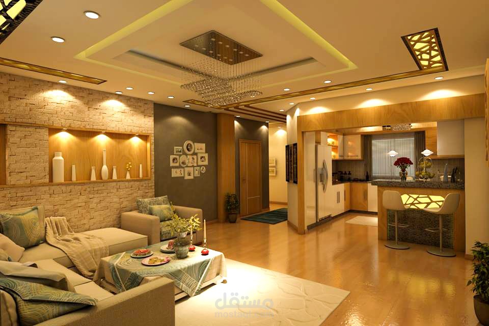صالون مع مطبخ ومدخل وبعض التفاصيل والتصميم اللازم والجذاب والراقي فيها وكيفة اختيار الاألوان المناسبة للعمر والفئة