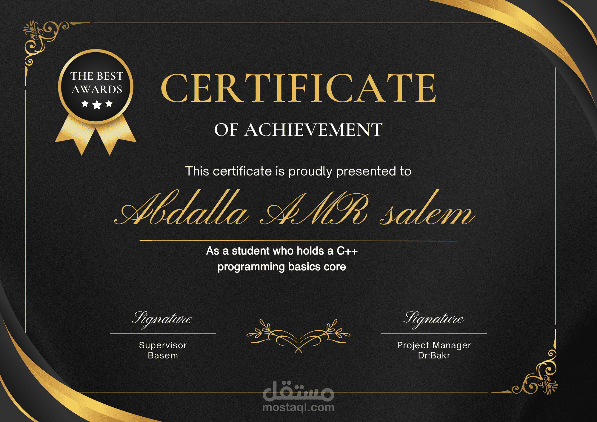 استلام شهادة تقدير بسبب الانتهاء من كورس ++C عام 2022