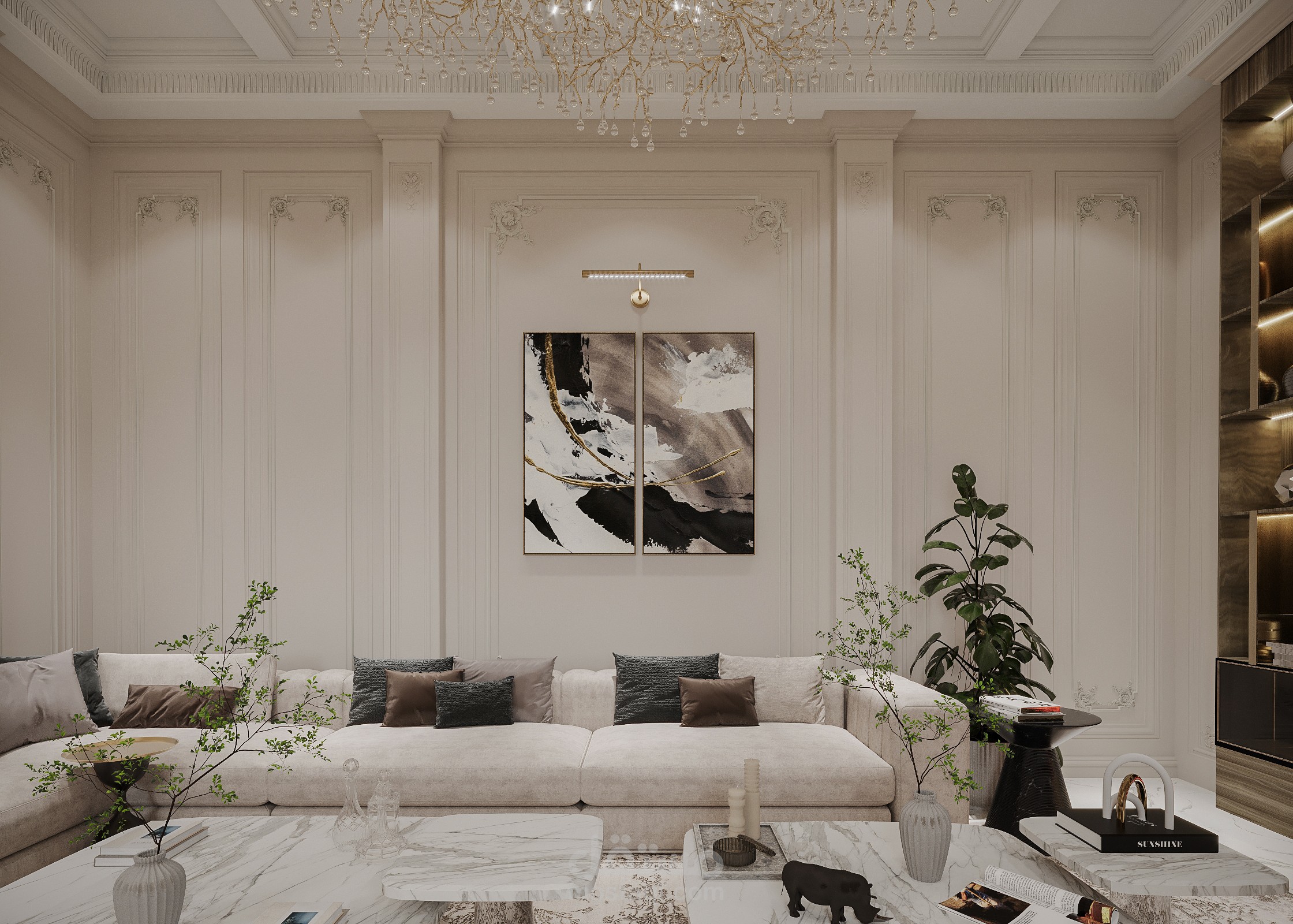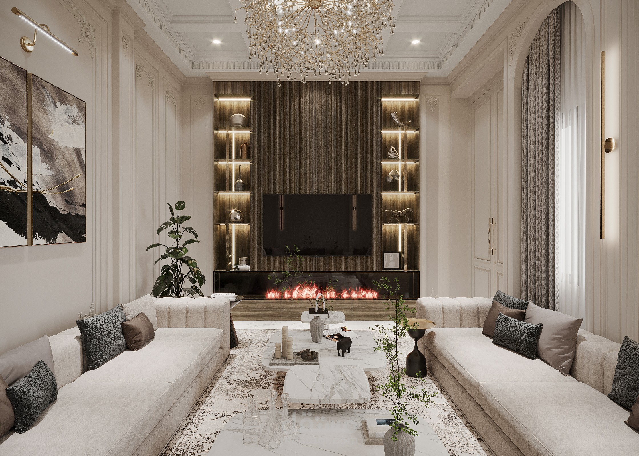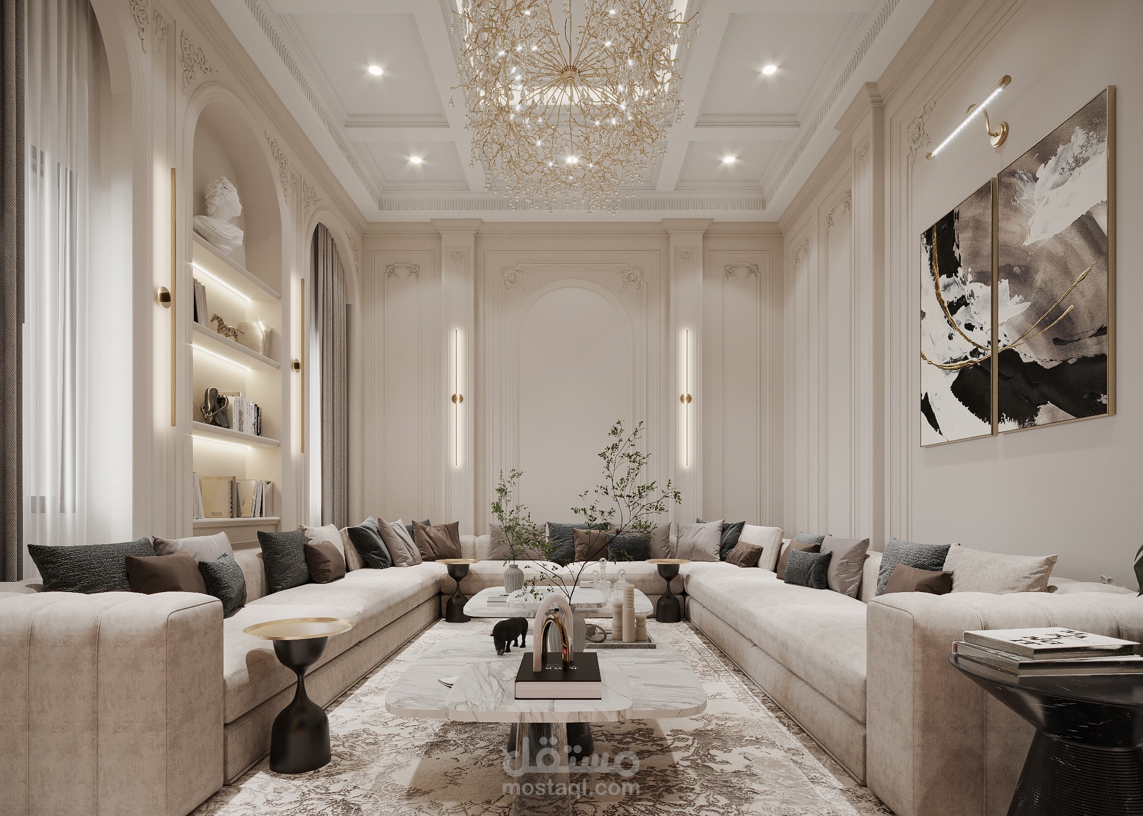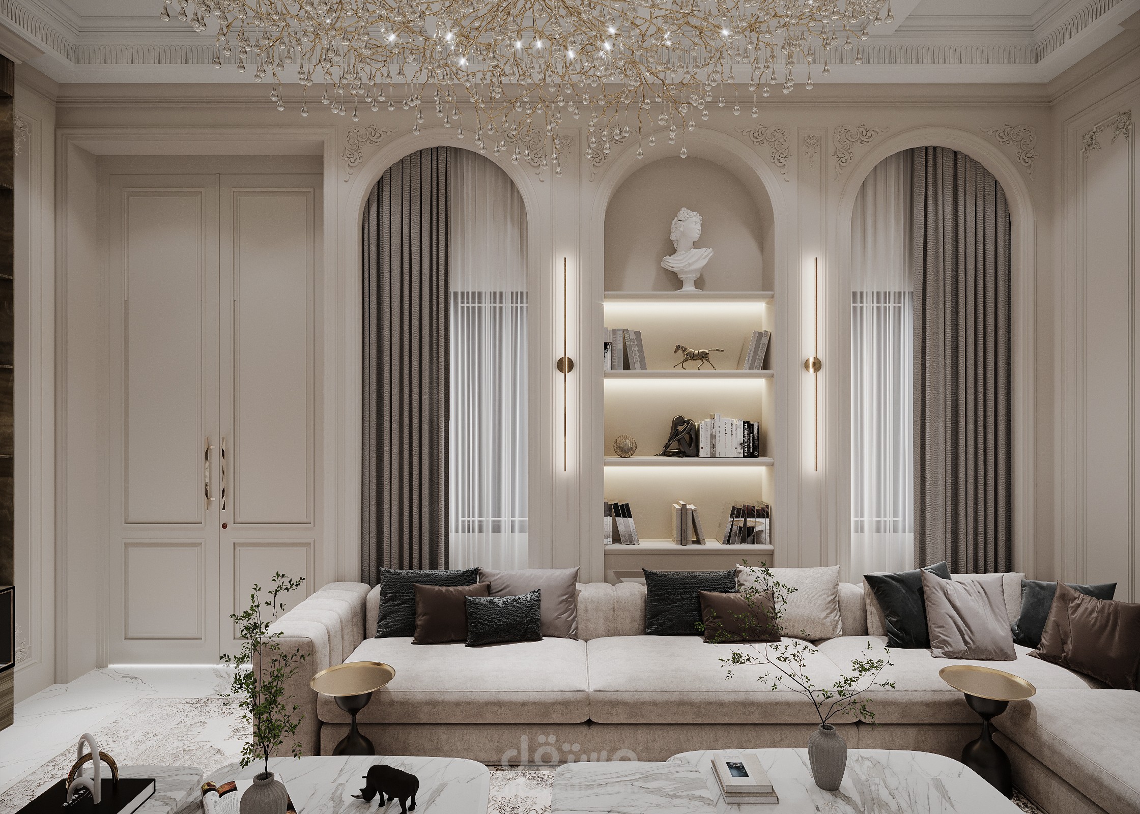 تصميم مقلط رجال بجلسه أرضيه على الطراز النيو كلاسيك مع جلسه ارضيه وجدار للتلفاز