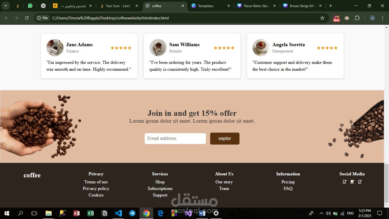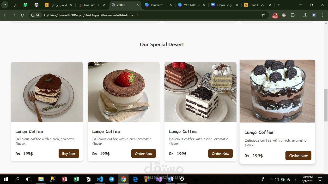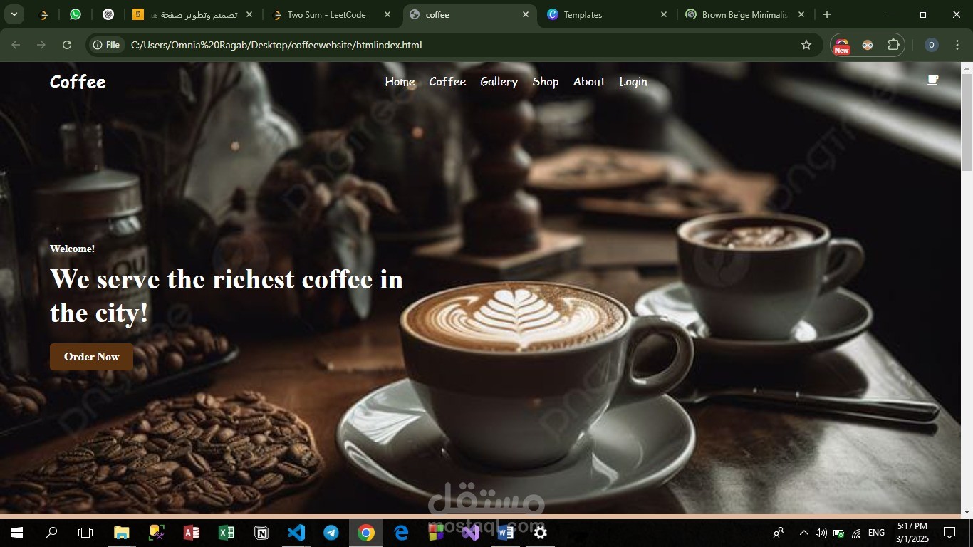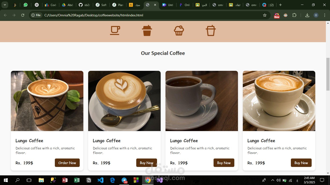 قمت بتصميم وبرمجة موقع ويب كامل لمقهى عصري باستخدام HTML و CSS فقط، مع التركيز على إنشاء تجربة مستخدم مميزة وتصميم واجهة جذابة وبسيطة تناسب هوية الكافيه.