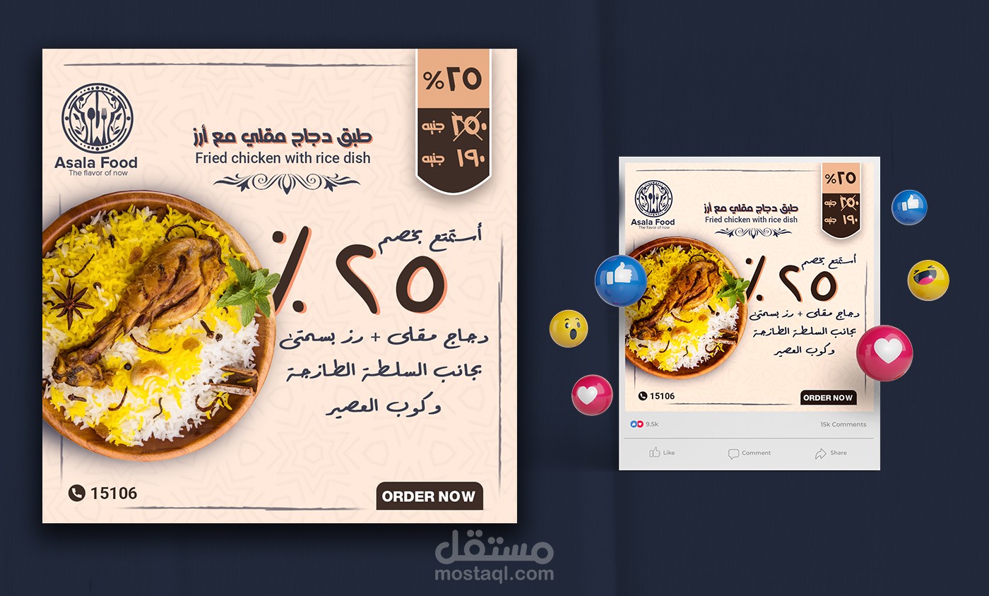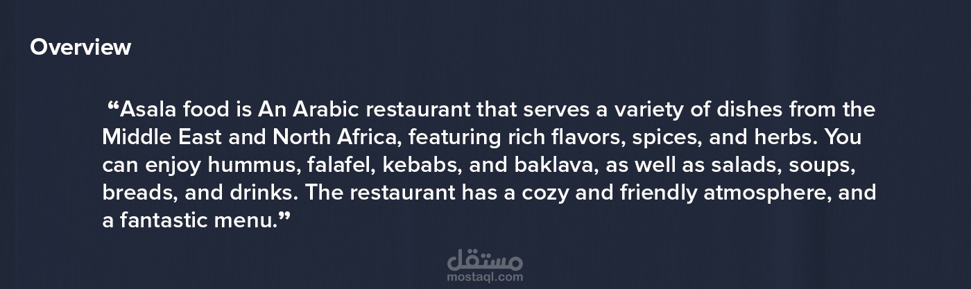 أصالة فود هو مطعم يقدم الوجبات العربية . تم اختيار الألوان التى سيت العمل بها ورسم وتنفيذ الشعار بالإضافة الى الفلاير وورق المراسلات والكروت الشخصية بالأضافة الى تصميمات السوشيال ميديا.