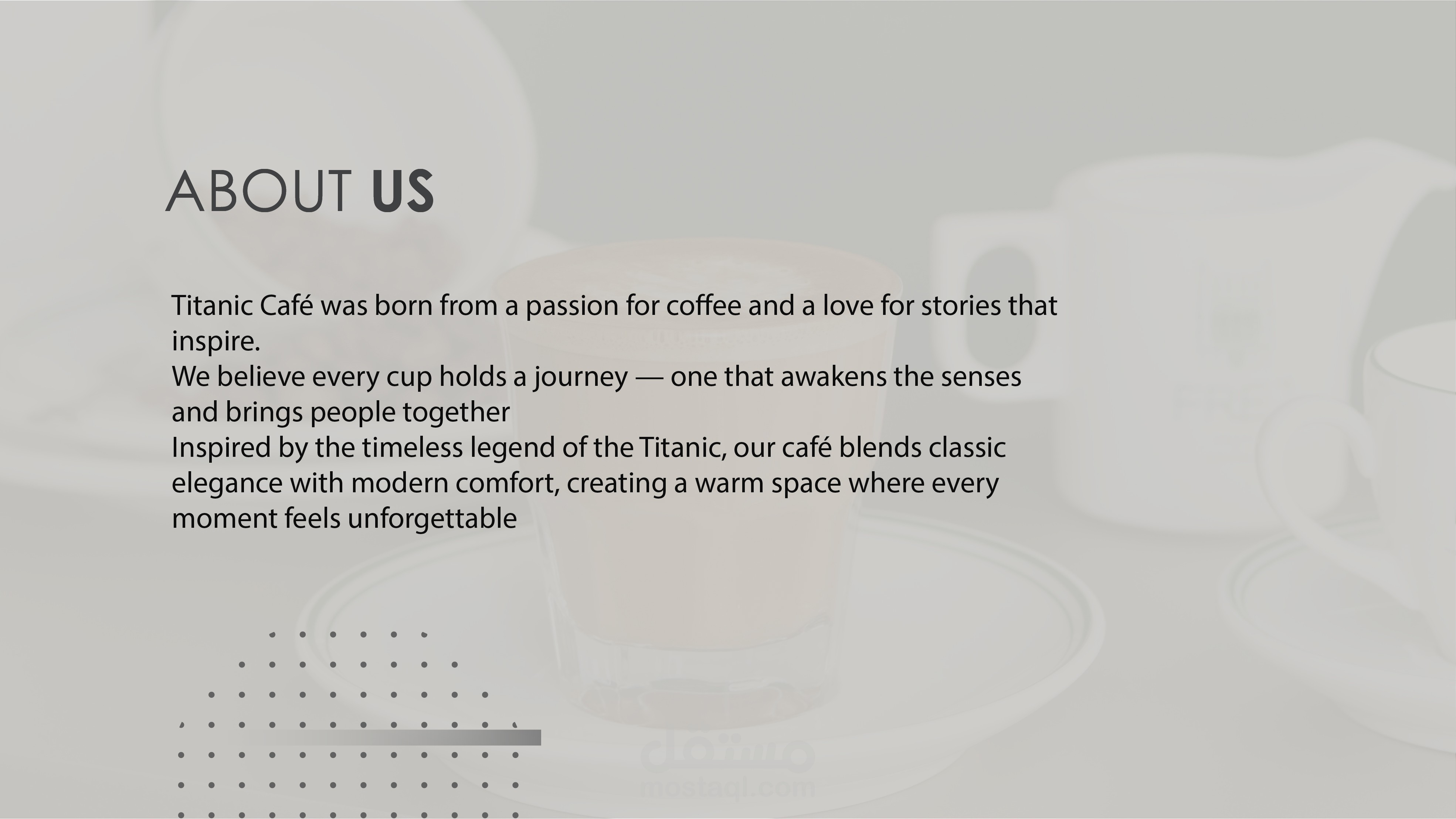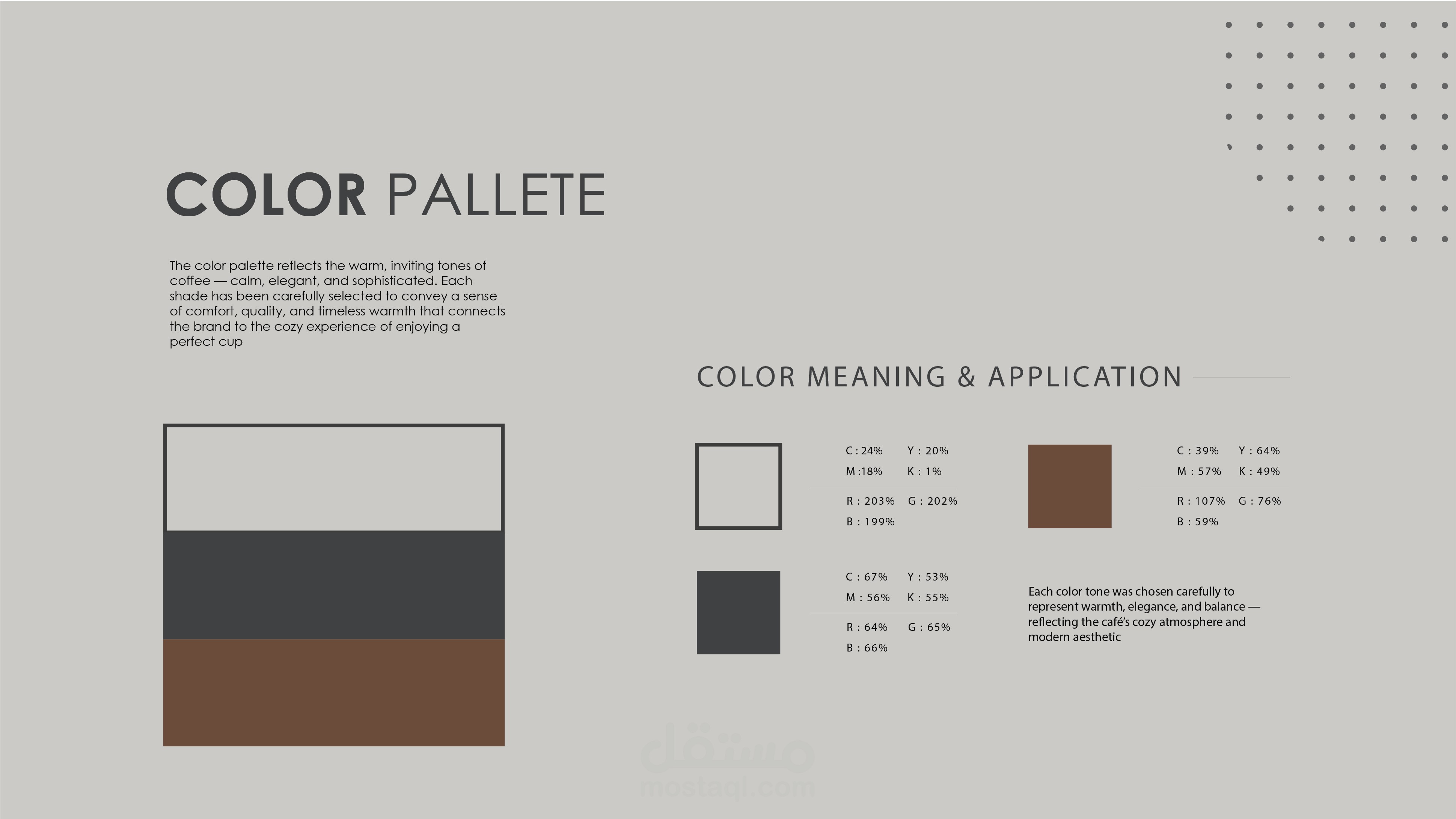 تم اختيار ألوان دافئة وراقية لتعكس هوية الكافيه وتظهر بشكل مميز عند استخدامها في الطباعة على كوبايات القهوة والتطبيقات الدعائية المختلفة