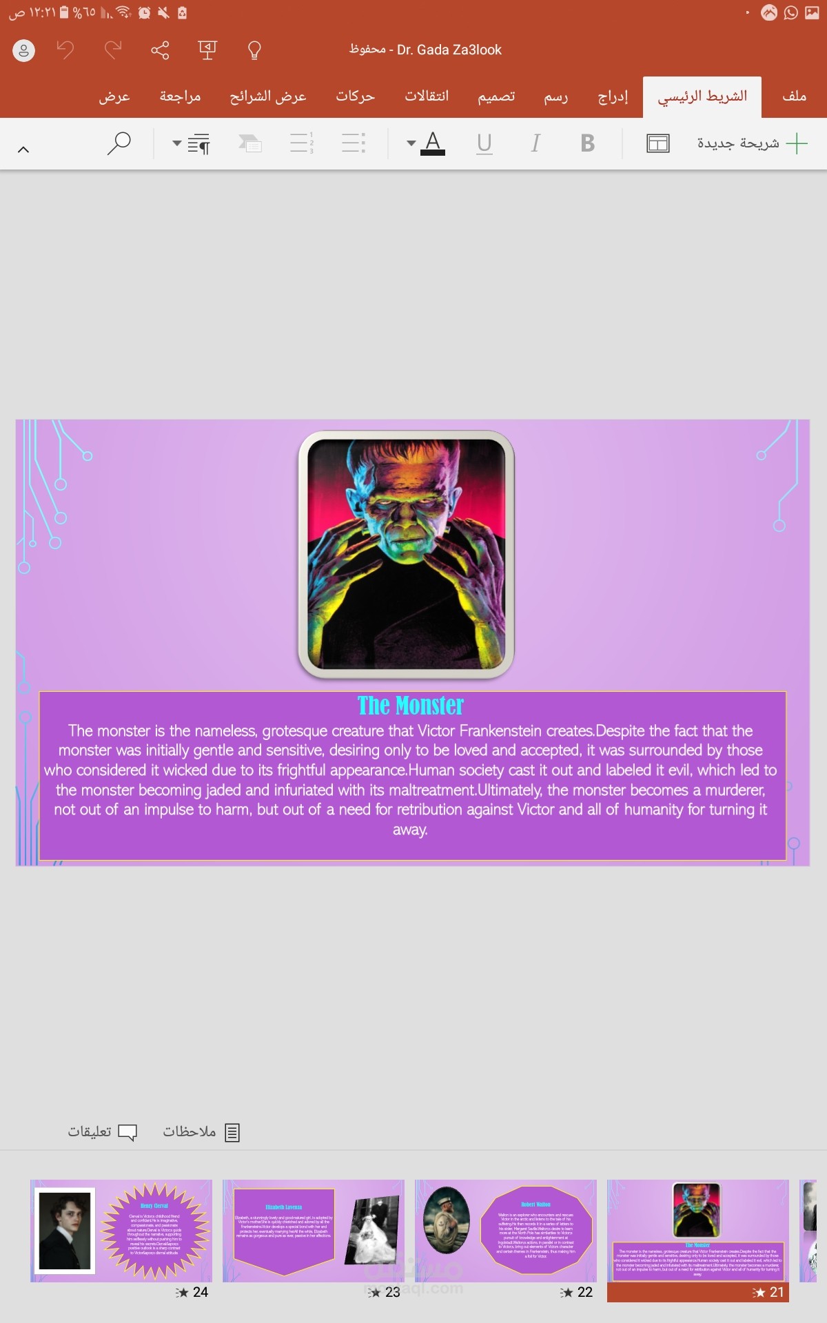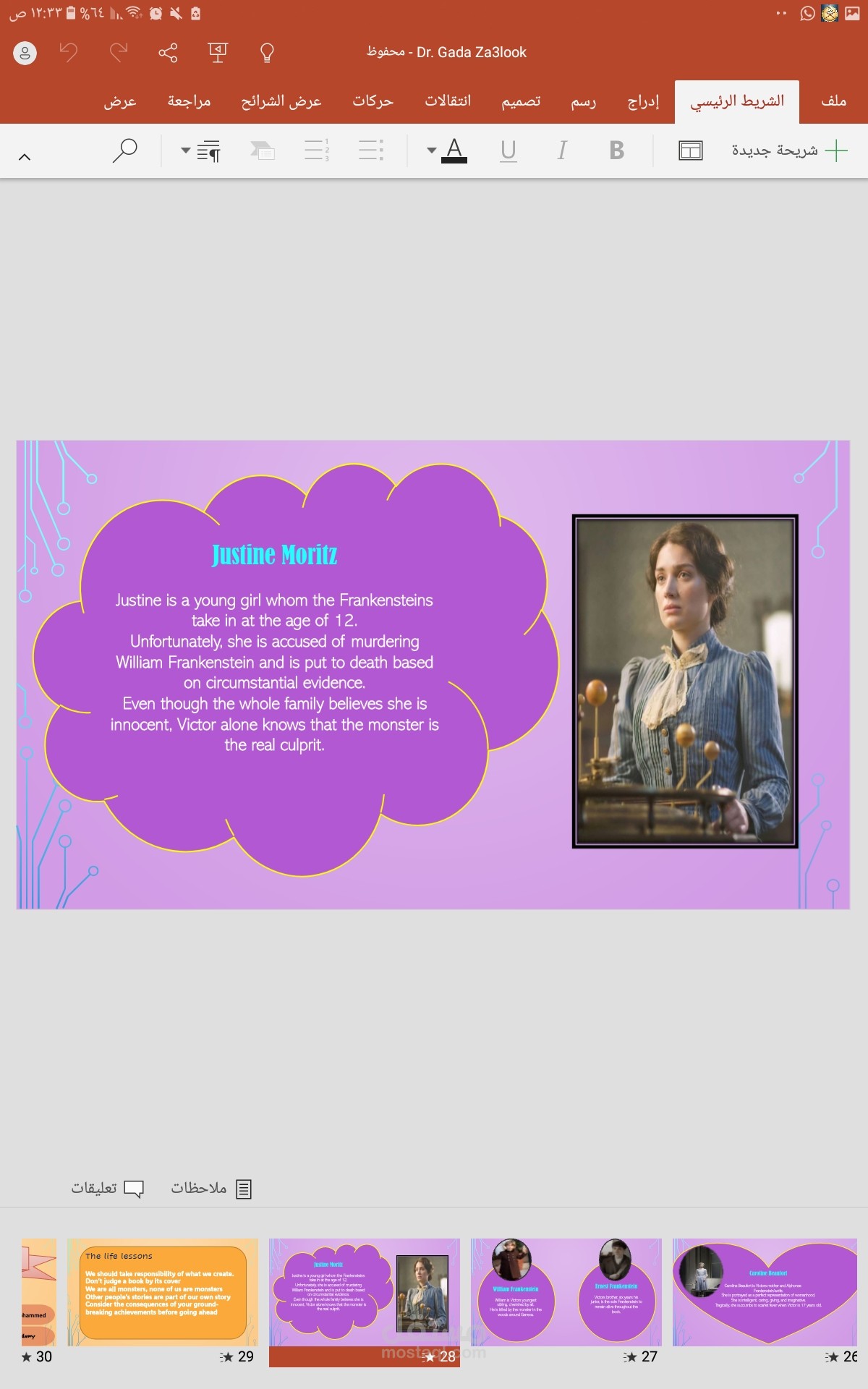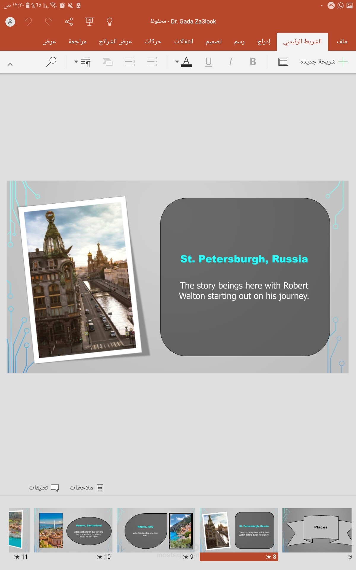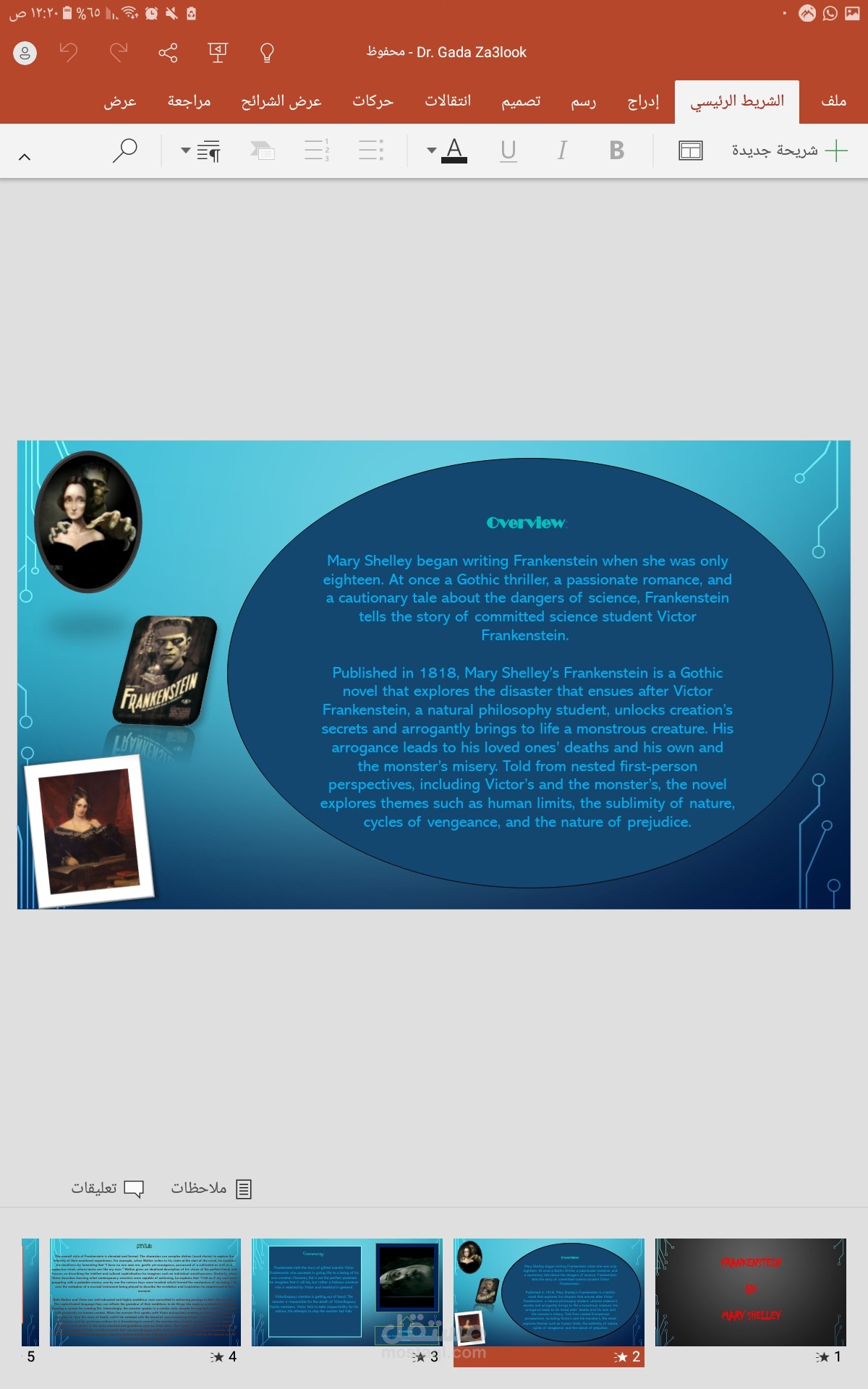 تم هذا العمل بالاستعانه ببرنامج power Point والذي من الصعب قليلا استخدامه يتميز العمل بالسرد المنطقي لاحداث العرض المقدم داخلة تنسيق رائع للالوان والخطوط وتنسيق وتعديل الصور رائع بالنسبة لعمل مبتدئة مثلي .