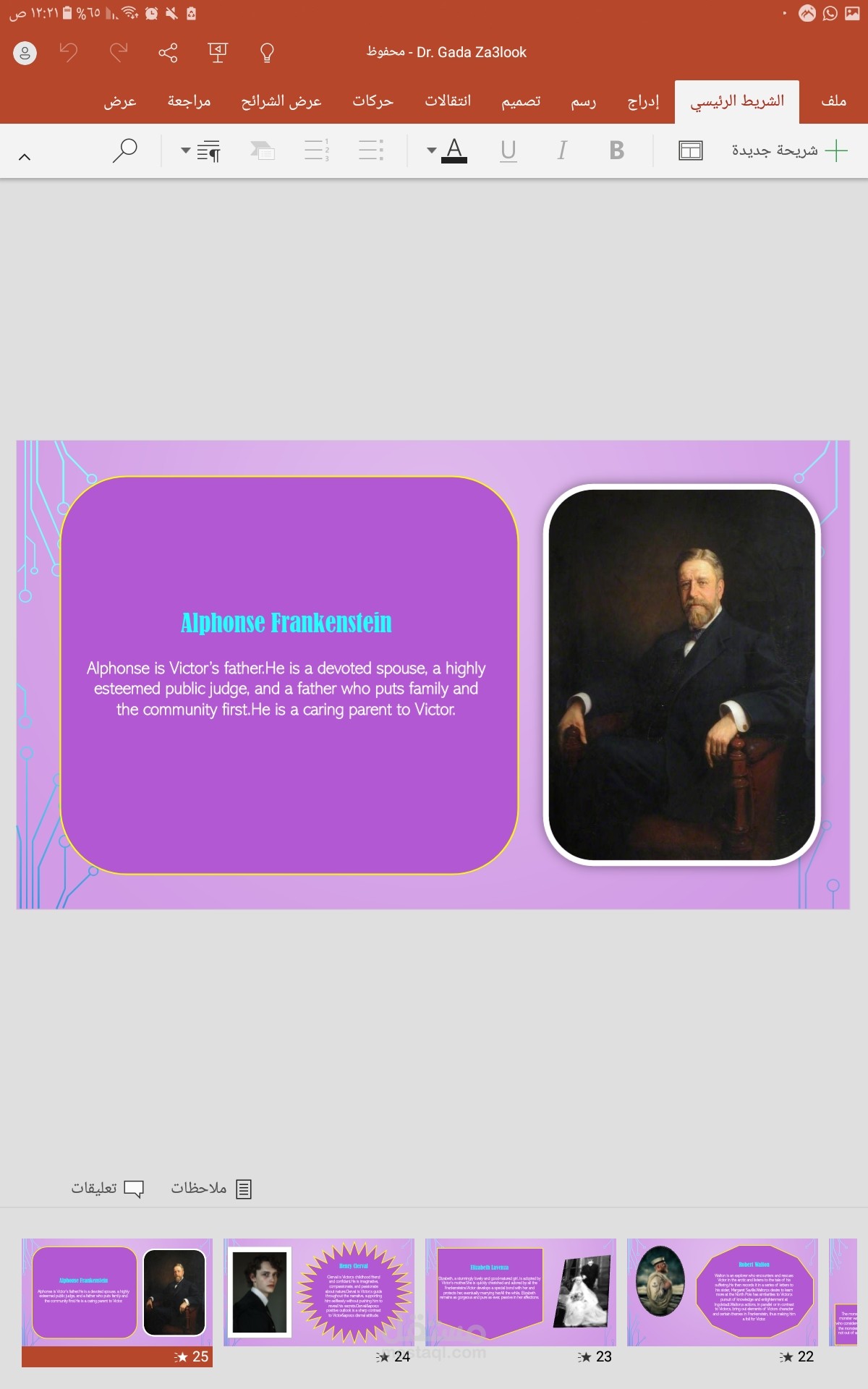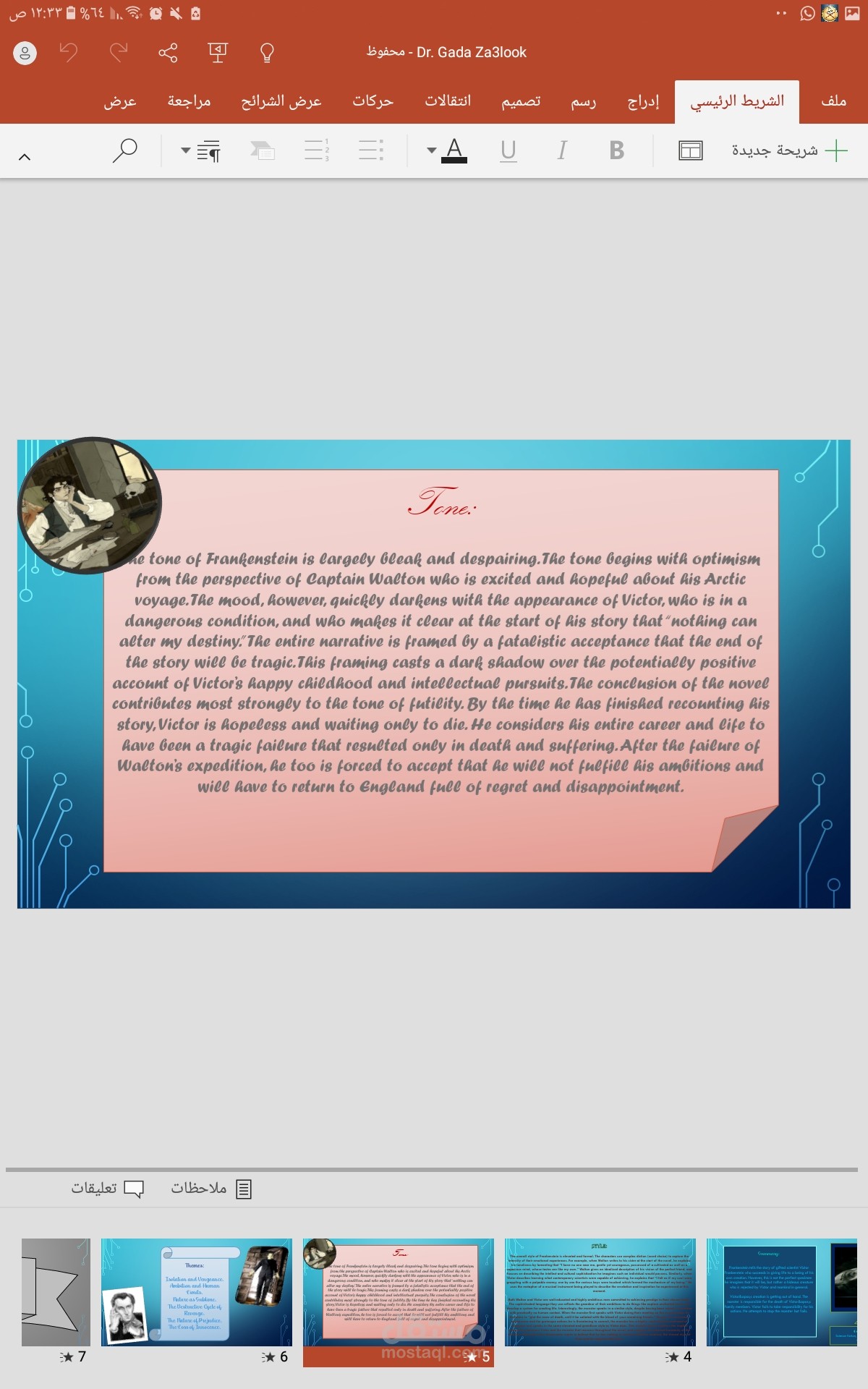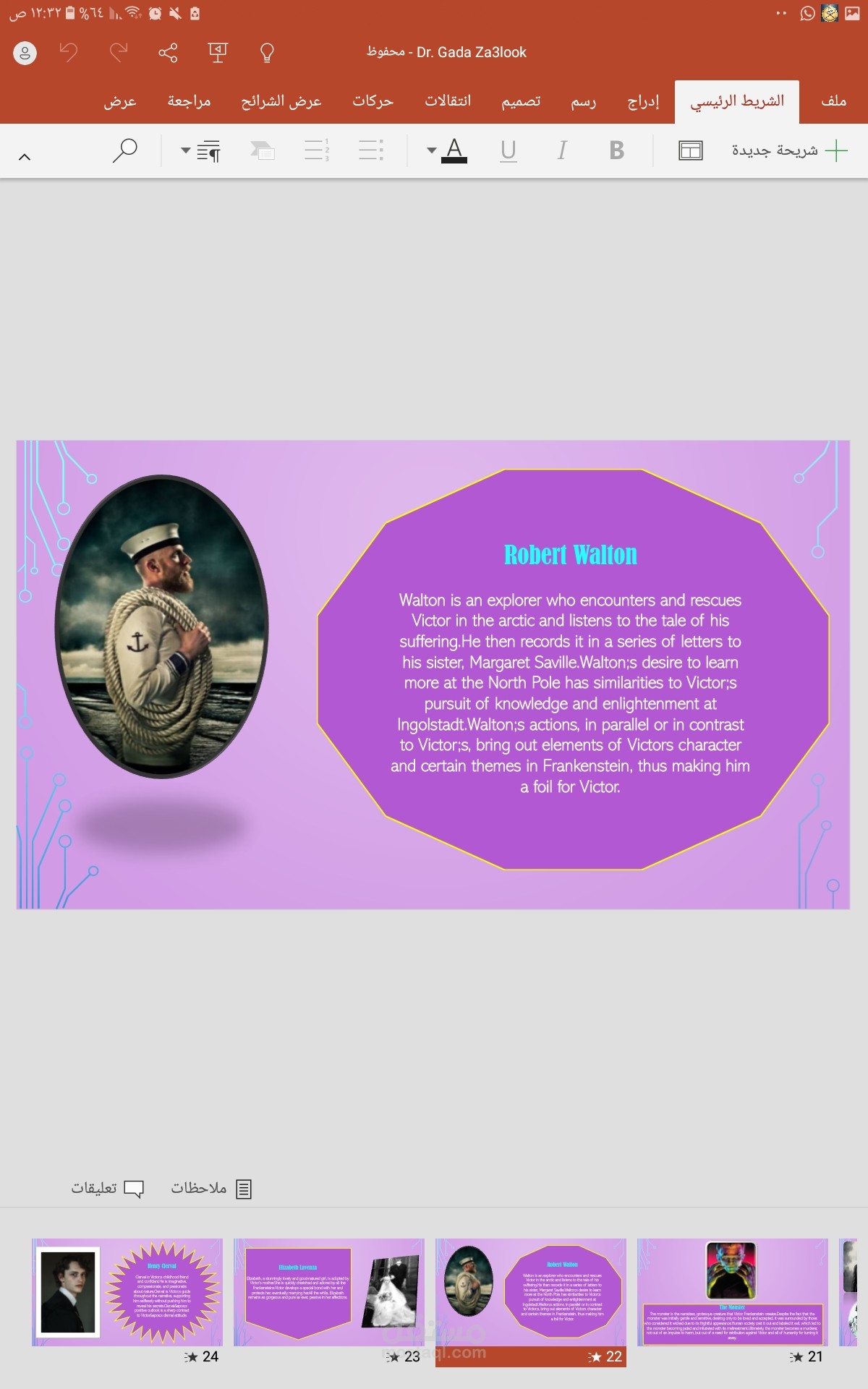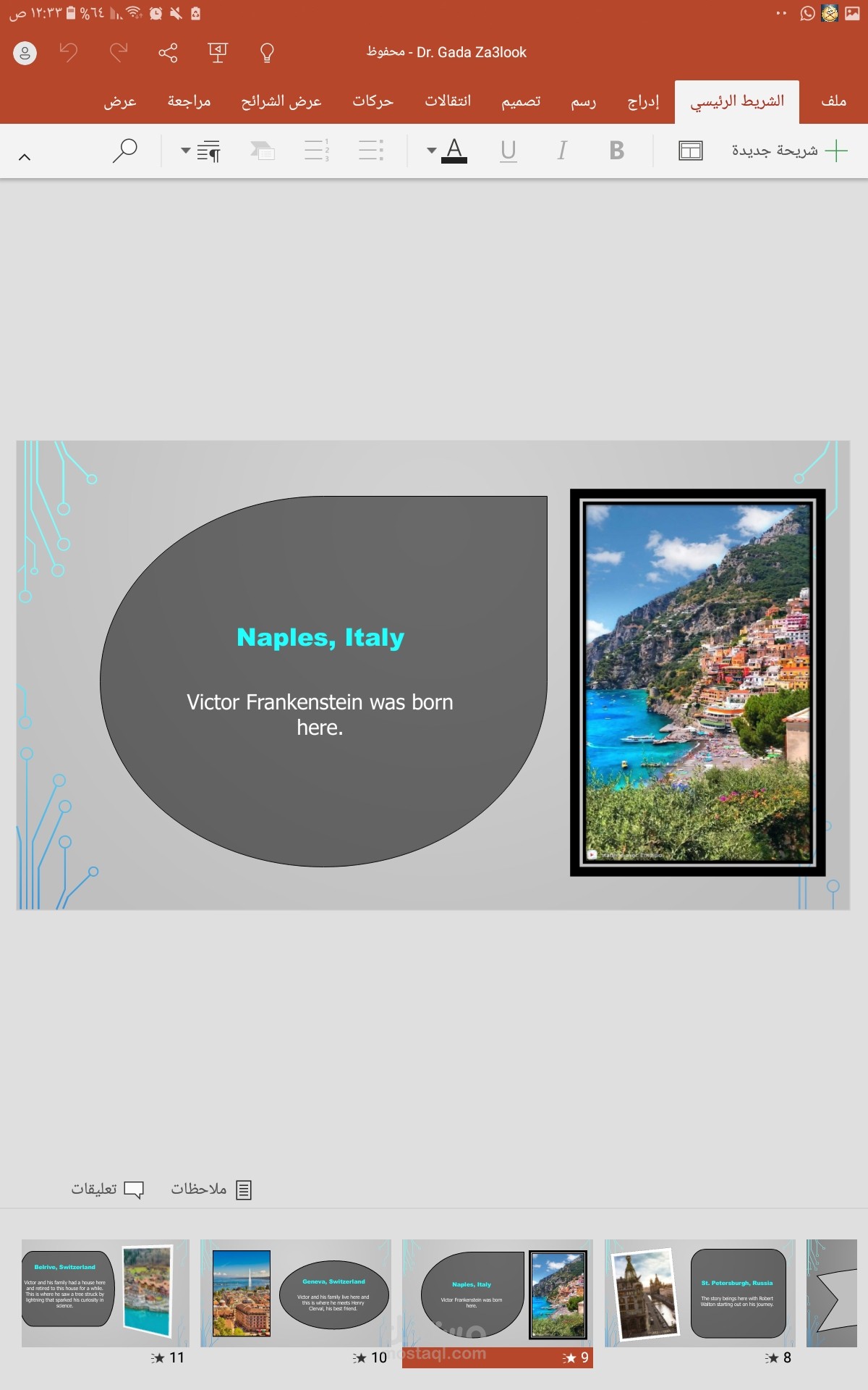 تم هذا العمل بالاستعانه ببرنامج power Point والذي من الصعب قليلا استخدامه يتميز العمل بالسرد المنطقي لاحداث العرض المقدم داخلة تنسيق رائع للالوان والخطوط وتنسيق وتعديل الصور رائع بالنسبة لعمل مبتدئة مثلي .