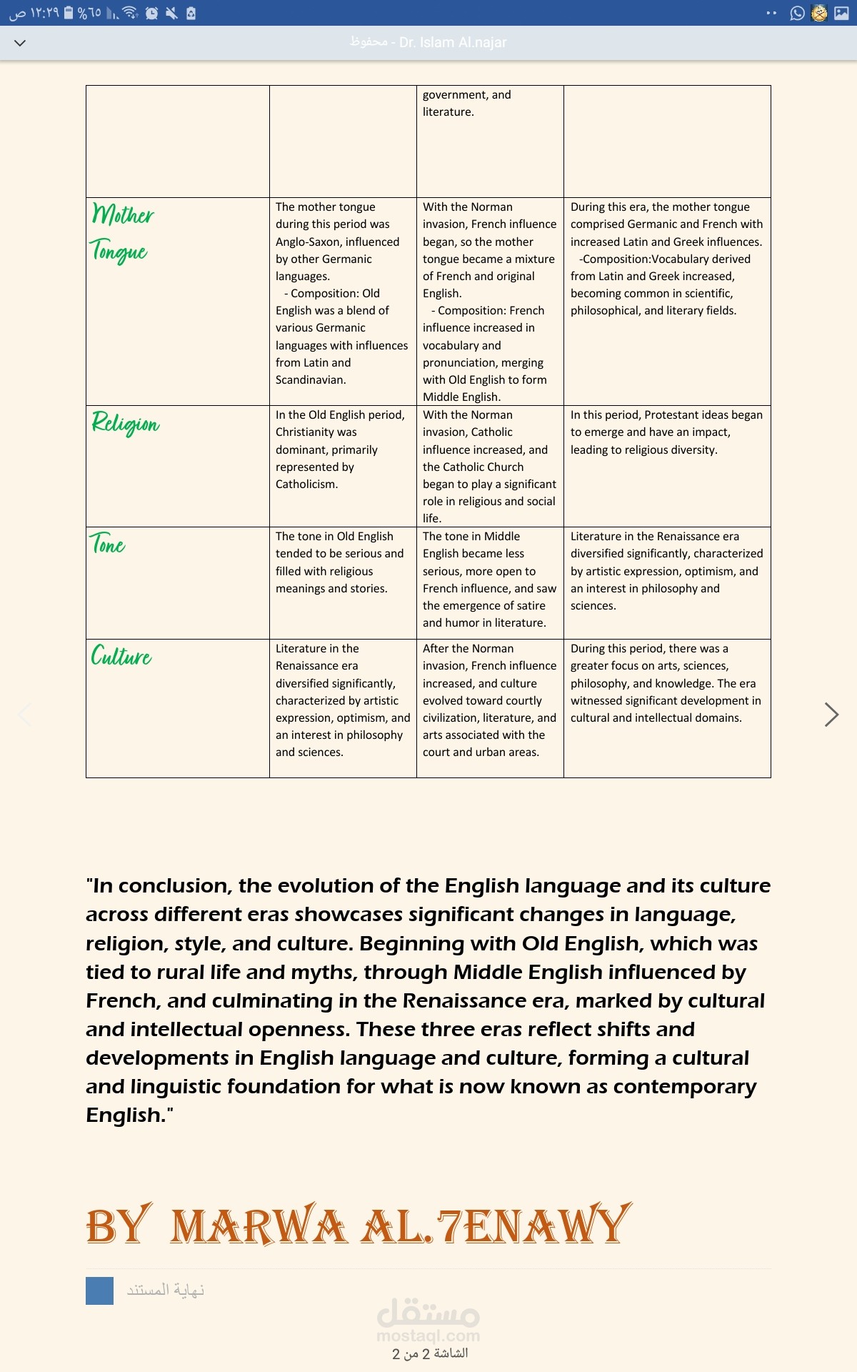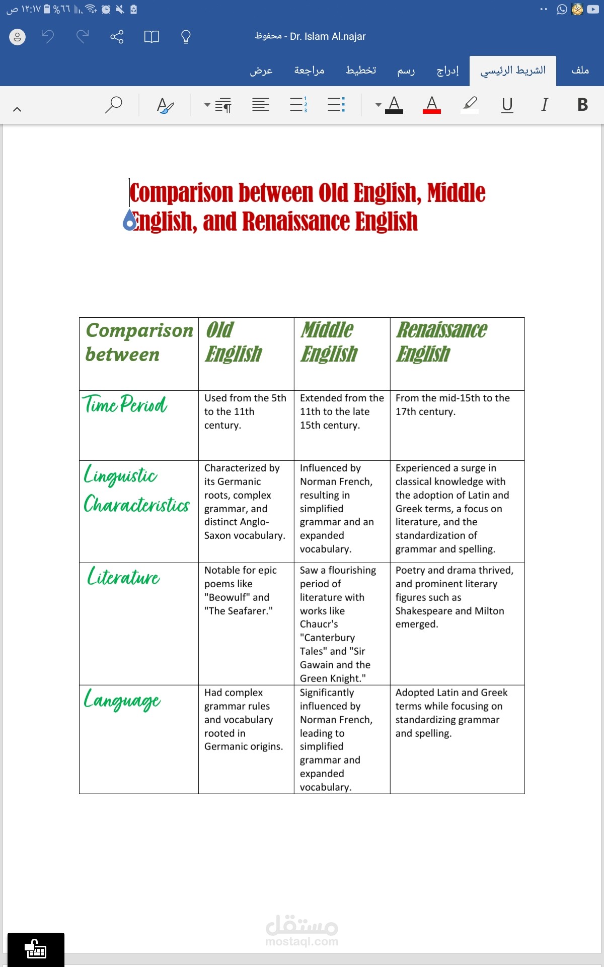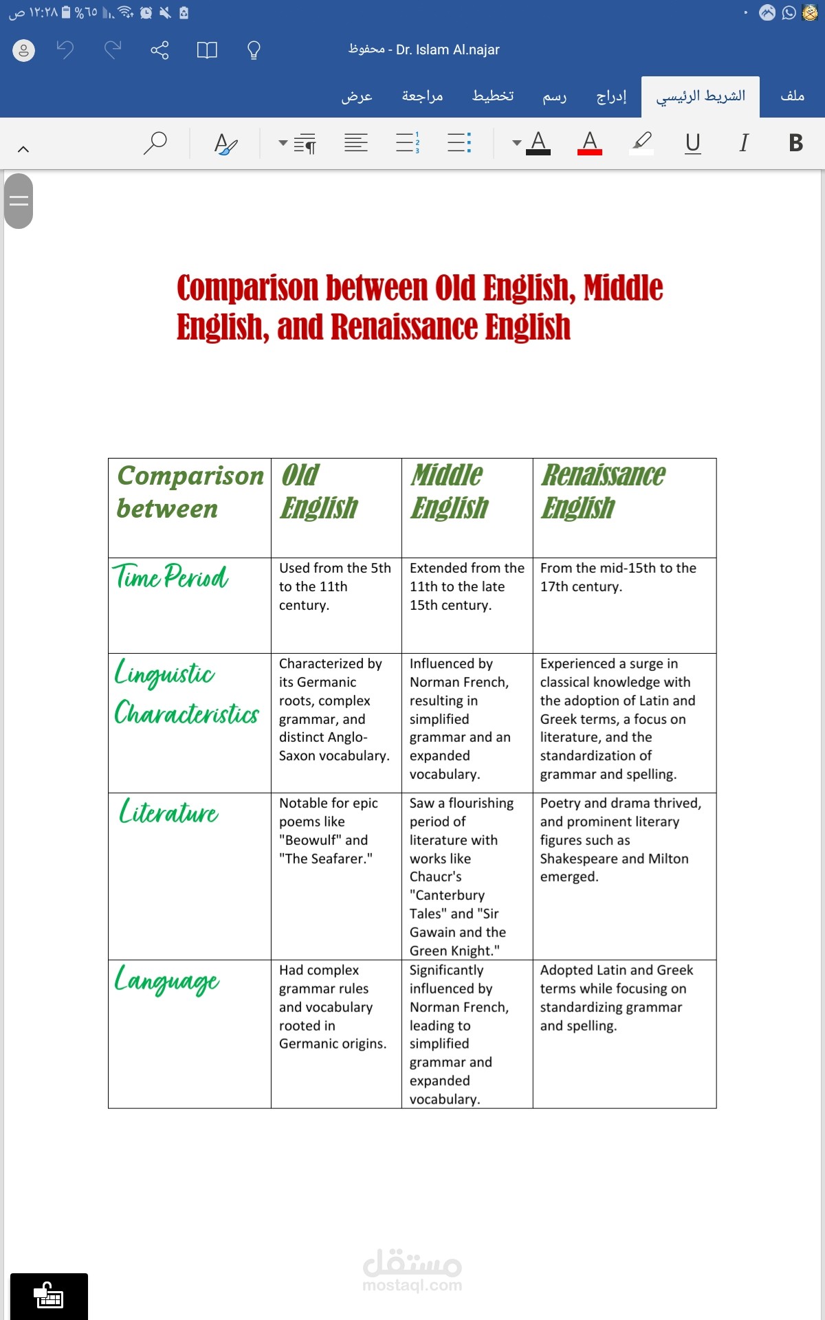 تم اعداد هذا العمل عن طريق برنامح الورد وتنسيق الجدول والالوان والخط متناسب بشكل كبير مع موضوع البحث