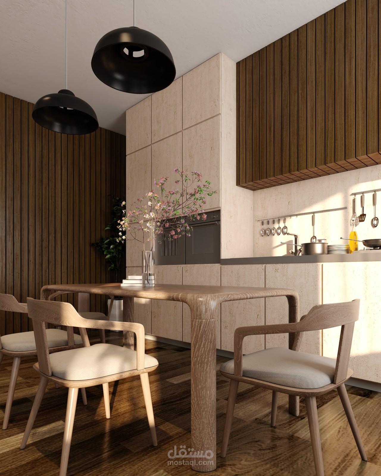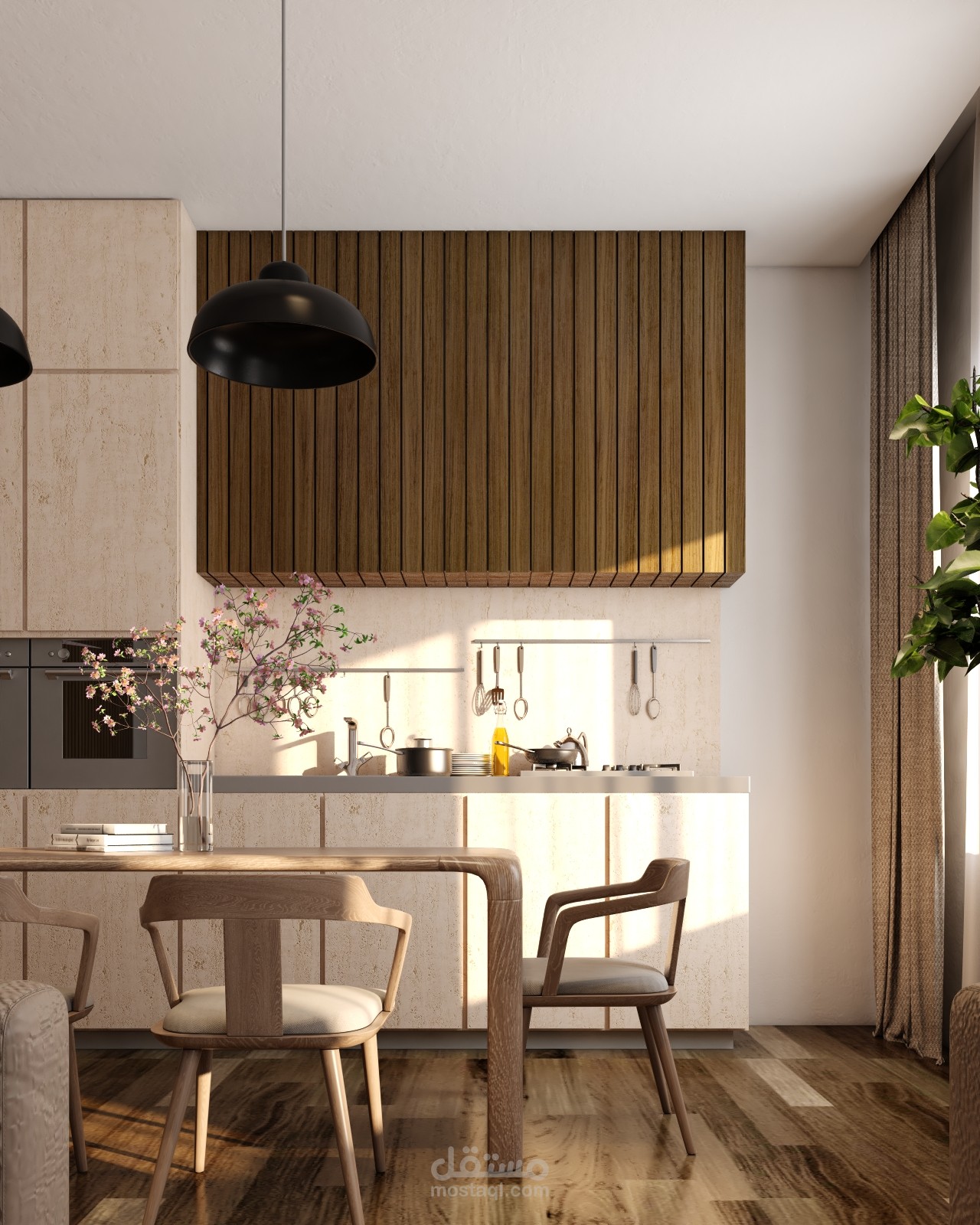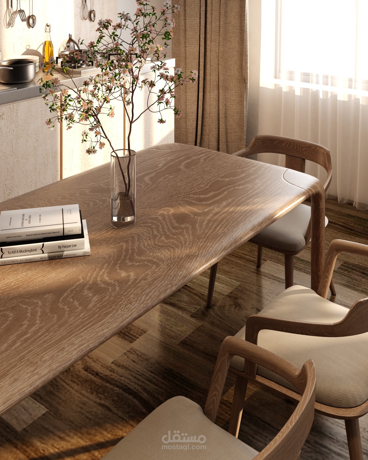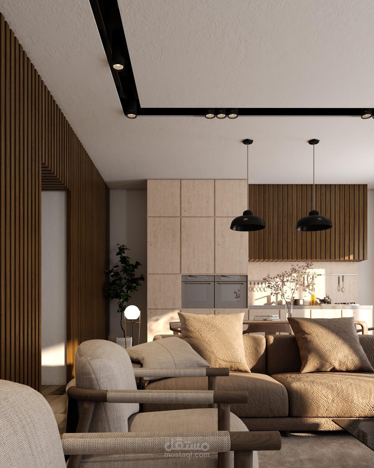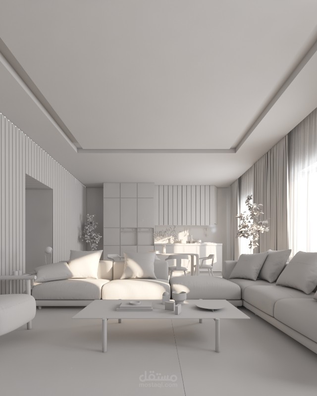 تم عمل محاكتة لمشروع غرفة معيشة و سفرة علي مطبخ مفتوح ببرنامج ال3ds max و v-ray