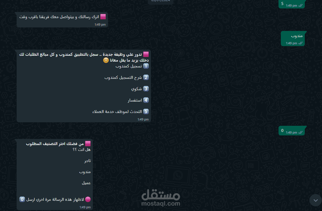 حيث يرسل البوت رسالة ترحيب عندما يرسل المستخدم اي رسالة و يطلب من المستخدم تحديد خيار تاجر او عميل او مندوب توصيل و بناء علي أحد هذه الخيارات يتم ارسال الردود الخاصة بكل تصنيف