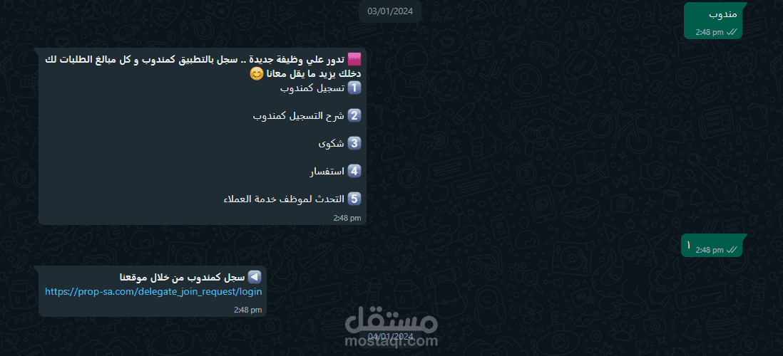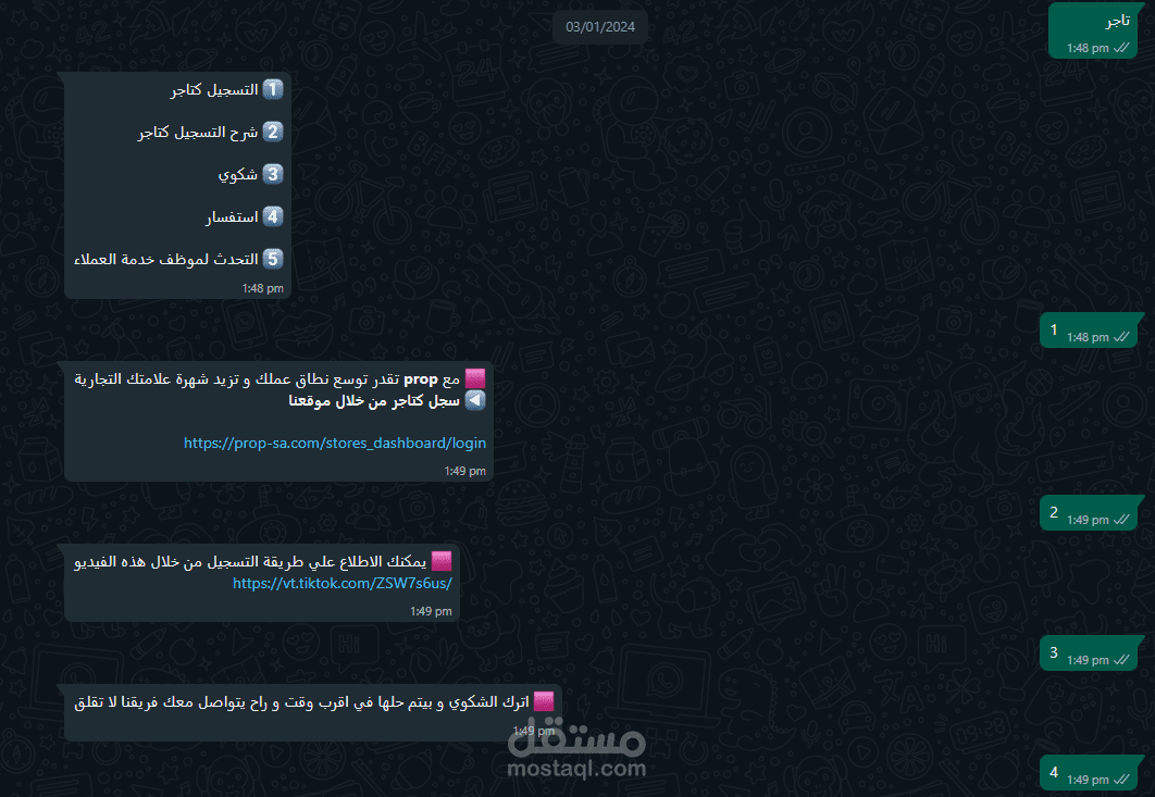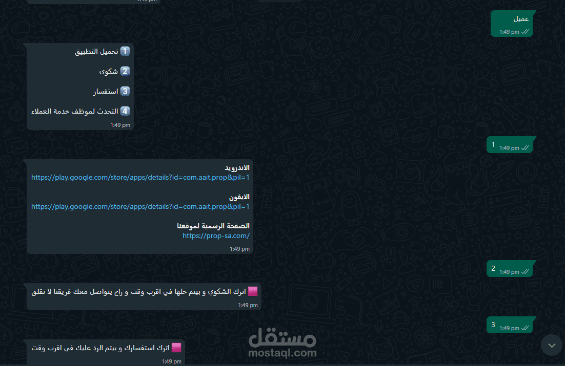 تمت برمجة بوت الواتساب للرد الالي الخاص بشركة prop المتخصصة في توصيل الطلبات بلغة ال nodejs للرد علي العملاء و استفساراتهم من خلال مجموعة من الخيارات