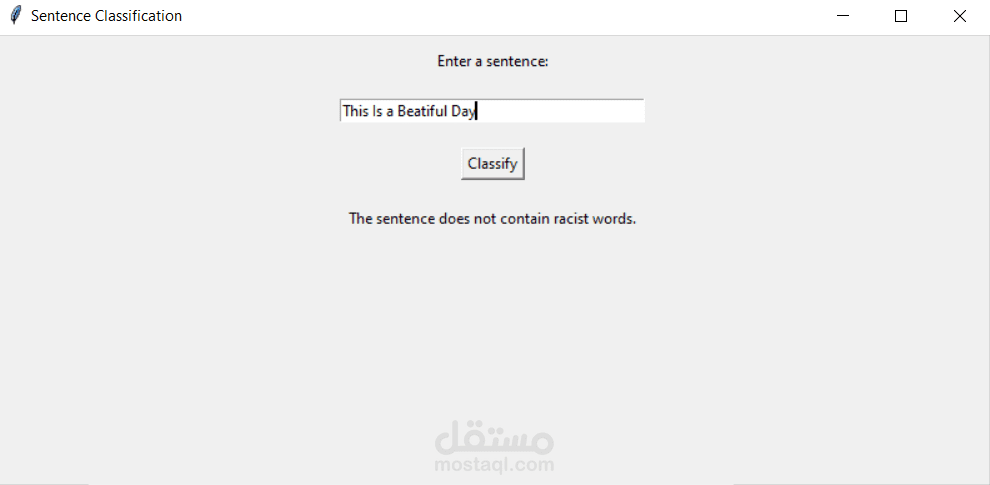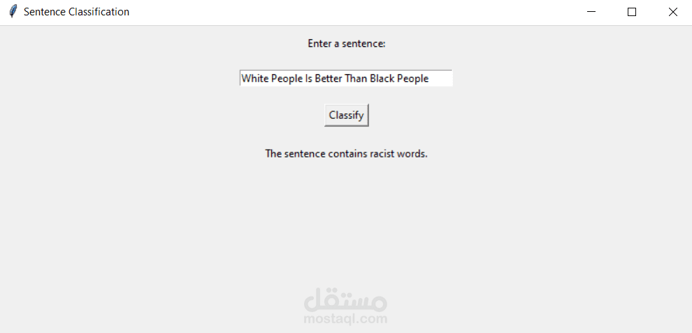 وفي الختام، تم تصميم واجهة مستخدم تسمح للمستخدم بإدخال جملة لتحليلها والحصول على تقييم حول وجود محتوى عنصري فيها. يعكس المشروع قدرتي على التعامل مع تحليل النصوص وتدريب نماذج التعلم الآلي بغرض فحص المحتوى بطريقة فعّالة وتوضيحية.
