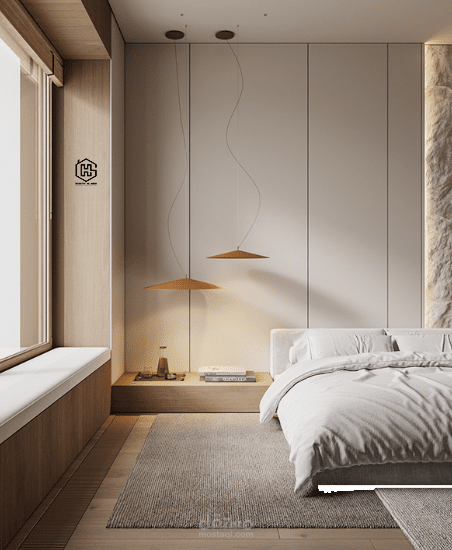 A design with a futuristic vision for the bedroom, using space to provide a work corner, a closet built into the wall to provide the largest amount of space, and an external stone house.