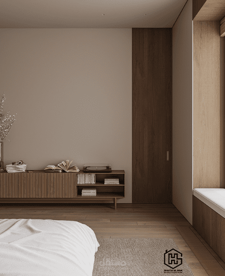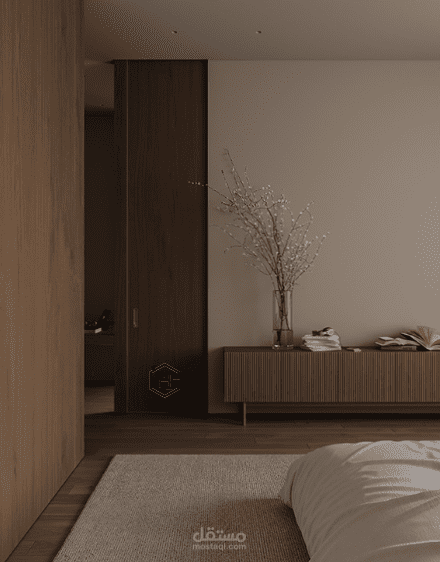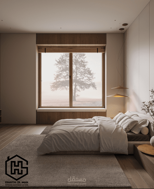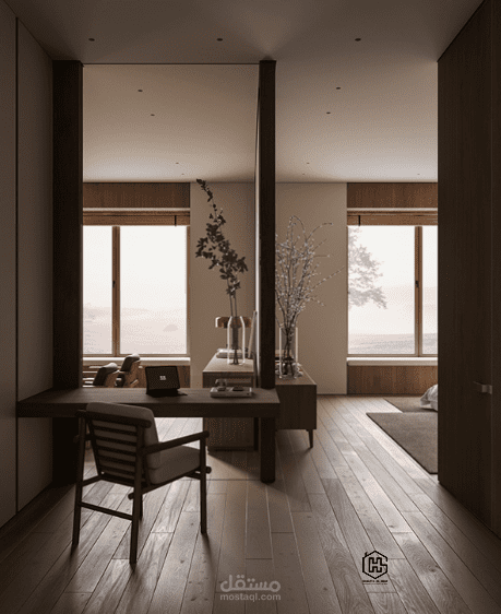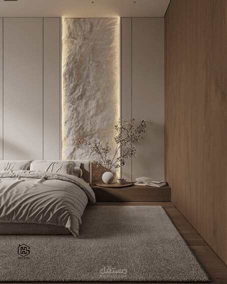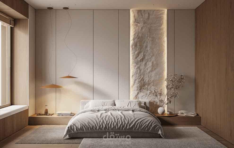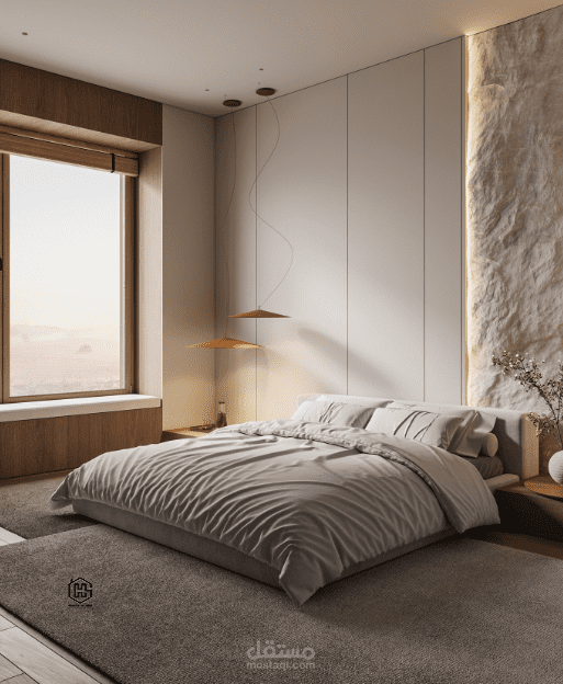 تصميم برؤية مستقبلية لغرفة النوم، استغلال المساحة لتوفير زاوية للعمل، وخزانة مدمجة في الحائط لتوفير أكبر قدر من المساحة، وبيت حجري خارجي.