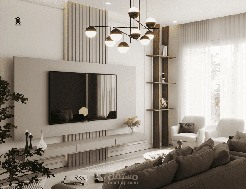 تصميم داخلي لصالة استقبال في فيلا مدران. تم اعتماد البساطة في التصميم بنوافذ واسعة