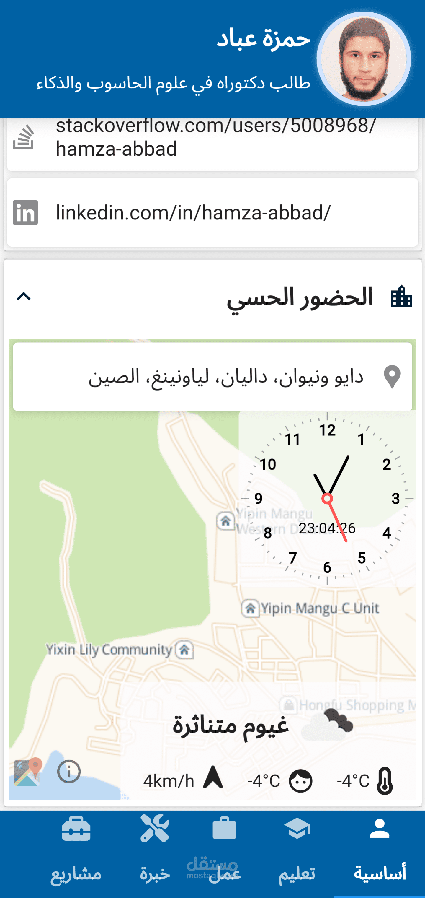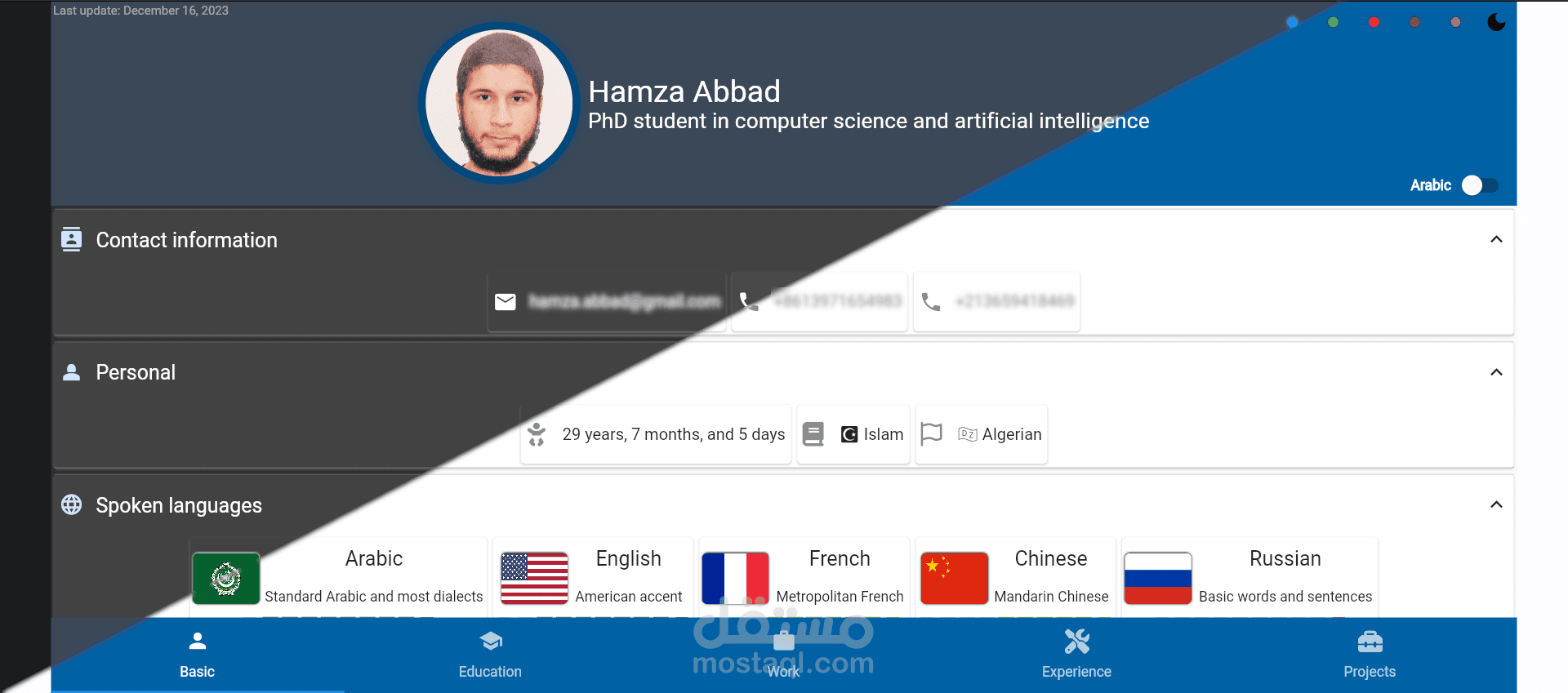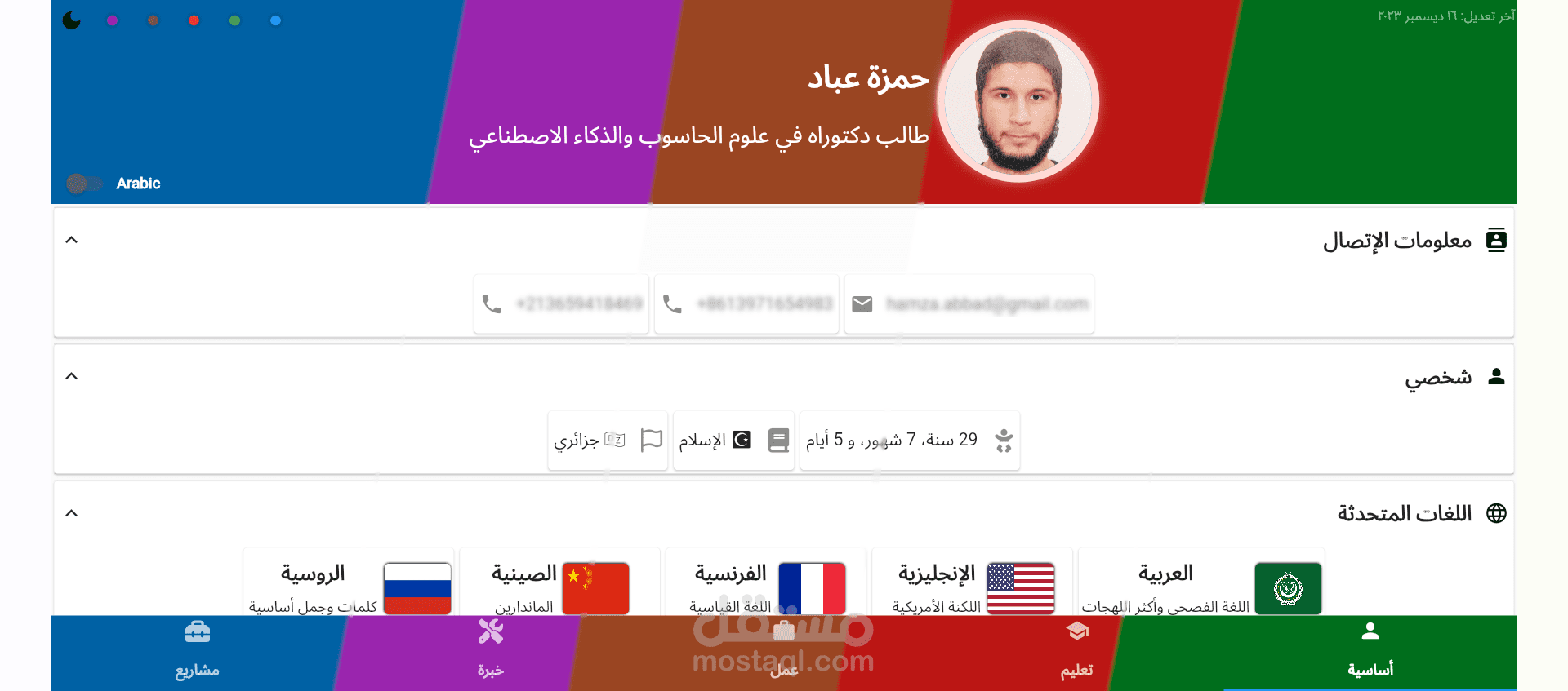 معلومات سيرتي الذاتية منشأة على شكل تطبيق ويب جميل واحترافي مبني على مكتبة Flutter، تصميم مستجيب (responsive) متوافق مع جميع الشاشات الصغيرة والكبيرة، متعدد السمات (themes) بالوضعين الفاتح والداكن، وباللغتين الإنجليزية والعربية.