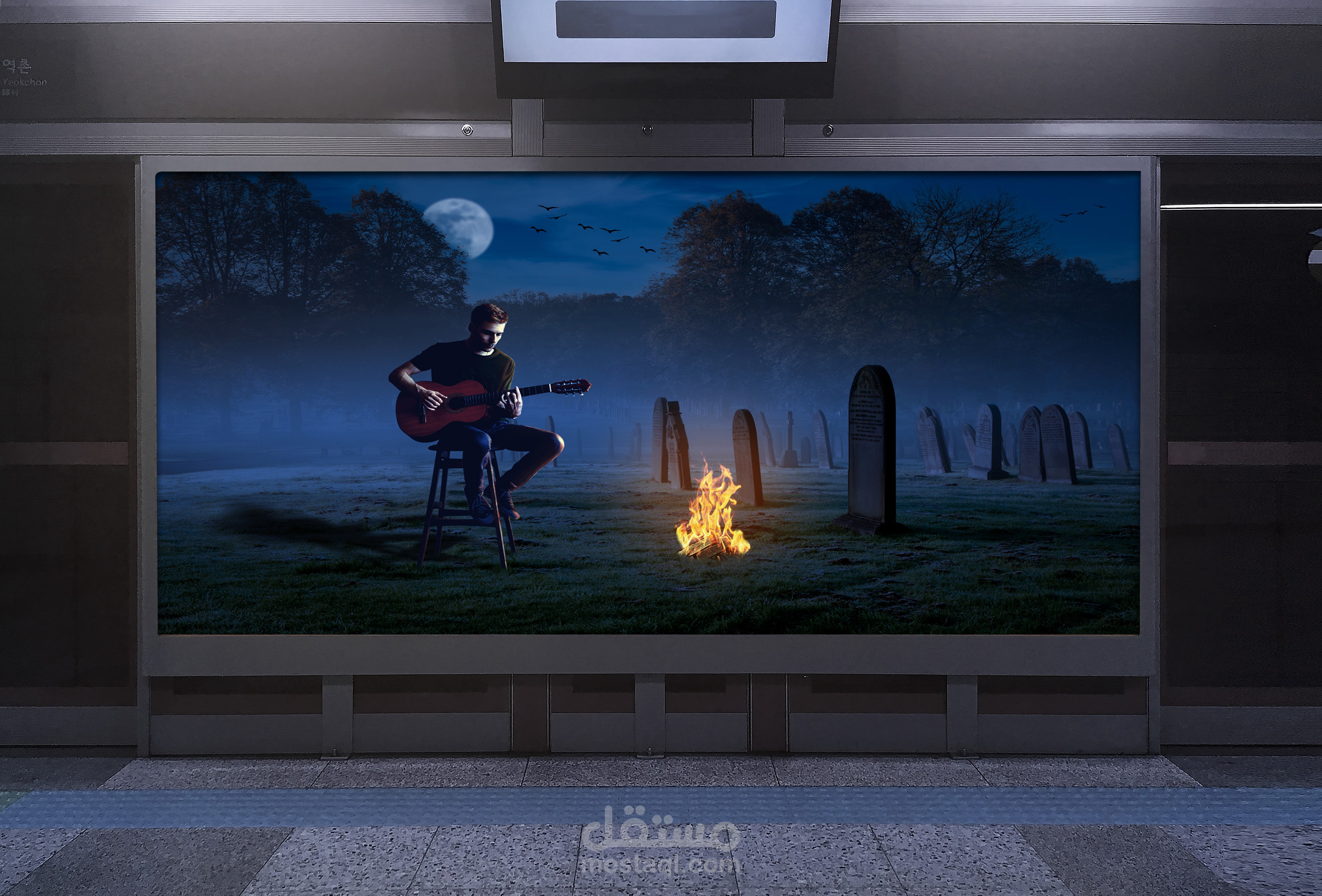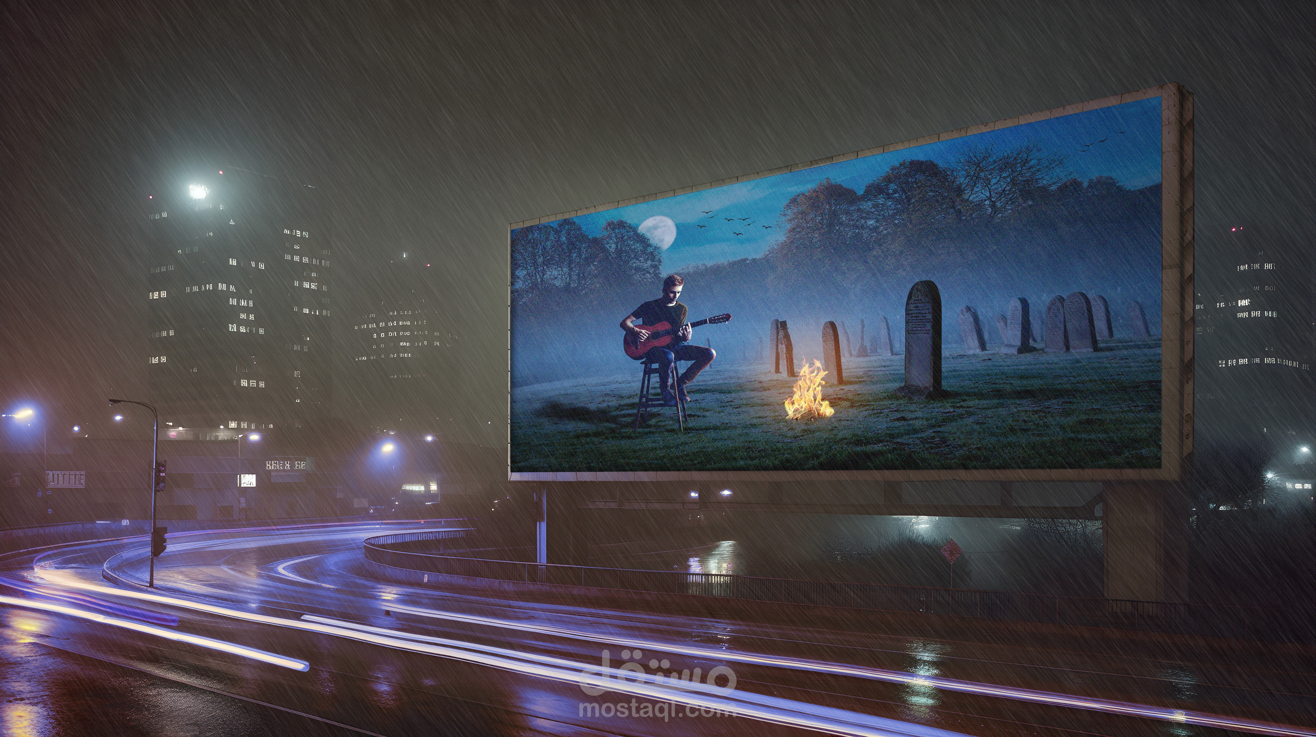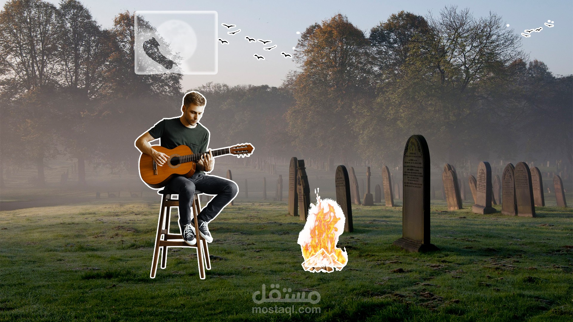 تصميم دمج باستخدام برنامج Photoshop لتصميم عمل ابداعي و توصيل فكرة عن ( عازف جيتار لديه الأمل دائمًا، حتى لو كان داخل القبور؛ فلا يزال لديه ألحان تنير ظلامه ).