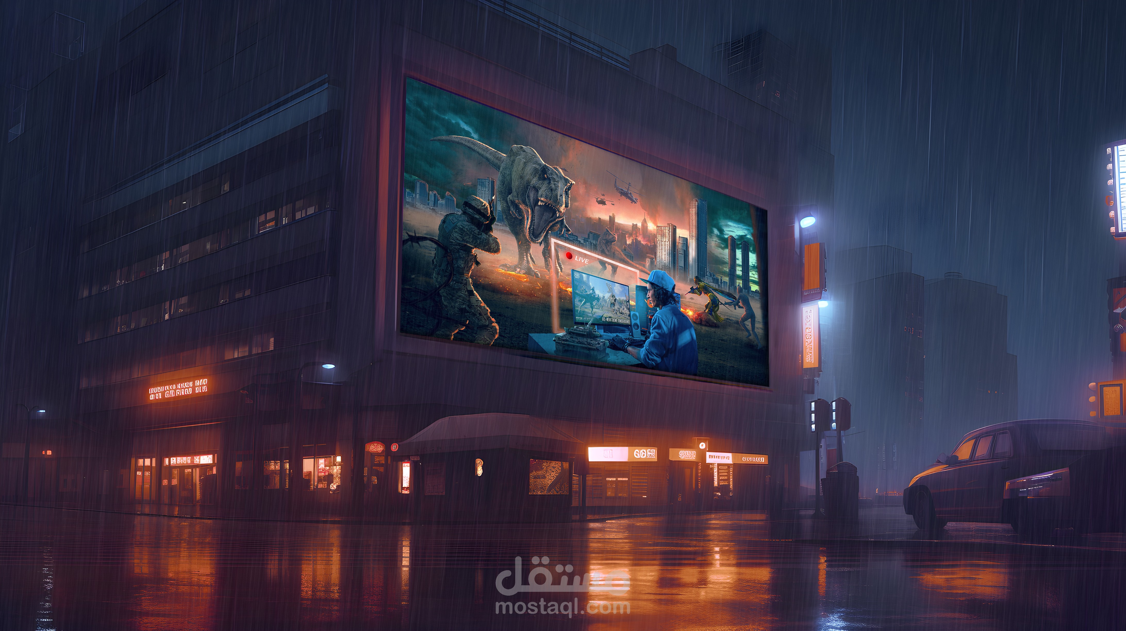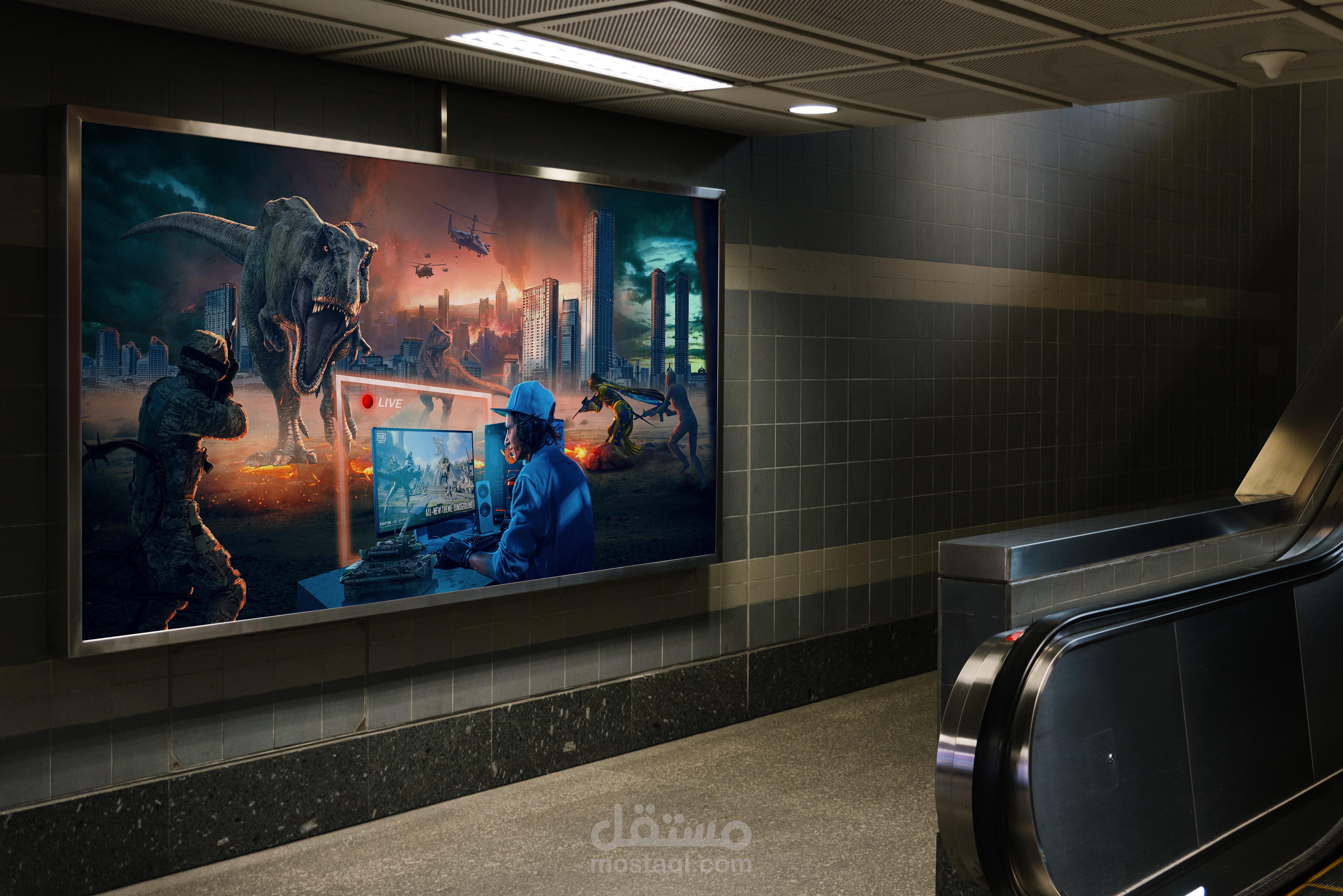 تصميم دمج باستخدام برنامج Photoshop لتصميم عمل ابداعي عن لعبة ببجي موبايل ( في مغامرة مثيرة جدا يلتقي البقاء علي قيد الحياة بعصر ما قبل التاريخ في حرب ببجي مع الديناصورات لذلك إبق مستعد لحرب قوية . ف هل ستنتصر ام ستنقرض؟! ).