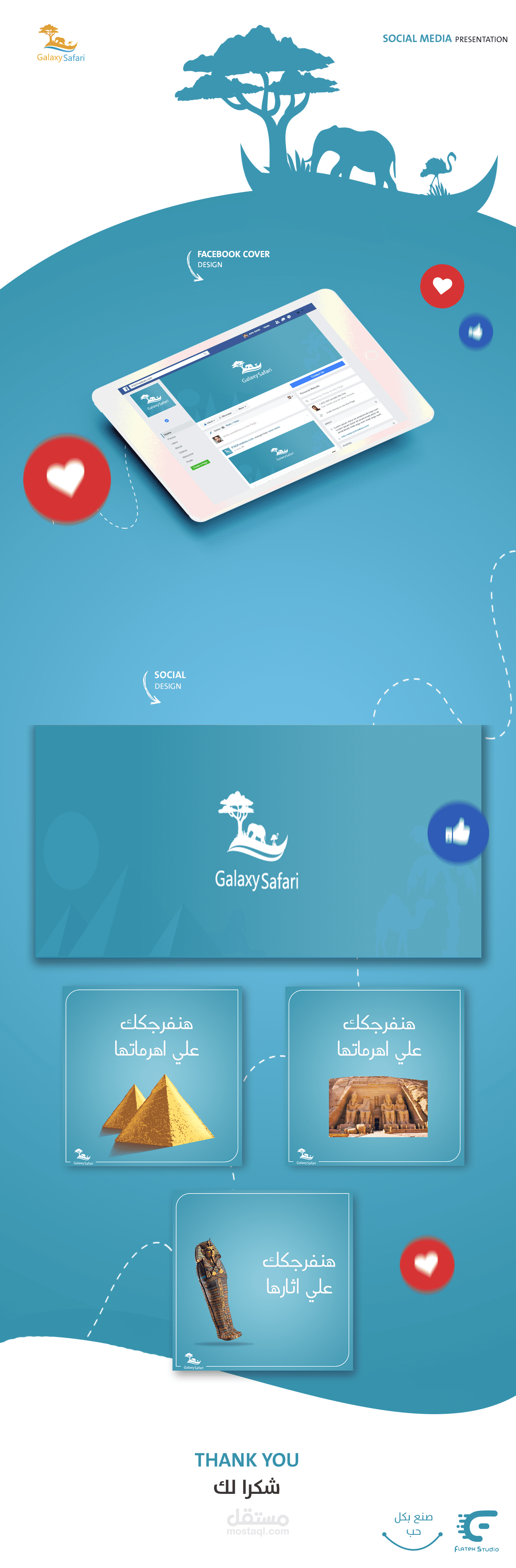 قمت بعمل تصميم لشركة سياحية يطلق عليها اسم جلاكسي سفاري تم تصميم اللوجو و البنرات الاعلانية والكوفر لشبكات التواصل الاجتماعي