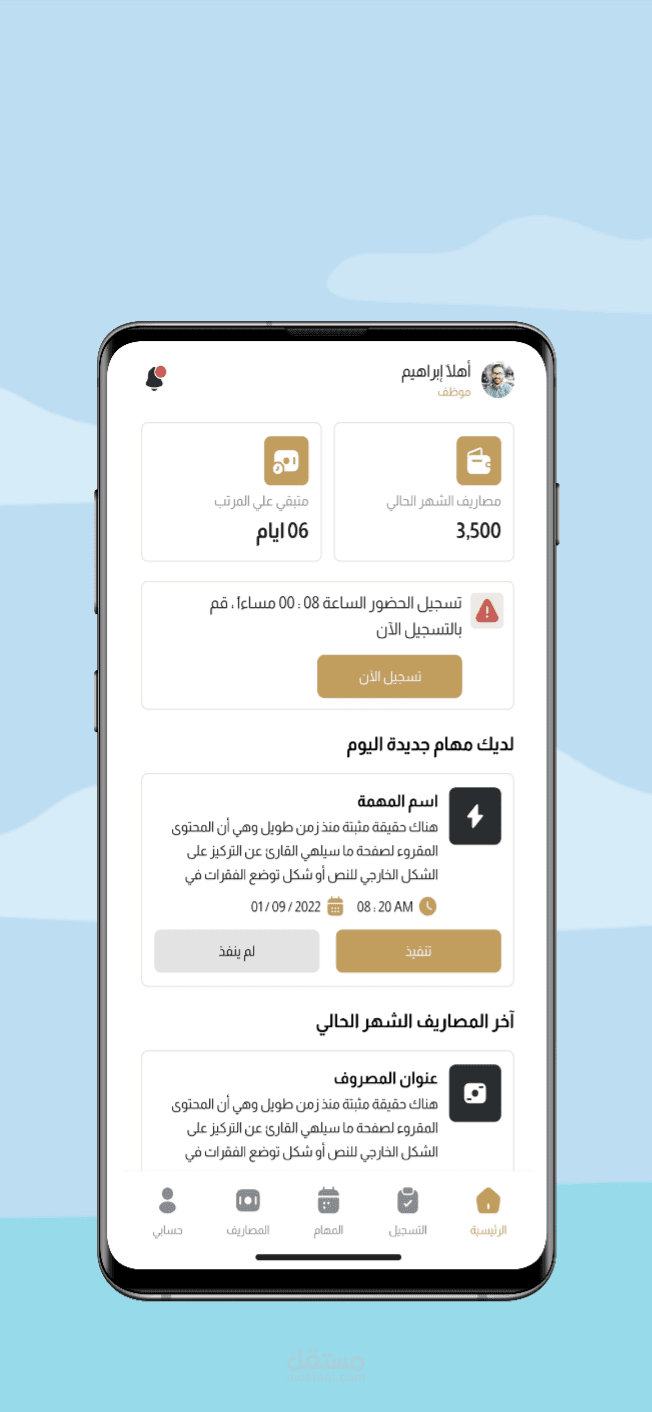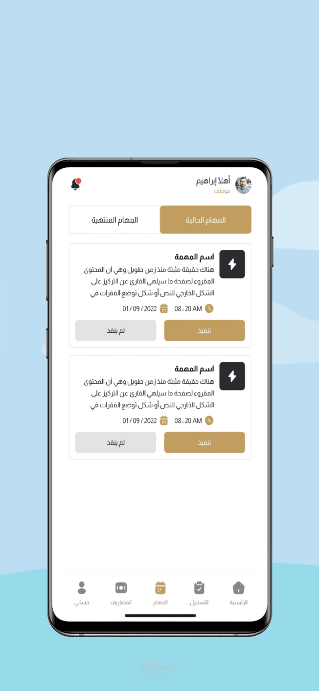 - المهام الموكلة له من قبل المدير و تفاصيلها مع إمكانية تحديدها كـ"تم تنفيذه".