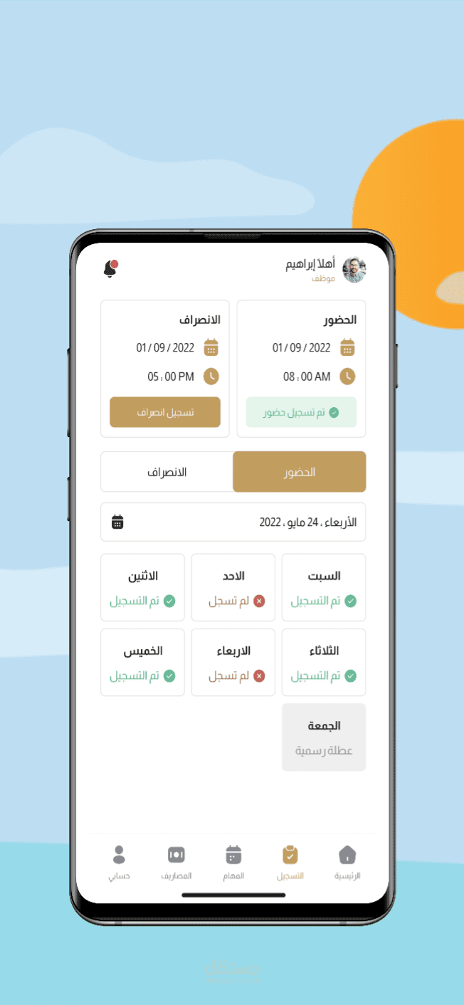 - تسجيل الحضور و الإنصراف عن طريق تواجده في نطاق الموقع المحدد من المدير عن طريق خرائط جوجل.