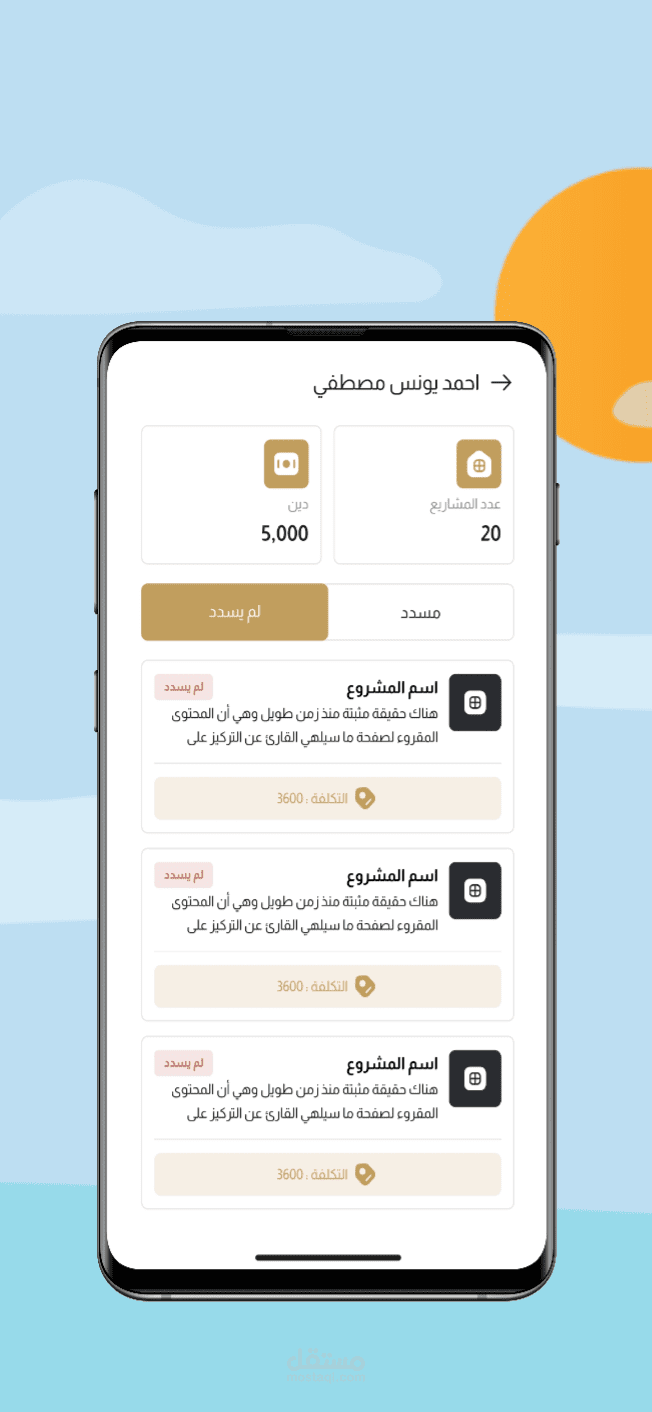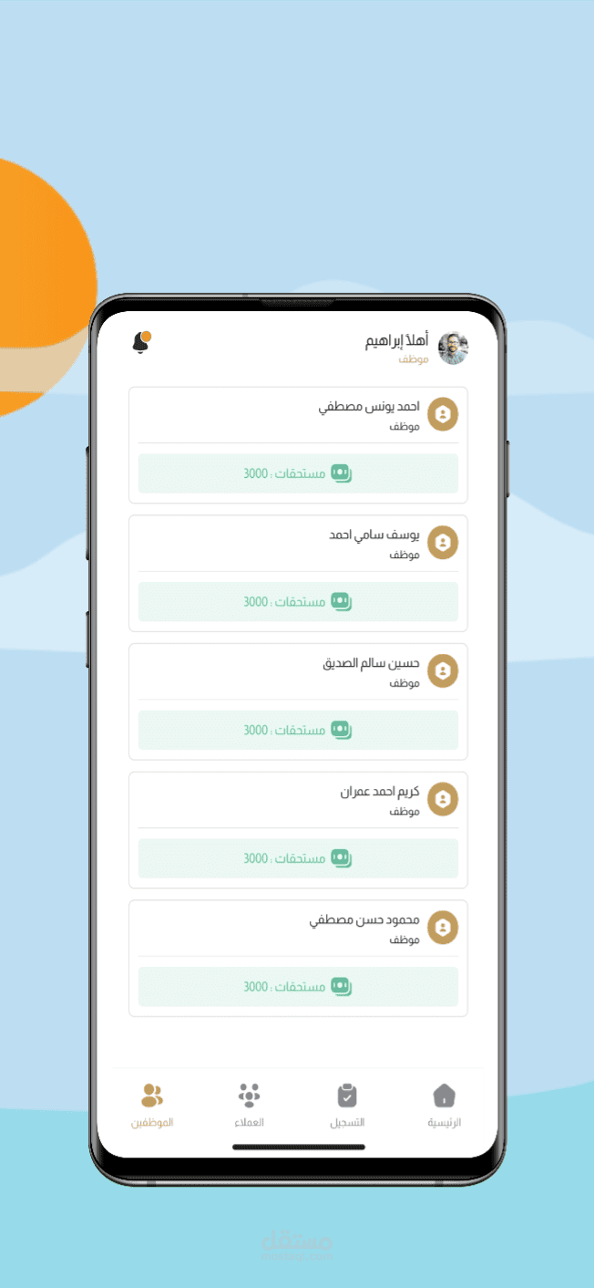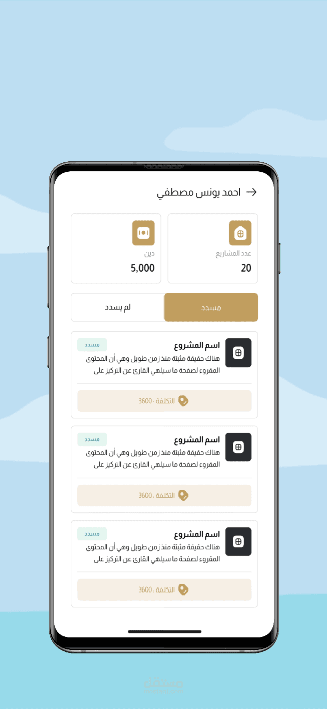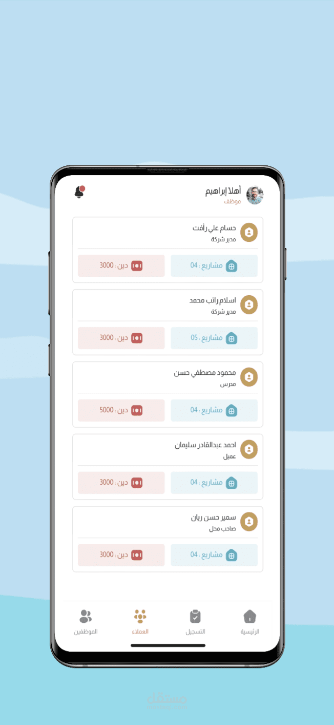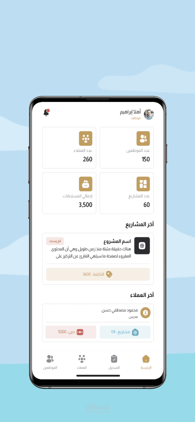 - معرفة عدد العملاء لديه وعدد المشاريع التي تم إستلامها و إجمالي المستحقات.
