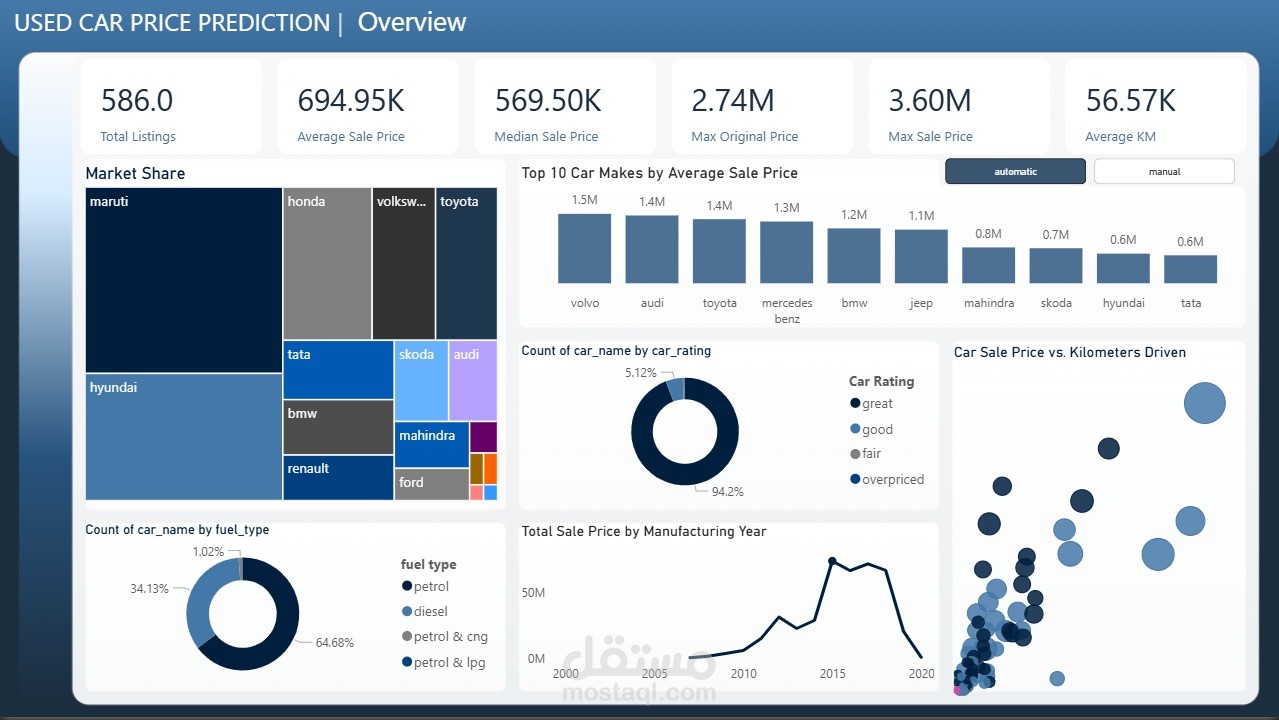 Used Car Price Prediction — an interactive Power BI dashboard that explores the key factors influencing used car prices. It delivers clear visuals and insightful comparisons to help users understand pricing trends and market dynamics.