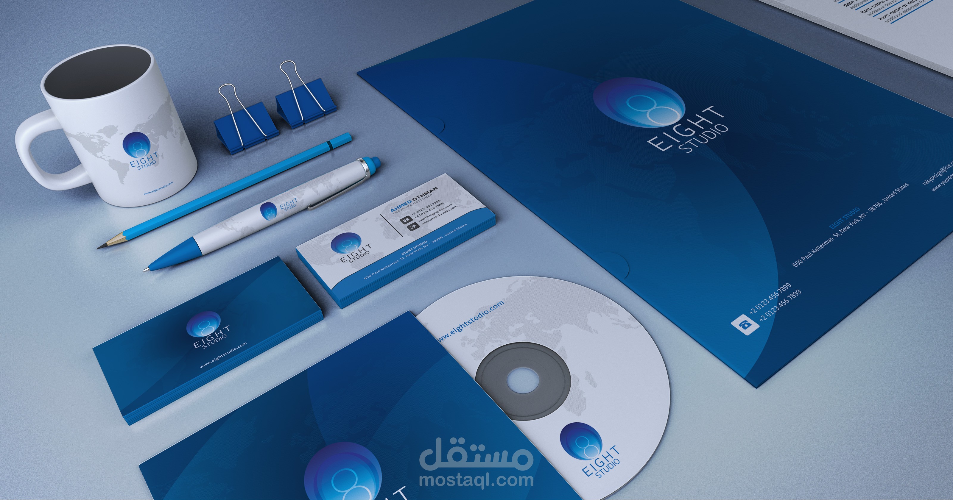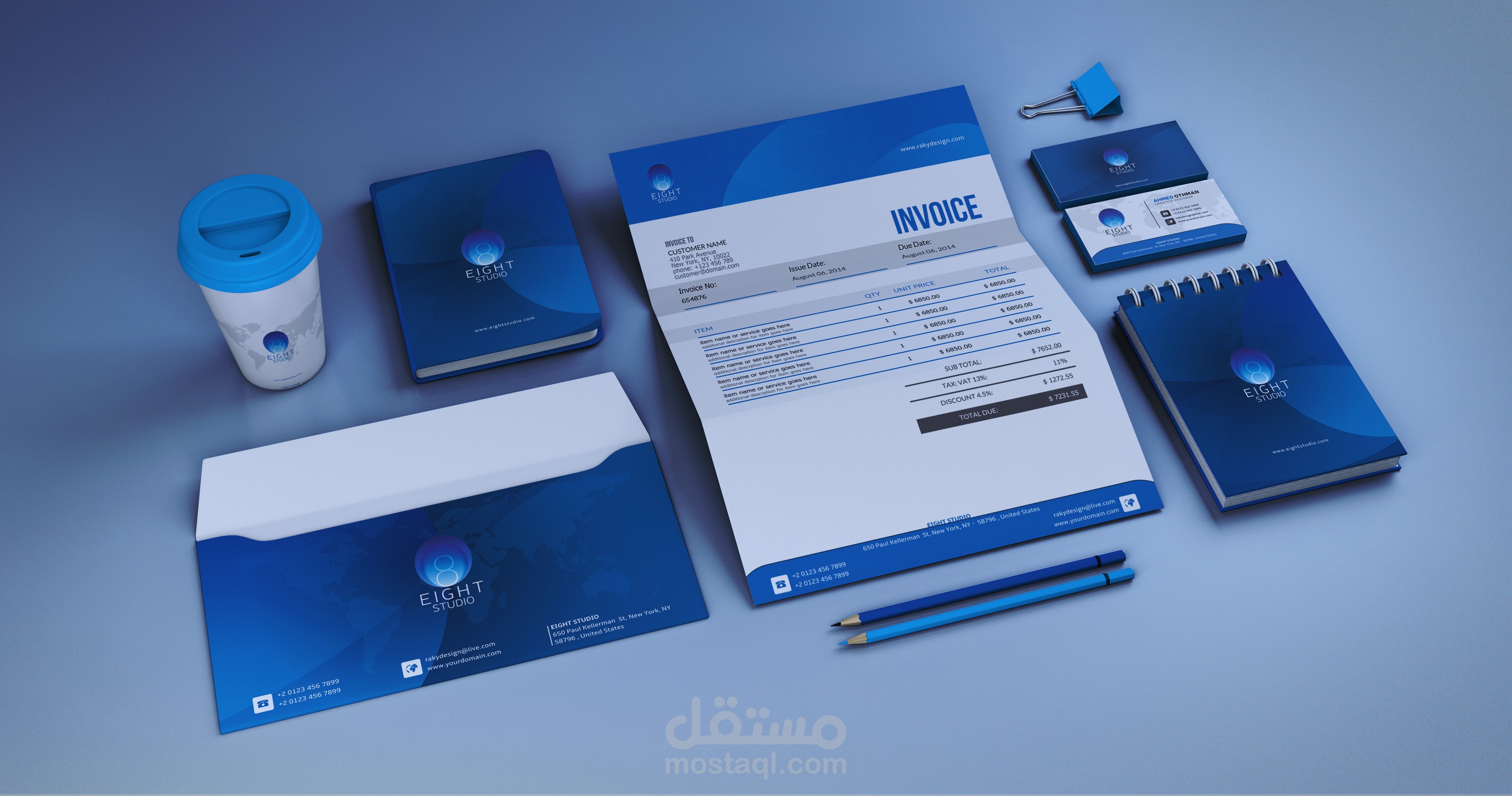 هوية شركة كاملة من بيزنس كارد واوراق مراسلات واظرف مراسلات و حافظة اوراق واغلفة سي دي و فاتورة وغيرها