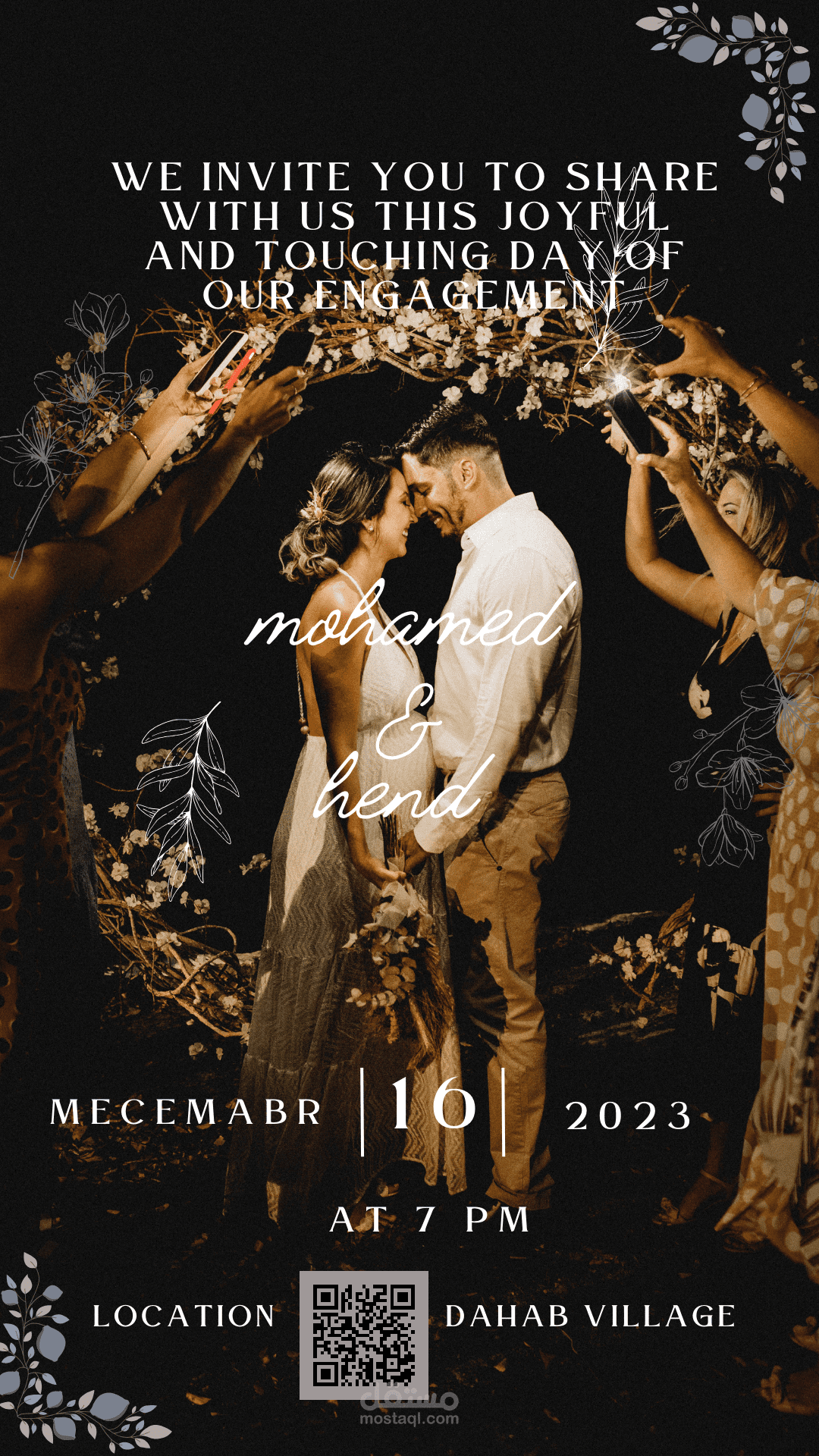 في مقدمة الكرت، يبرز اسم الزوجين بأناقة فائقة باستخدام خطوط جميلة وزخارف فنية تضفي على الكرت هوية فريدة. يتوسط الكرت صورة رمزية للثنائي السعيد، ربما في لحظة رومانسية من خطوبتهما أو في إطار جميل يجسد حبهما مثل فديوه او صور .