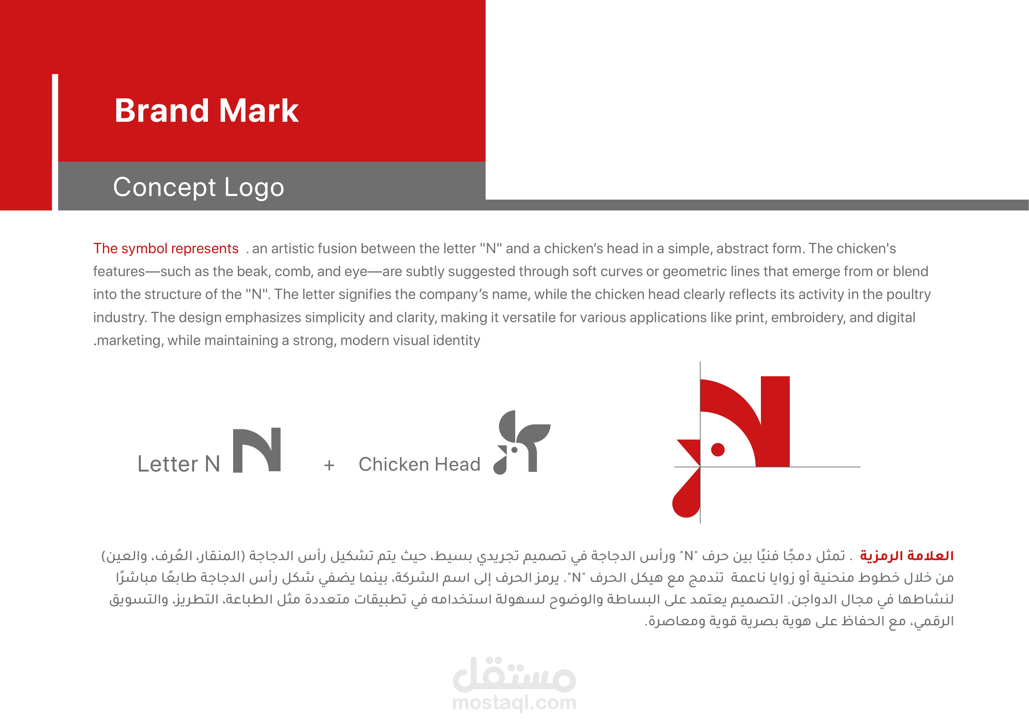 العلامة الرمزية . تمثل دمجًا فنيًا بين حرف "N" ورأس الدجاجة في تصميم تجريدي بسيط، حيث يتم تشكيل رأس الدجاجة (المنقار، العُرف، والعين) من خلال خطوط منحنية أو زوايا ناعمة تندمج مع هيكل الحرف "N". يرمز الحرف إلى اسم الشركة، بينما يضفي شكل رأس الدجاجة طابعًا مباشرًا لنشاطها في مجال الدواجن. التصميم يعتمد على البساطة والوضوح لسهولة استخدامه في تطبيقات متعددة مثل الطباعة، التطريز، والتسويق الرقمي، مع الحفاظ على هوية بصرية قوية ومعاصرة.