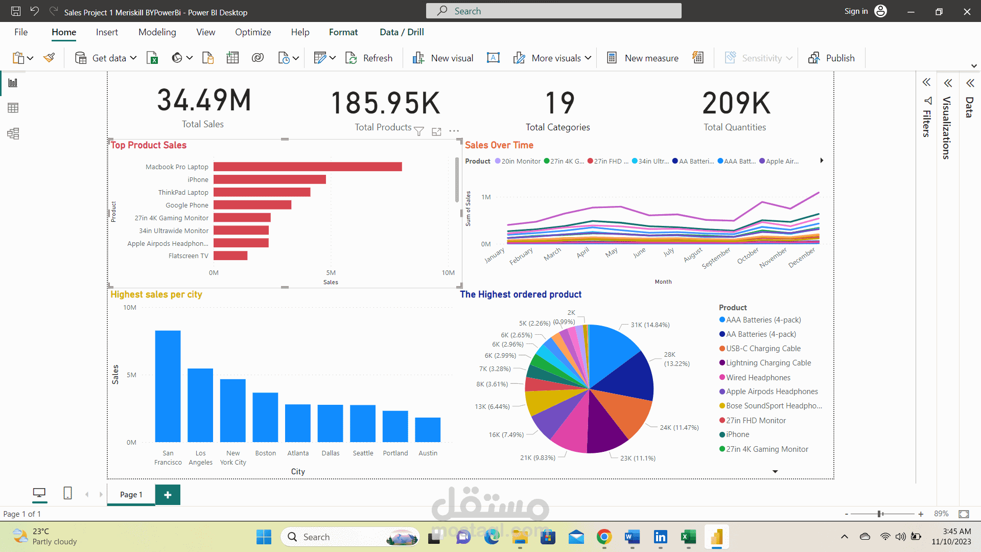 لقد قمت بتحليل البيانات المبيعات علي البرنامج و انشاء تقرير تفاعلي وابراز اهم النقاط الرئيسيه للمبيعات