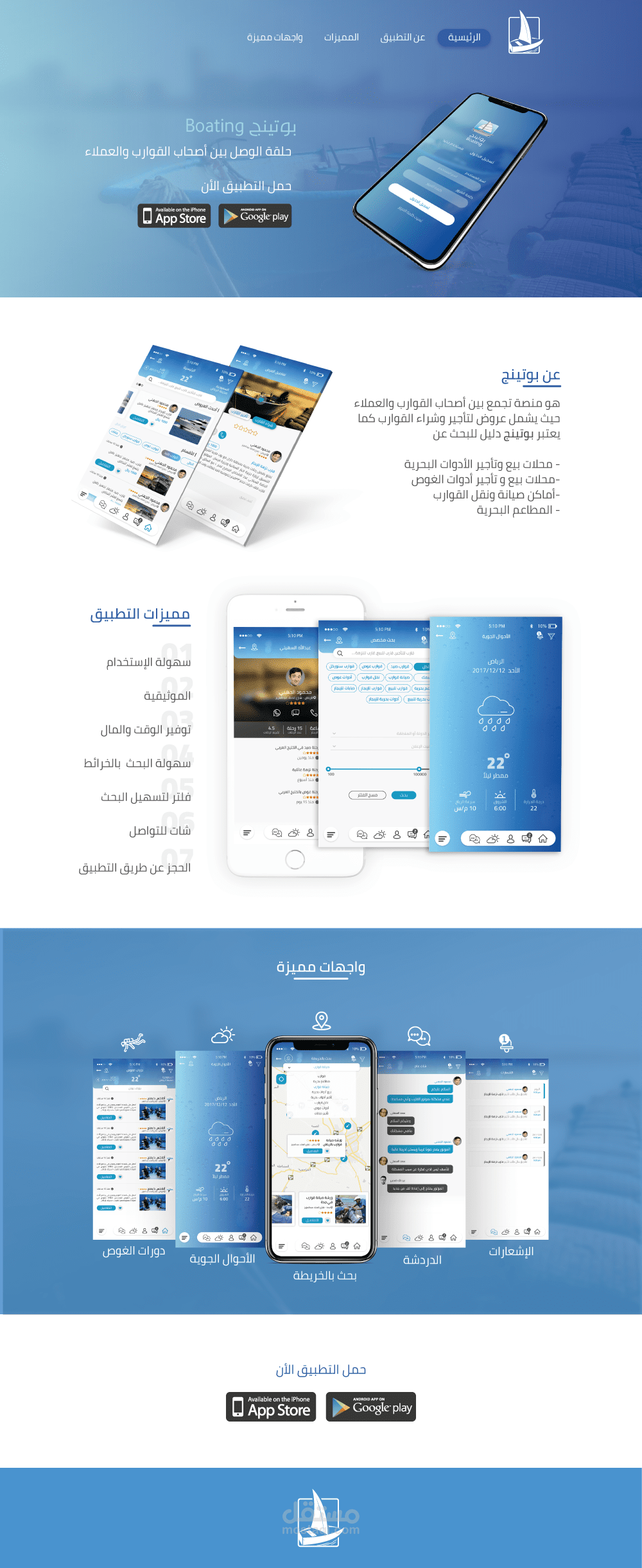 تصميم صفحة تسويقية لتطبيق (boating) وهو تطبيق متخصص في تأجير وبيع القوارب والارحلات البحرية .. الخ