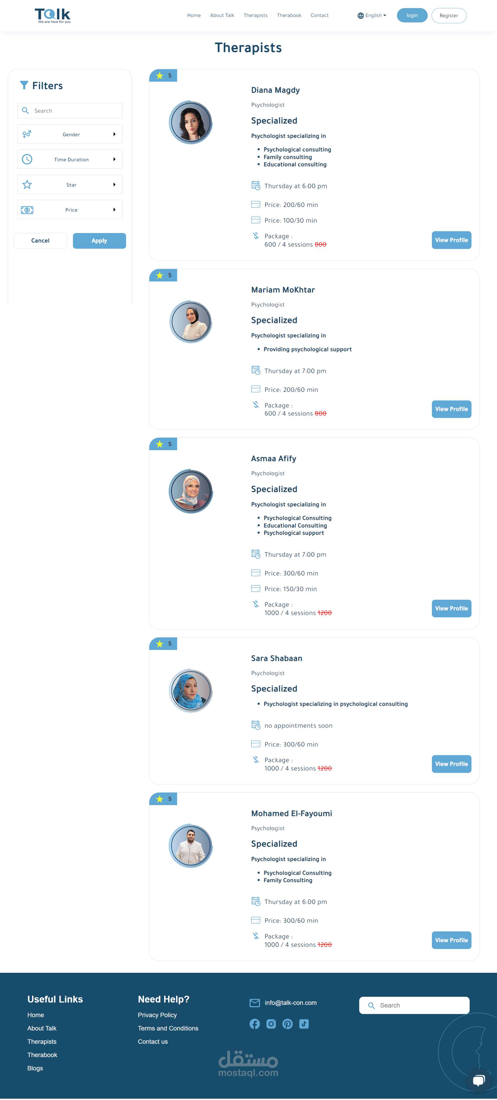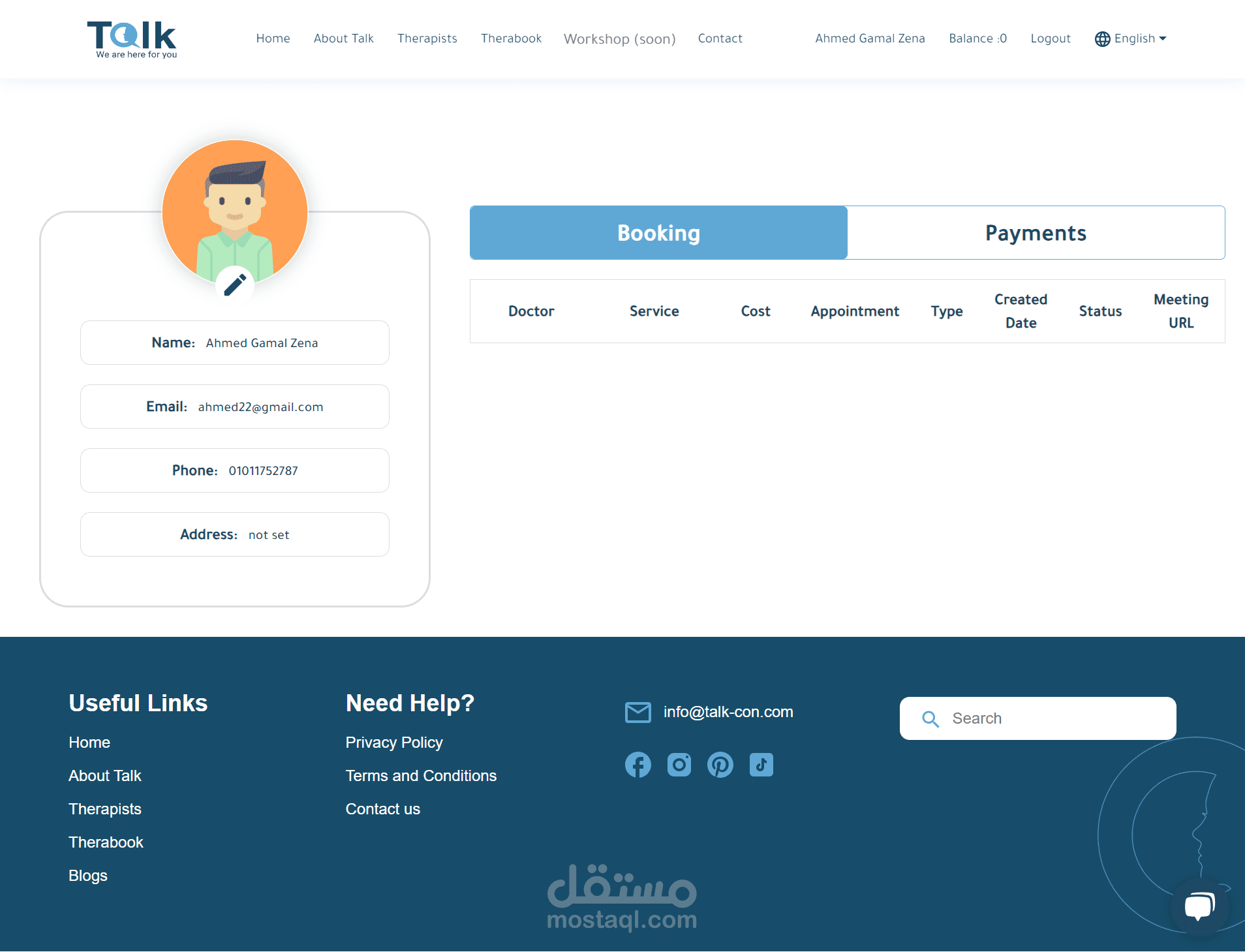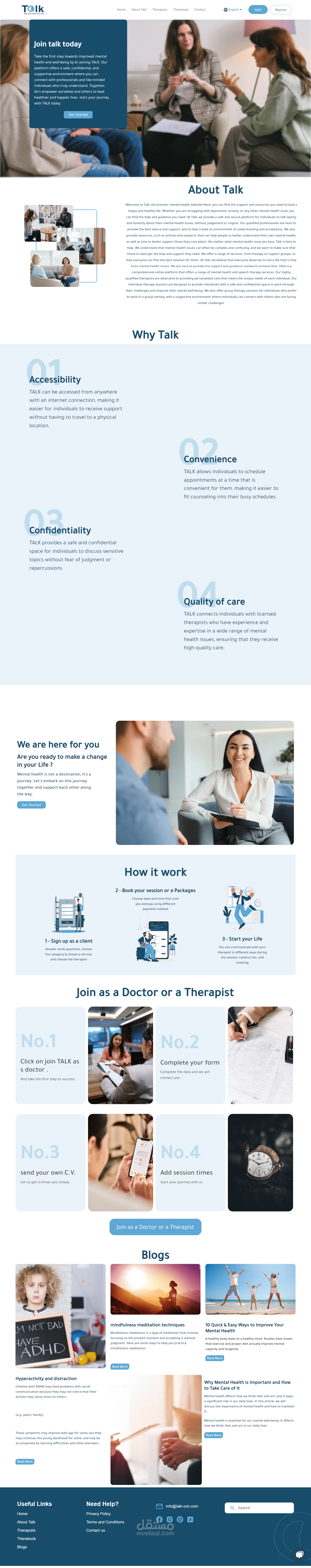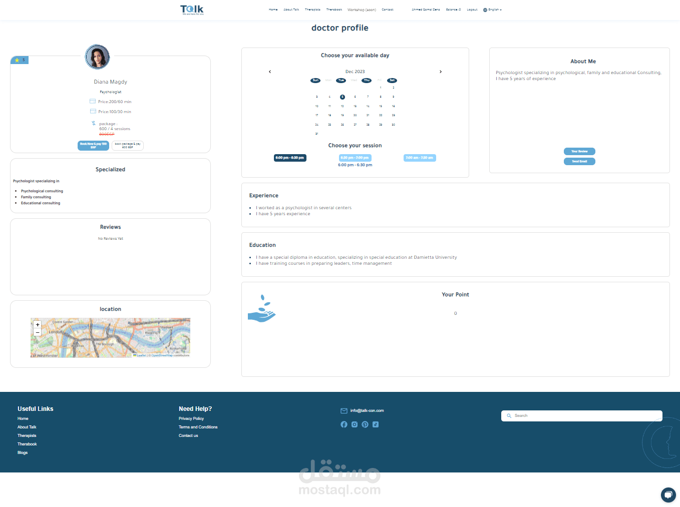 منصة Talk للعلاج النفسي عبر الإنترنت، لربط المعالجين والمرضى. الموقع يضم ١٠ صفحات رئيسية، بما في ذلك تسجيل الدخول، الصفحة الرئيسية، وصفحة حجز المعالج. استخدمت تقنيات React.js وCSS لتصميم متجاوب وتجربة مستخدم جذابة. دمجت خرائط وأنظمة دفع آمنة لتسهيل الاستخدام. هذا المشروع يجمع بين التصميم التفاعلي والتكنولوجيا لتحسين الرعاية النفسية.