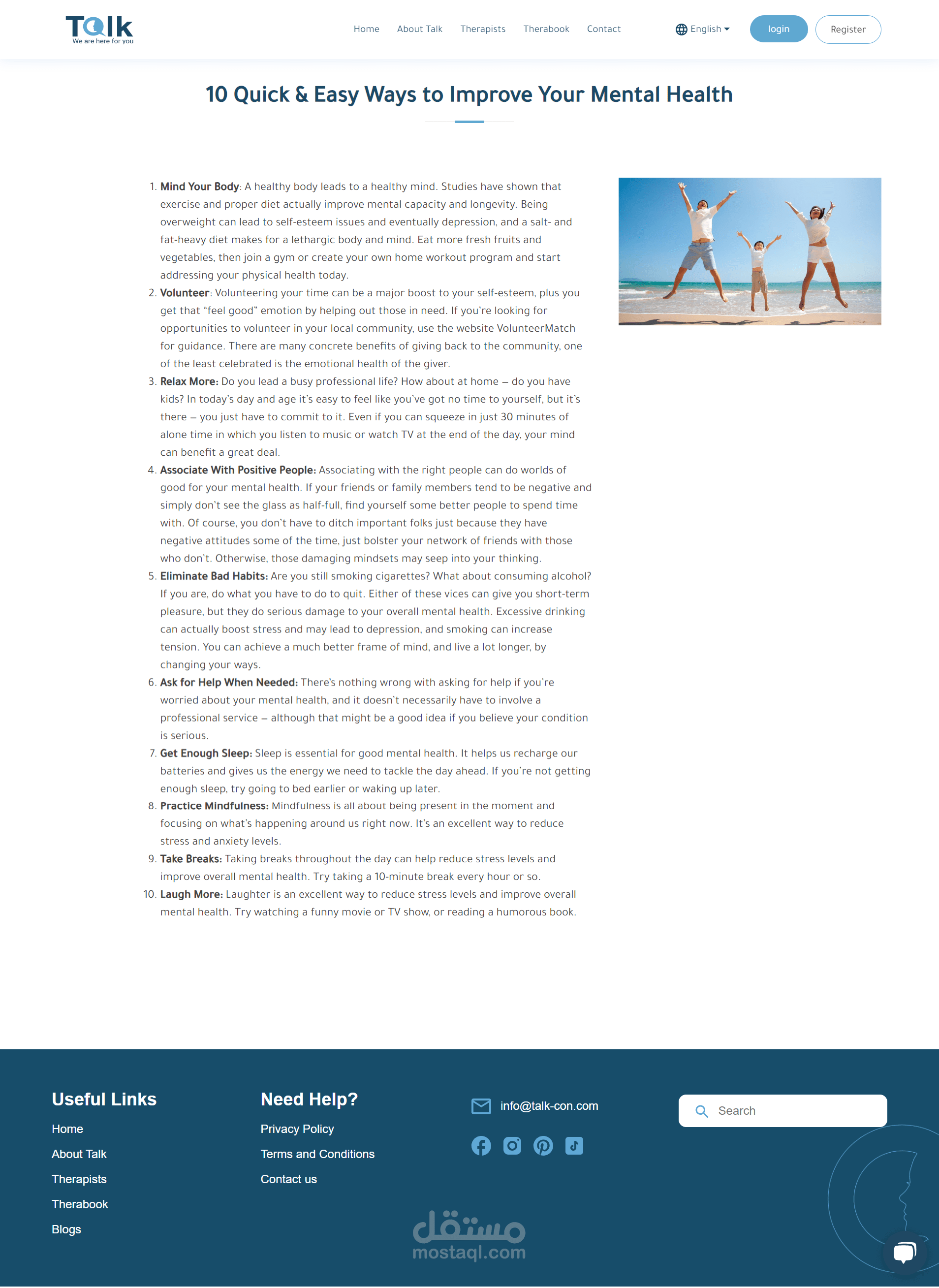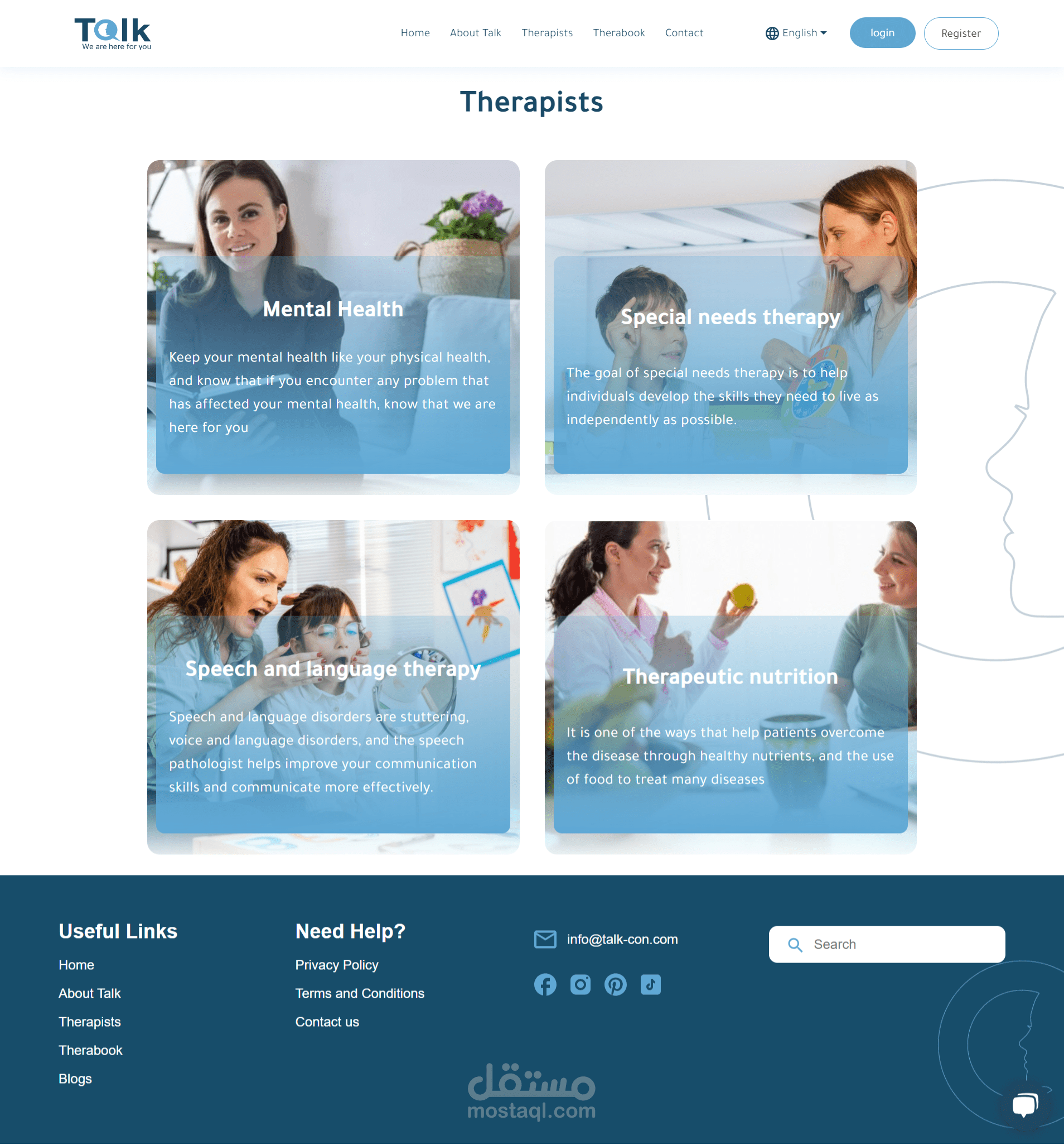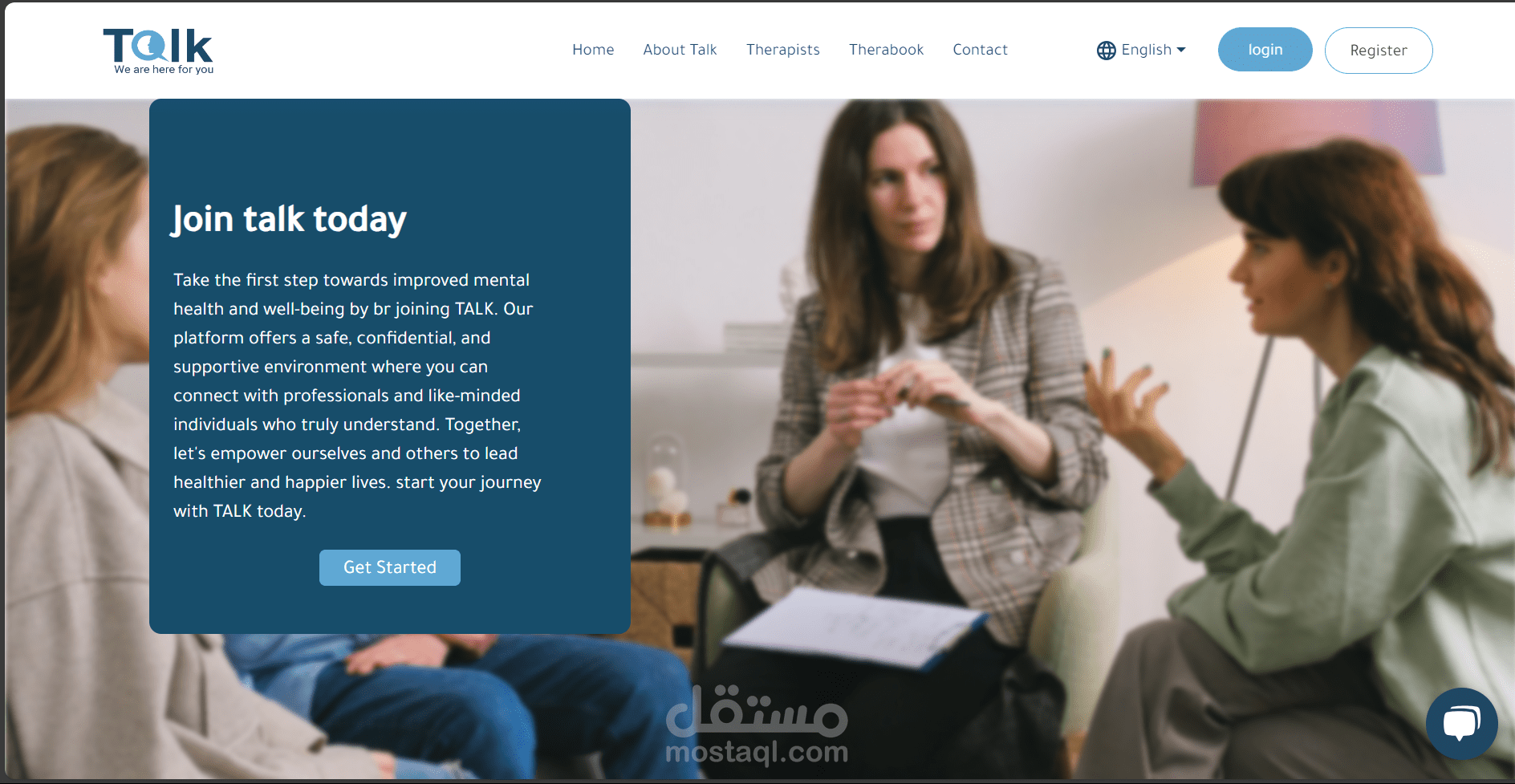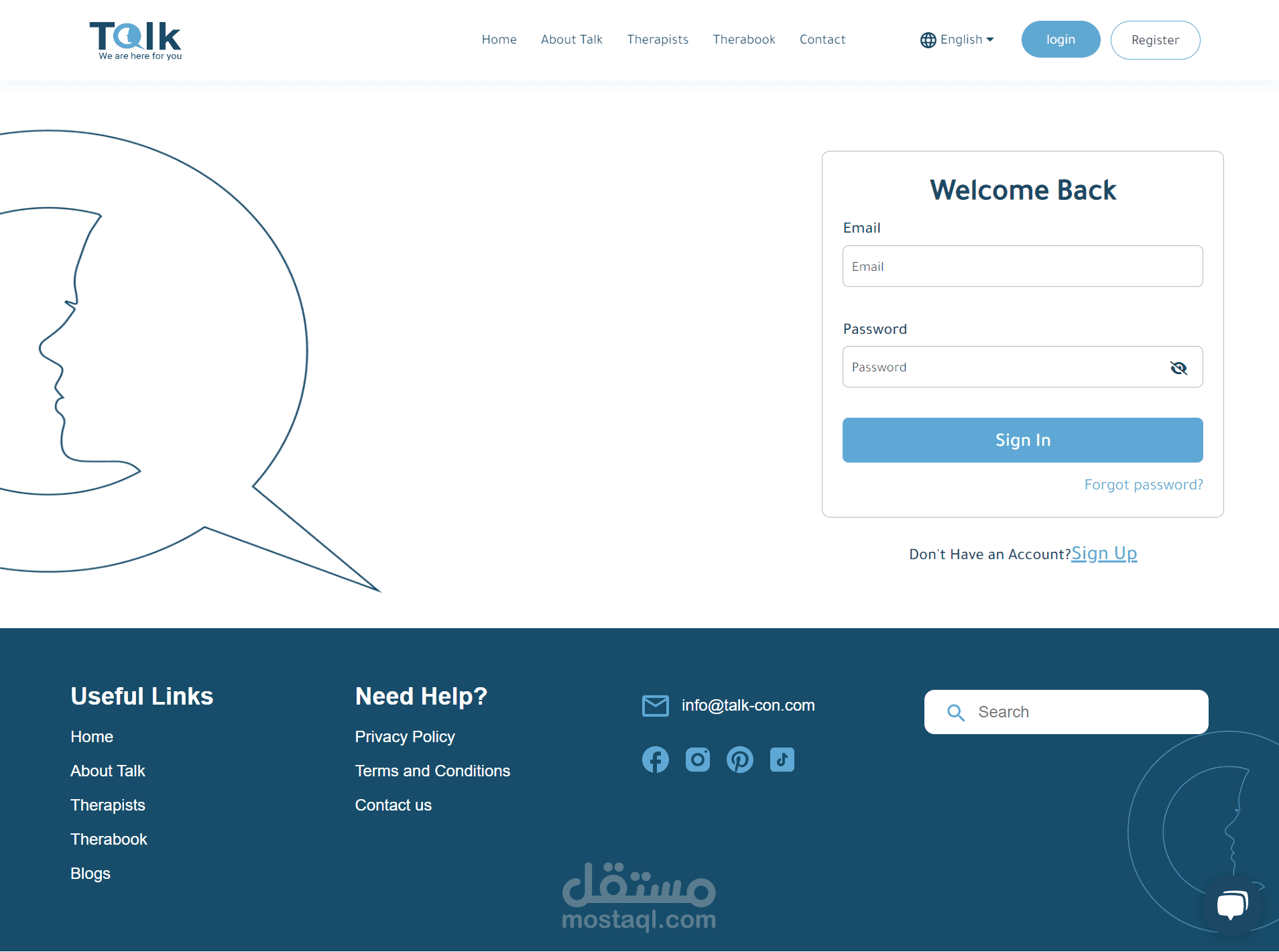 منصة Talk للعلاج النفسي عبر الإنترنت، لربط المعالجين والمرضى. الموقع يضم ١٠ صفحات رئيسية، بما في ذلك تسجيل الدخول، الصفحة الرئيسية، وصفحة حجز المعالج. استخدمت تقنيات React.js وCSS لتصميم متجاوب وتجربة مستخدم جذابة. دمجت خرائط وأنظمة دفع آمنة لتسهيل الاستخدام. هذا المشروع يجمع بين التصميم التفاعلي والتكنولوجيا لتحسين الرعاية النفسية.