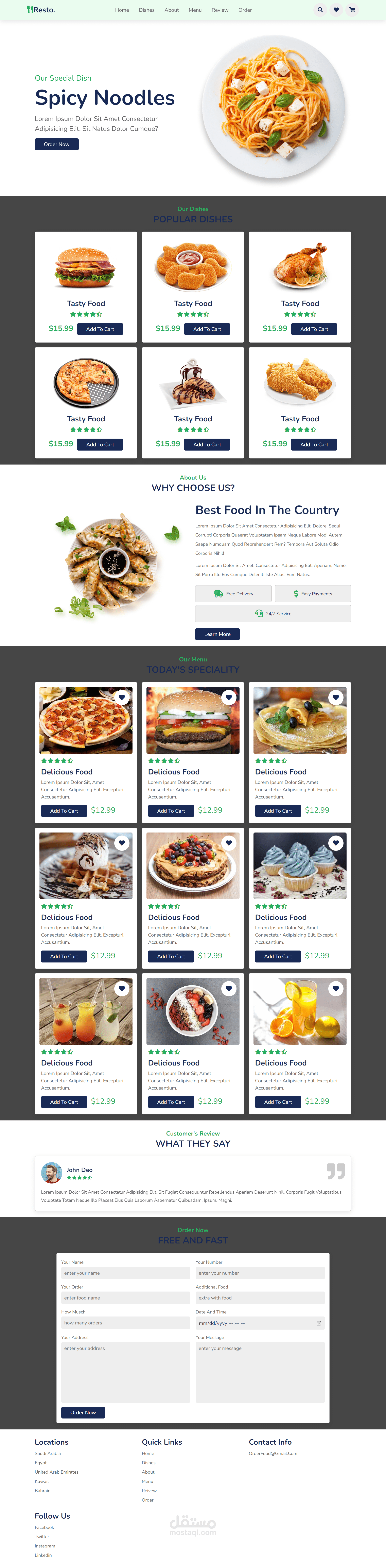 موقع لمطعم يقدم الطعام، ويتميز بتصميم متجاوب. يحتوي الموقع على أقسام مثل "الأطباق"، "معلومات عنا"، "القائمة"، "التقييمات"، و"اطلب الآن". يعرض الموقع تشكيلة متنوعة من الأطباق، بما في ذلك طبق خاص يسمى "النودلز الحارة". يشمل الموقع أيضًا قسم "عن المطعم" الذي يناقش أسباب اختيار هذا المطعم مثل جودة الطعام، خدمة التوصيل المجانية، سهولة الدفع، وخدمة على مدار الساعة. كما يحتوي على قائمة بأطباق اليوم، تقييمات العملاء، معلومات الطلب، وتفاصيل الاتصال بما في ذلك روابط وسائل التواصل الاجتماعي.