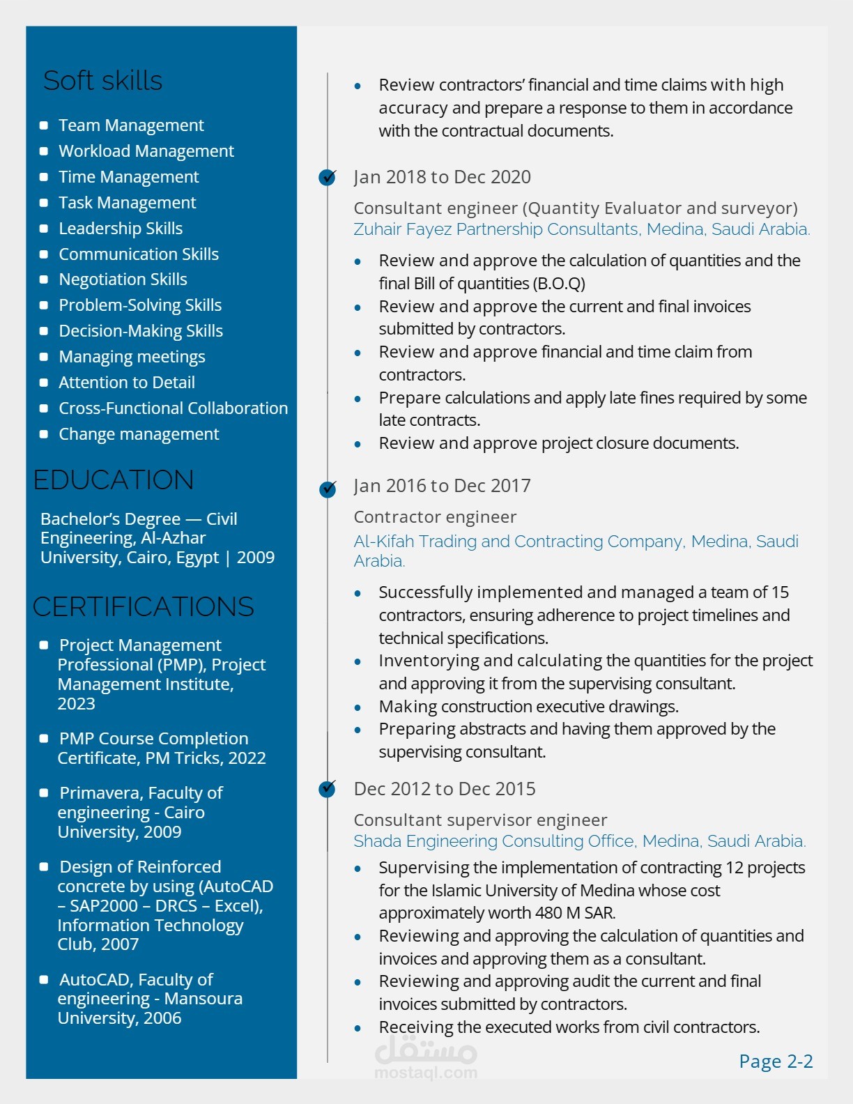 Consulting Project Manager with 15+ years of experience in construction. Consistent success as an Assistant project manager or major government projects valued at more than 300 million SAR.