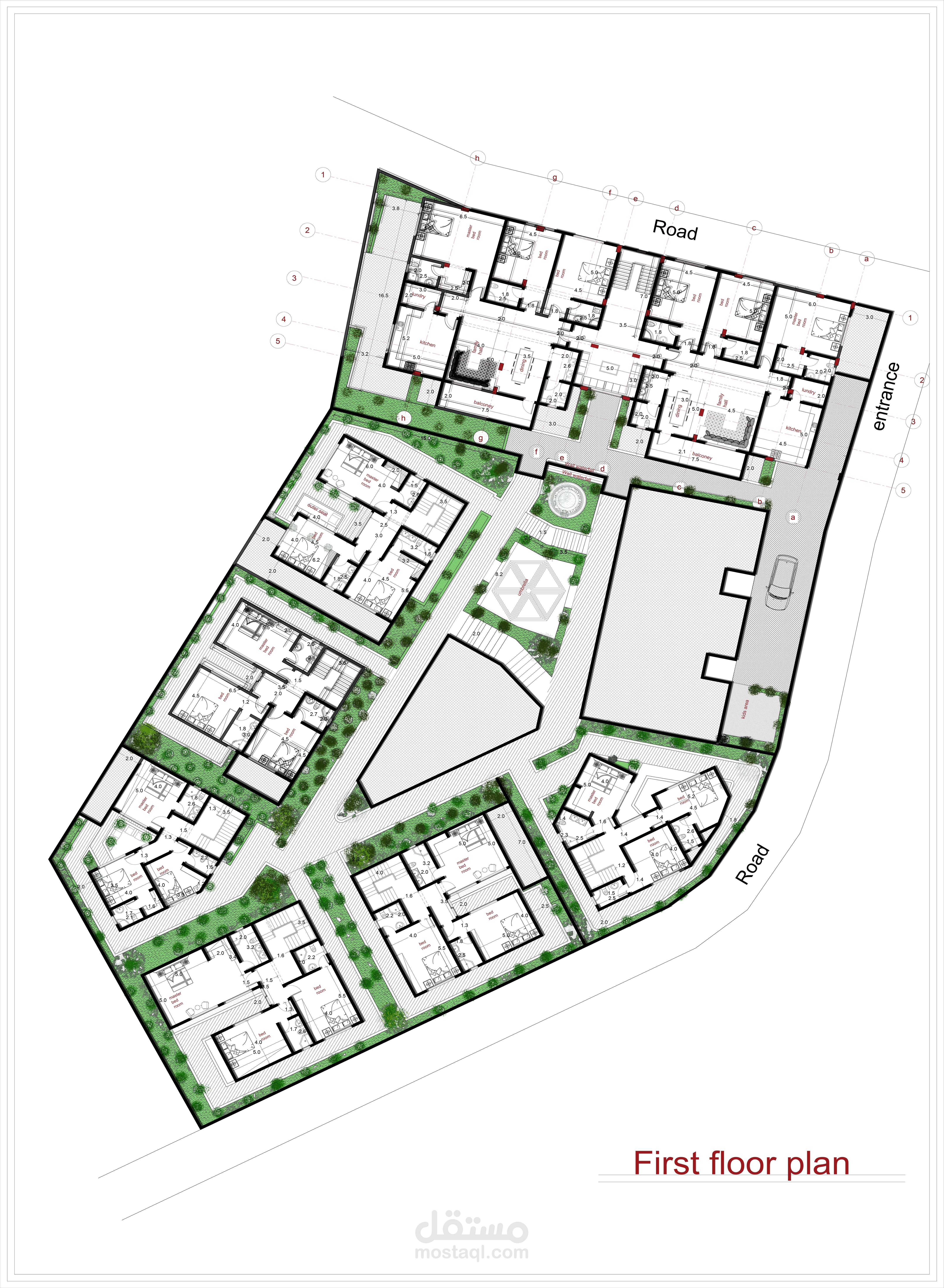 تصميم مجمع سكنى فلل مكون من (مبنى استقبال وجراجات ومجموعة من الفلل مع وجود منطقة ترفيهية مشتركة بين الفلل ) والدور الاول عباة عن شقق سكنية اعلى الجراجات