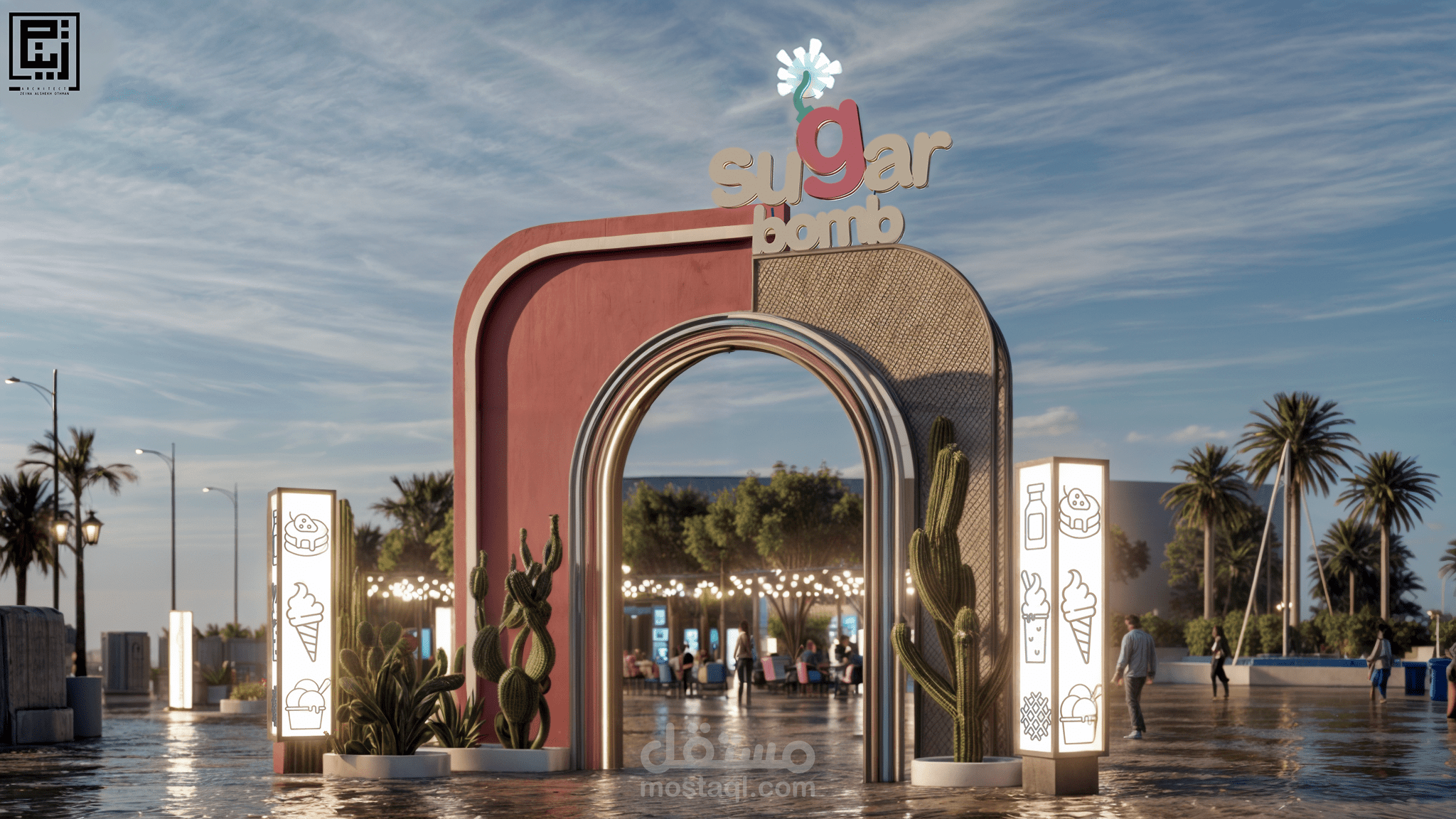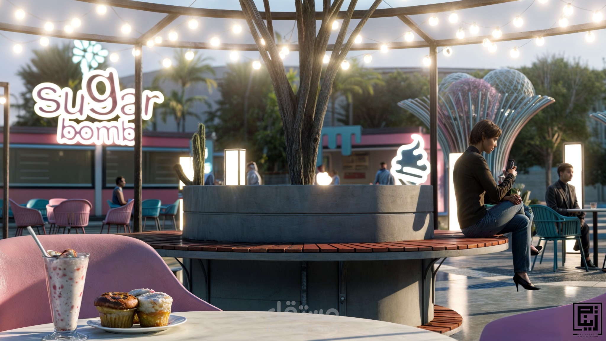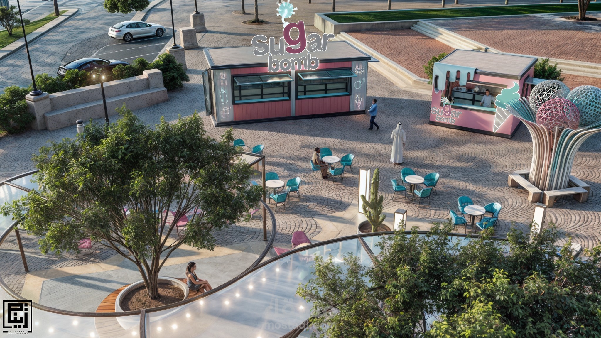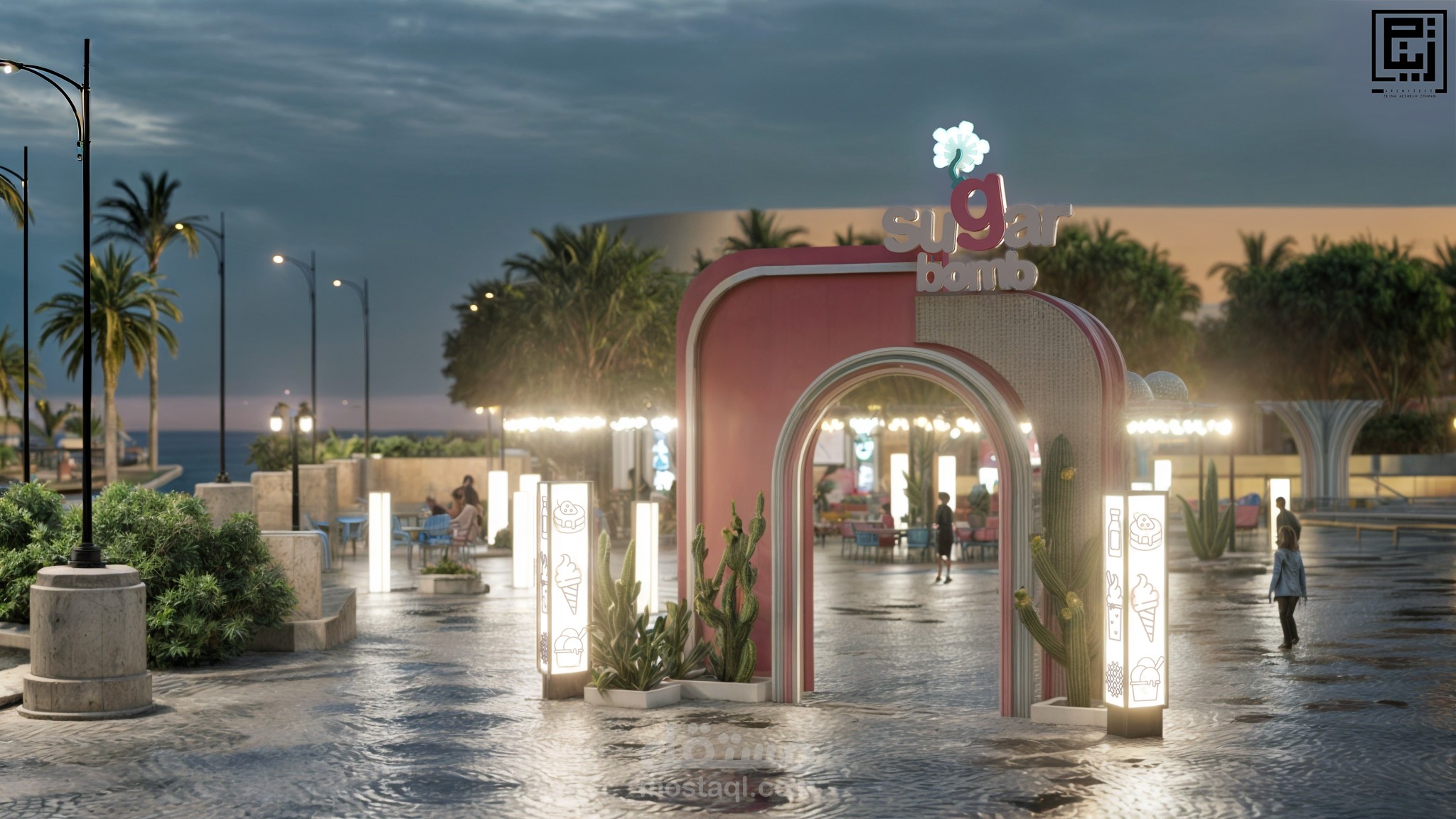 تم الاستفاده من العناصر الموجوده ضمن الموقع مثل البحره واماكن الجلوس واضافه مظله وجلسات خارجيه