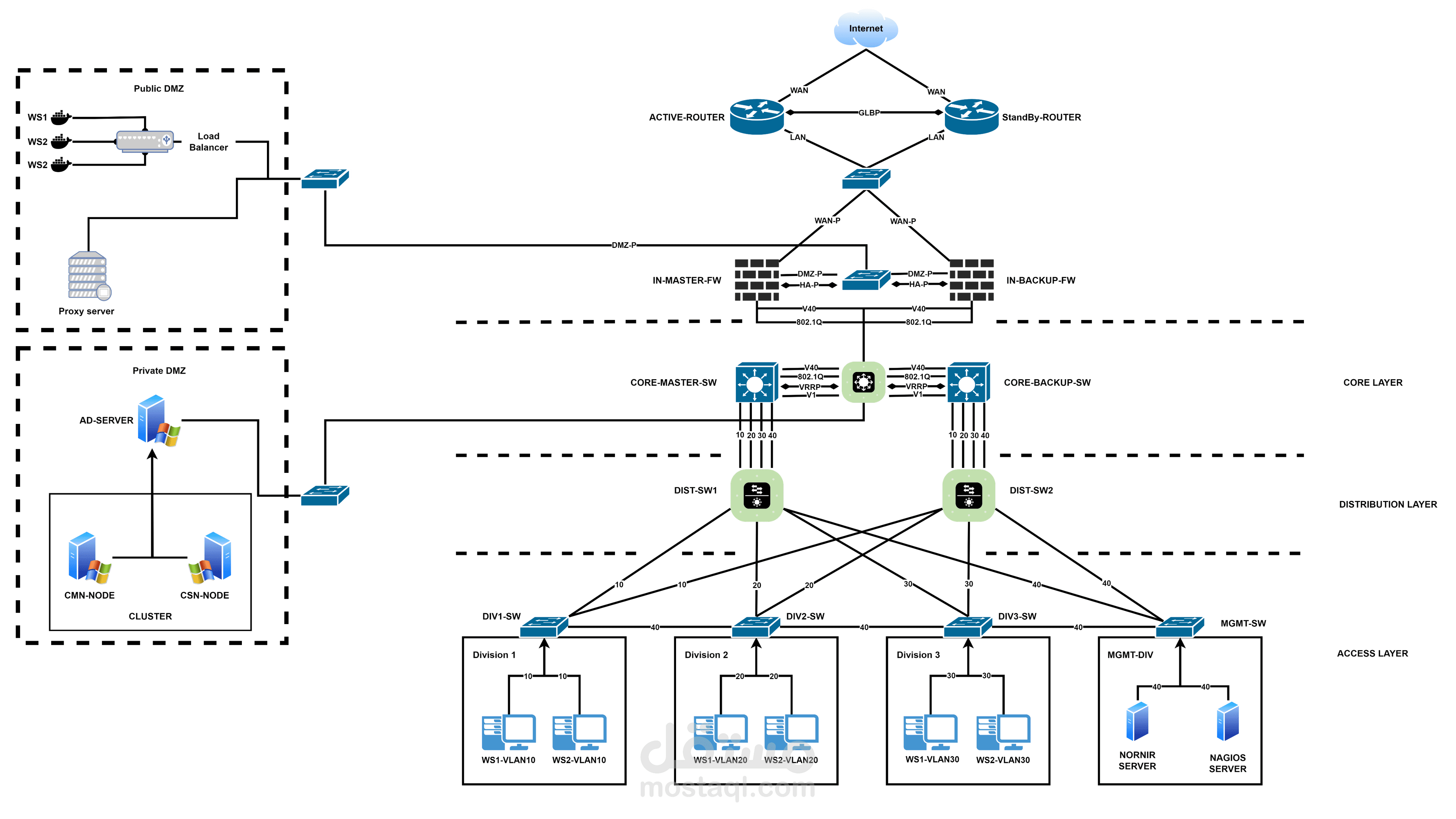 In this project, I've built a robust high-availability infrastructure aimed at preventing any potential issues from impacting its operations. The strategy revolves around implementing redundancy, automation, and comprehensive device monitoring. The ultimate objective is to maximize uptime and ensure continuous availability of all components within the infrastructure.