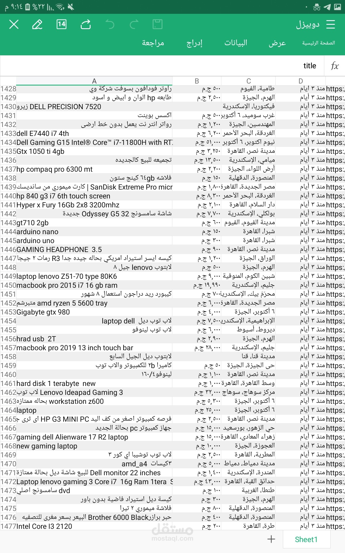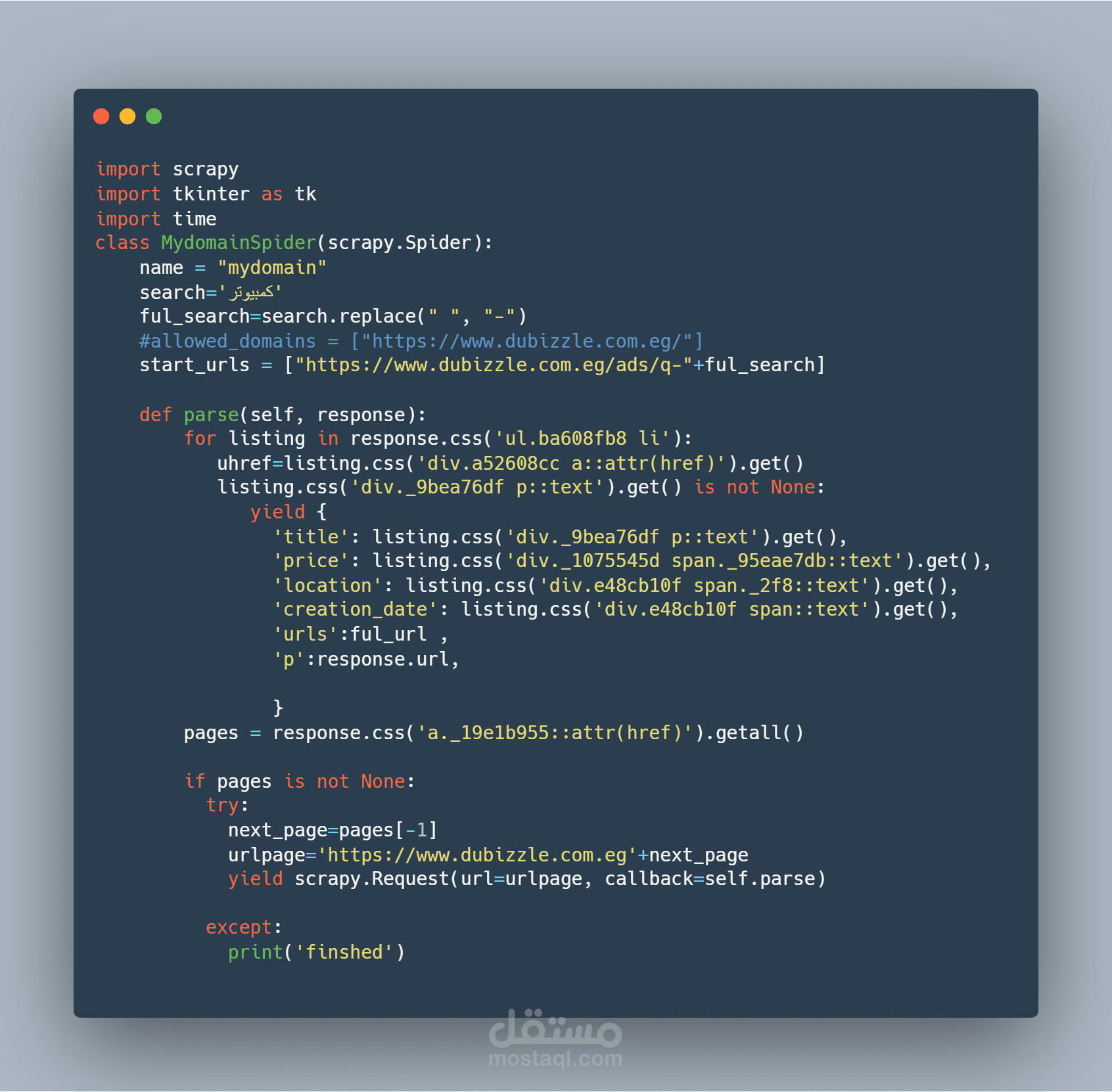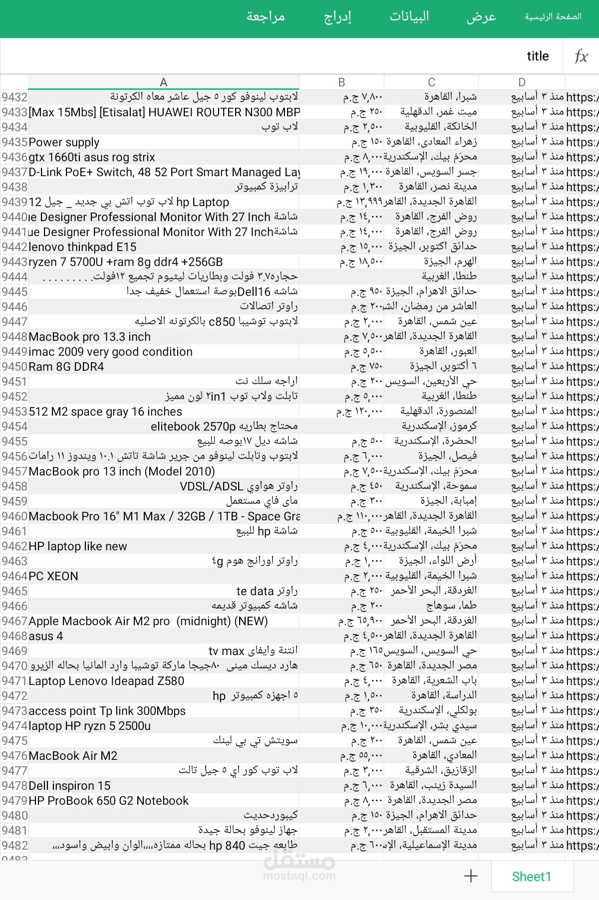 قمت بإنشاء سكربت بإستخدام لغة Python يقوم باستخراج آلاف البيانات من موقع "دوبيزل doubbizle" خلال دقائق مثل الاسم والعنوان والسعر الخاص بالإعلان فى ملف Excel ، تم استخراج 9500 سطر من البيانات خلال دقائق