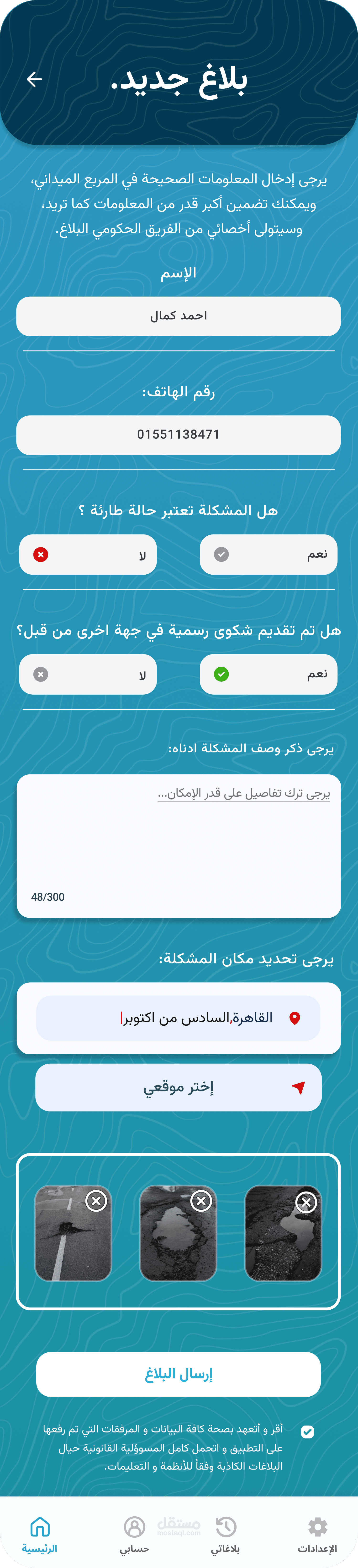 تفاعل اجتماعي: يتيح التطبيق للمستخدمين التفاعل مع بلاغات الآخرين، مما يعزز المشاركة المجتمعية في تحسين البنية التحتية.