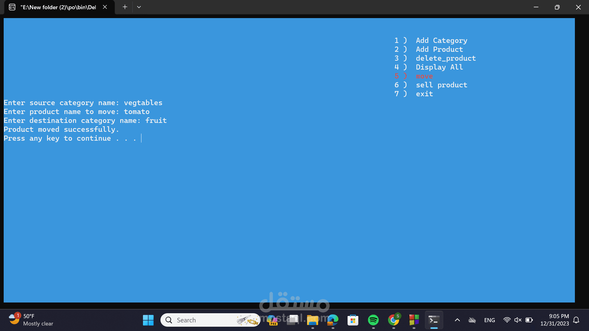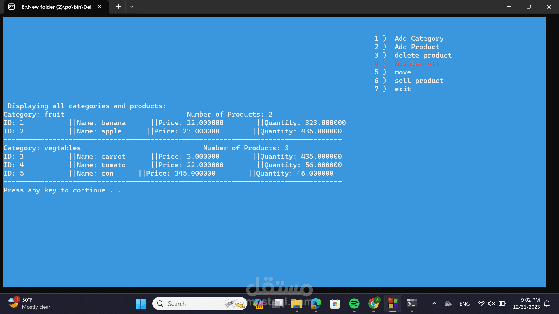 The provided C code implements a simple supermarket Management System. The system allows users to perform various operations such as adding categories, adding and deleting products within categories, displaying all categories and products, moving products between categories, selling products, and exiting the system. The program provides a console-based menu for user interaction.