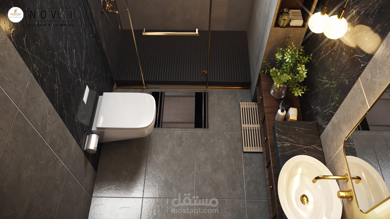 يتميز بتناغم الألوان المحايدة والإضاءة الطبيعية، مع استخدام السيراميك في الأرضيات والجدران لإضفاء لمسة من التألق بالإضافة إلى الغرانيت الصناعي والمرايا وأطقم الحمامات الفاخرة.