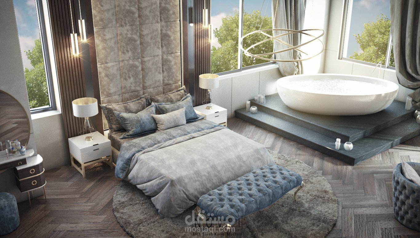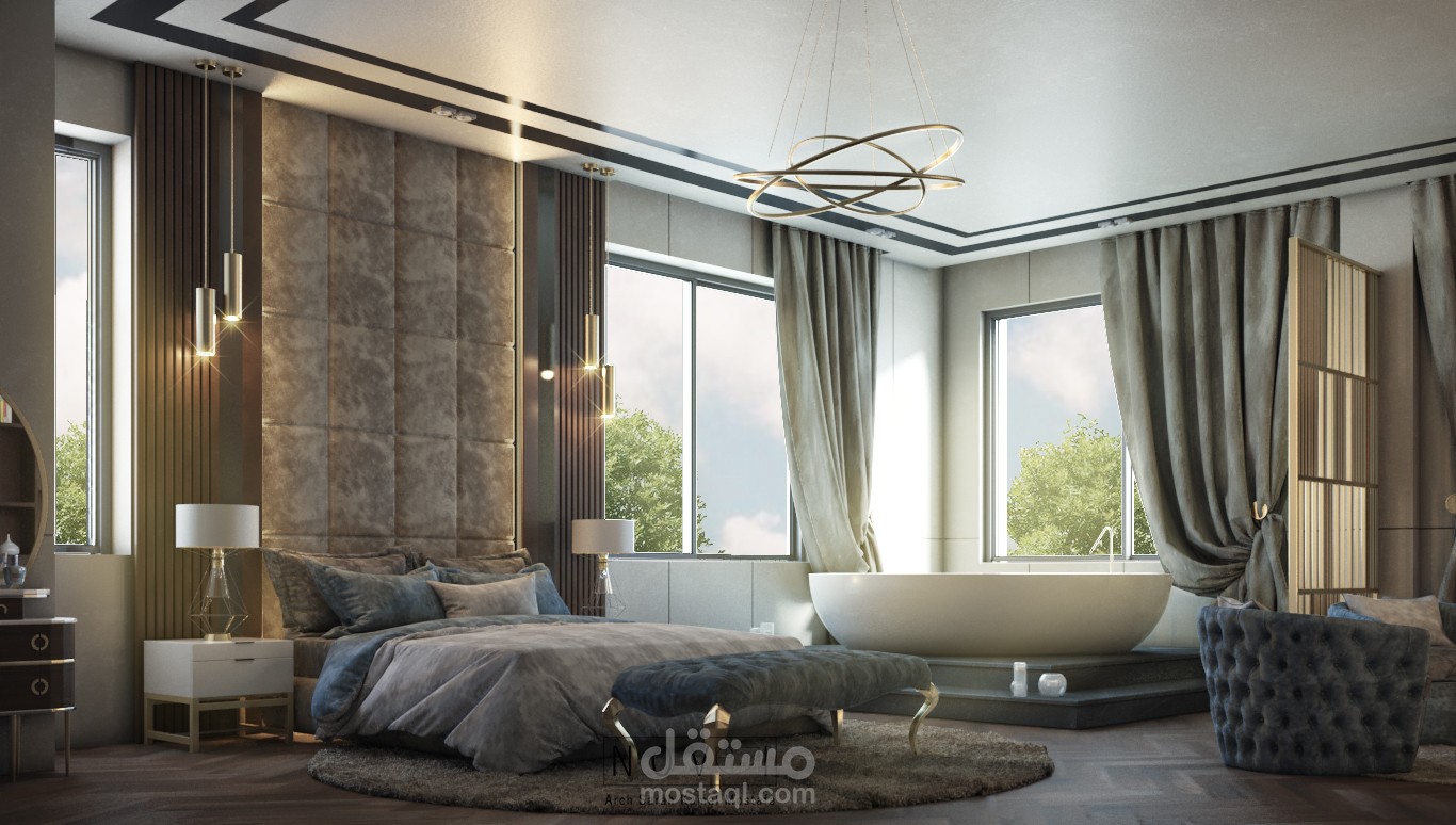 تصميم غرفة نوم فاخرة بأسلوب عصري يجسد الرفاهية والأناقة.