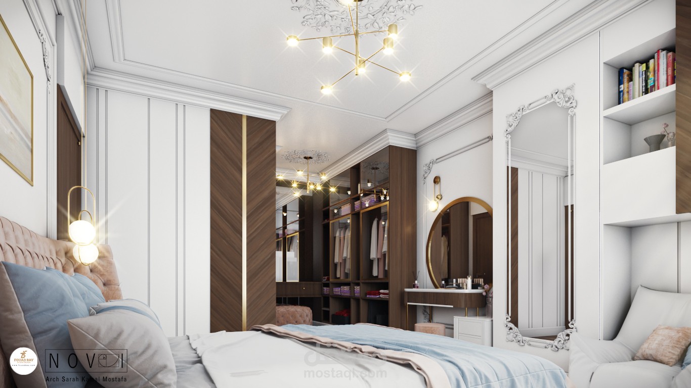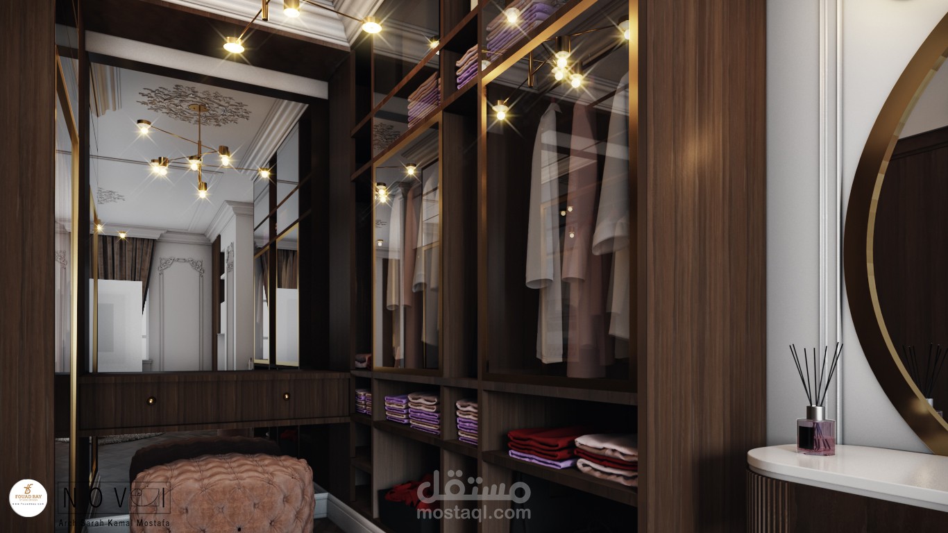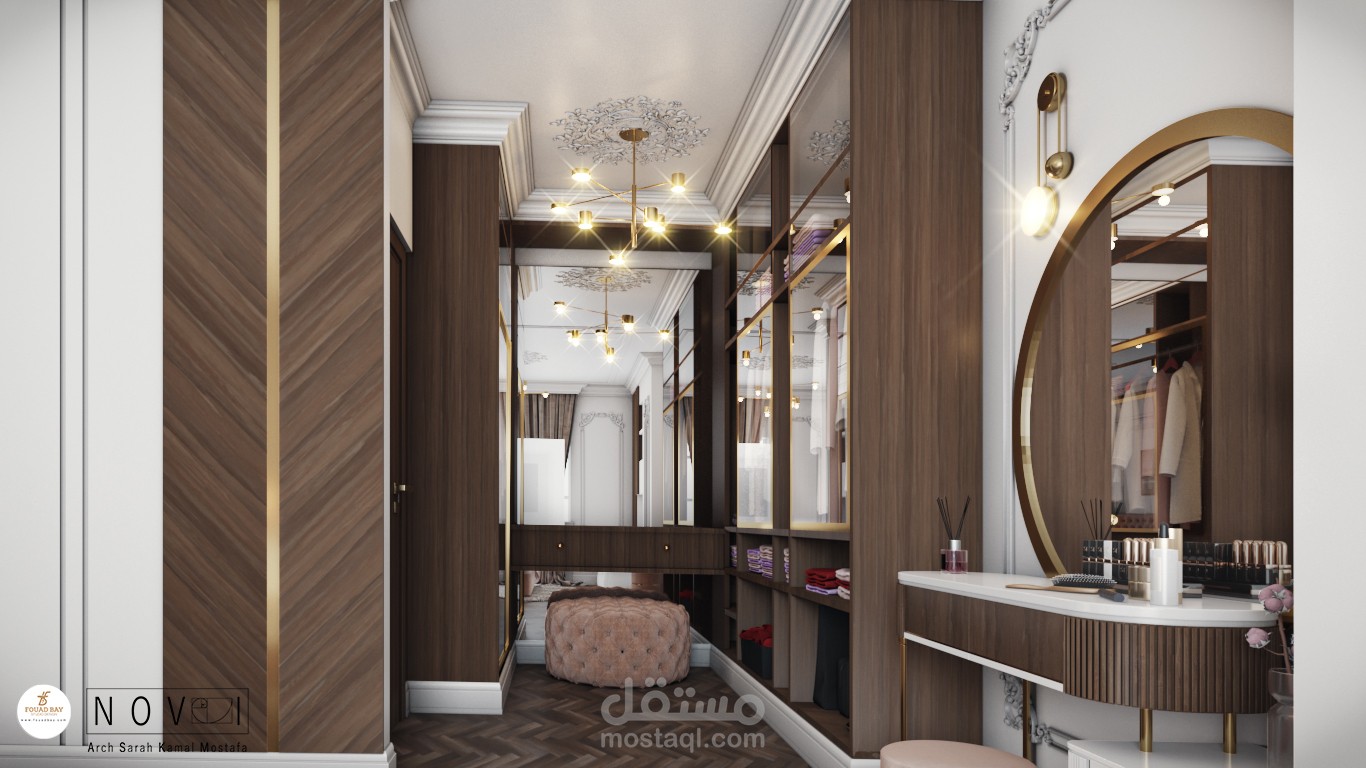 تصميم غرفة ملابس يجمع بين الأناقة والعملية، حيث يتميز بأثاث أنيق وتنظيم فائق. تفاصيل الخشب الفاخر والمرايا الكبيرة تخلق شعورًا بالوساعة والفخامة. تُضفي الإضاءة الدافئة لمسة من الدفء، والرفوف المفتوحة تسهم في عرض الملابس بشكل جمالي. تنظيم محكم للأحذية والاكسسوارات يجعل الغرفة عملية وأنيقة في الوقت ذاته، وتُضاف لمسات شخصية من خلال الألوان والتفاصيل الزخرفية لتكون غرفة ملابس تلبي احتياجات الاستخدام اليومي بأناقة فائقة.