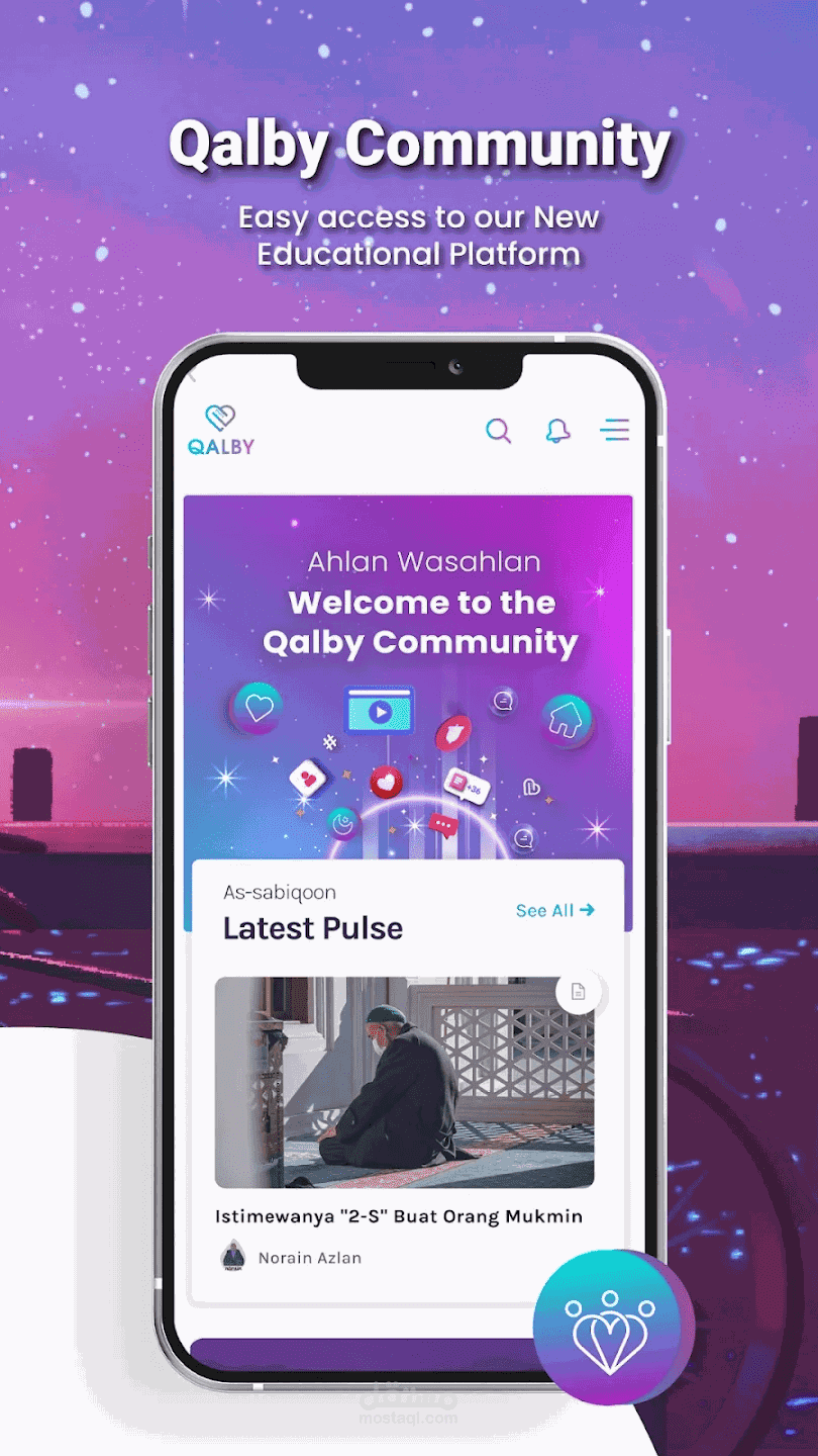 المجتمع: يتيح تطبيق QalbyApp للمستخدمين التواصل مع المجتمع الإسلامي الآخر وتبادل الخبرات والمعرفة.